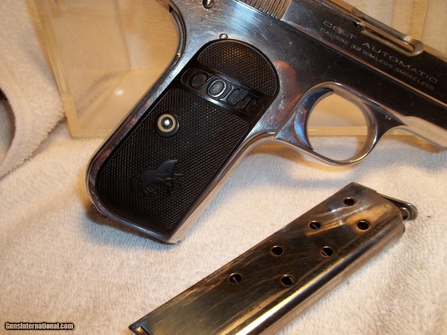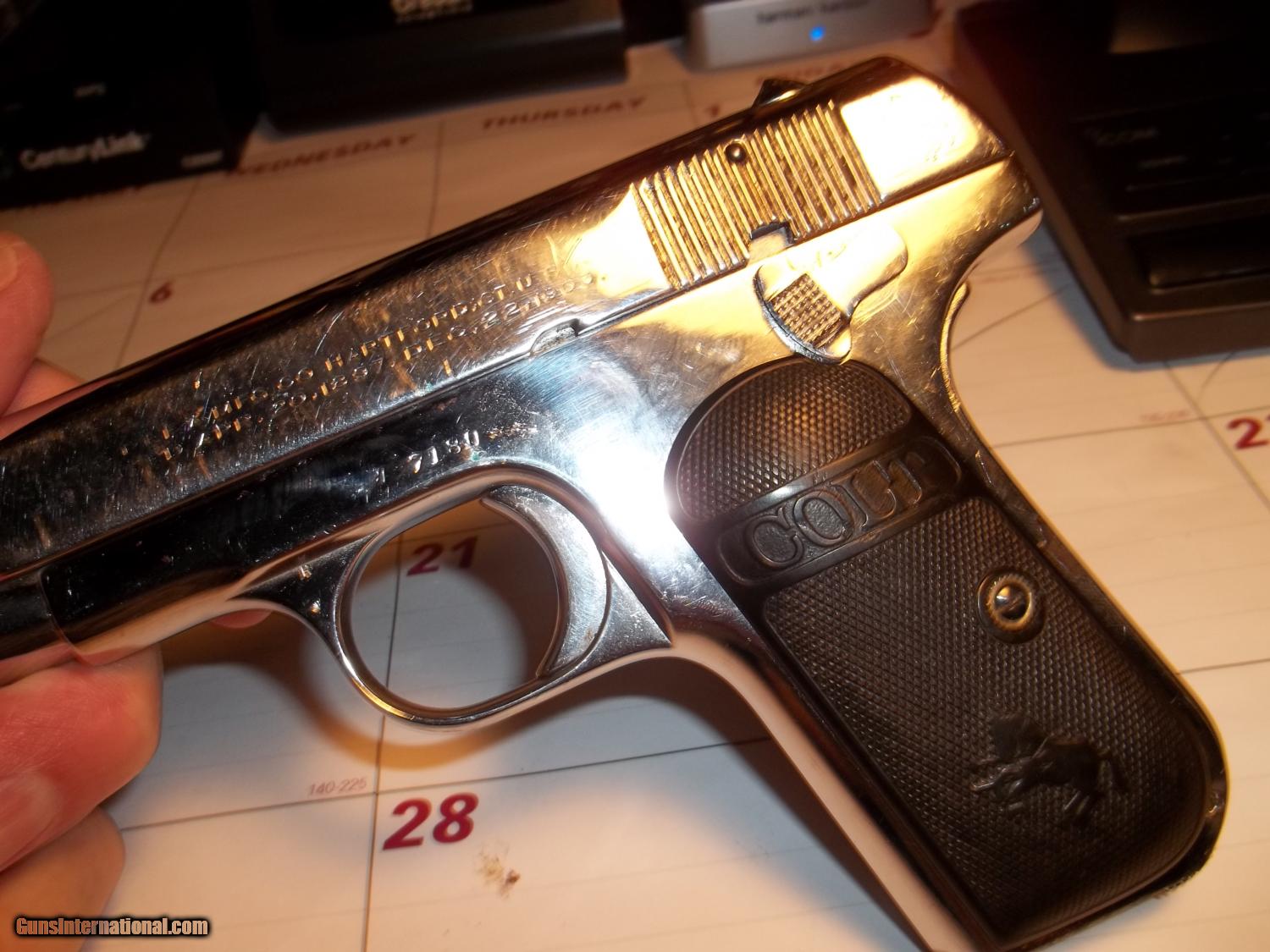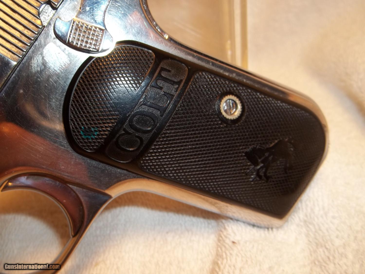 Description: Colt Model 1903 Pocket Hammerless Pistol...Type III....32ACP...3 3/4" Batrrel...Bright Boar...Nickel Finish ( Has been Polished and this makes it look like it has been refinished ) Slide and Frame have matching sewrial numbers...Weak strike on number"2" in serial number...Hard Rubber Grips with Colt Logo...Correct Colt .32 Magazine...Mfg. 1923...Very Good Condition...Personal Check or Money Order...Layaway Available. SOLD |