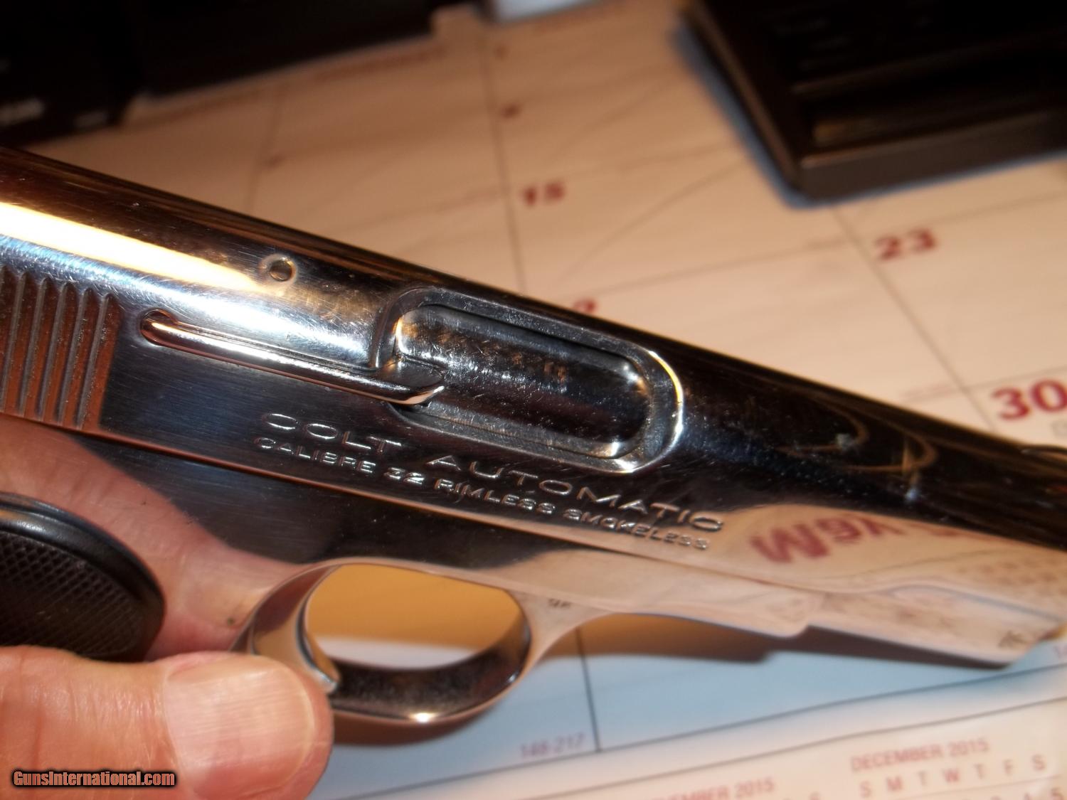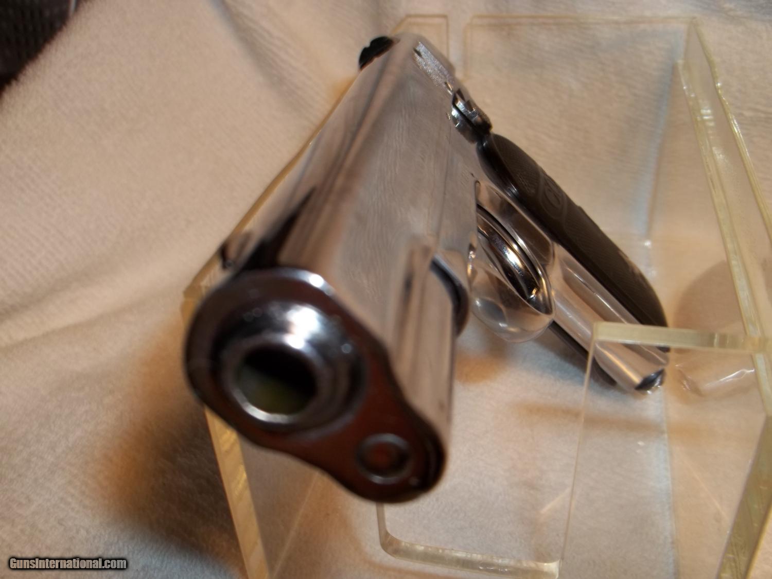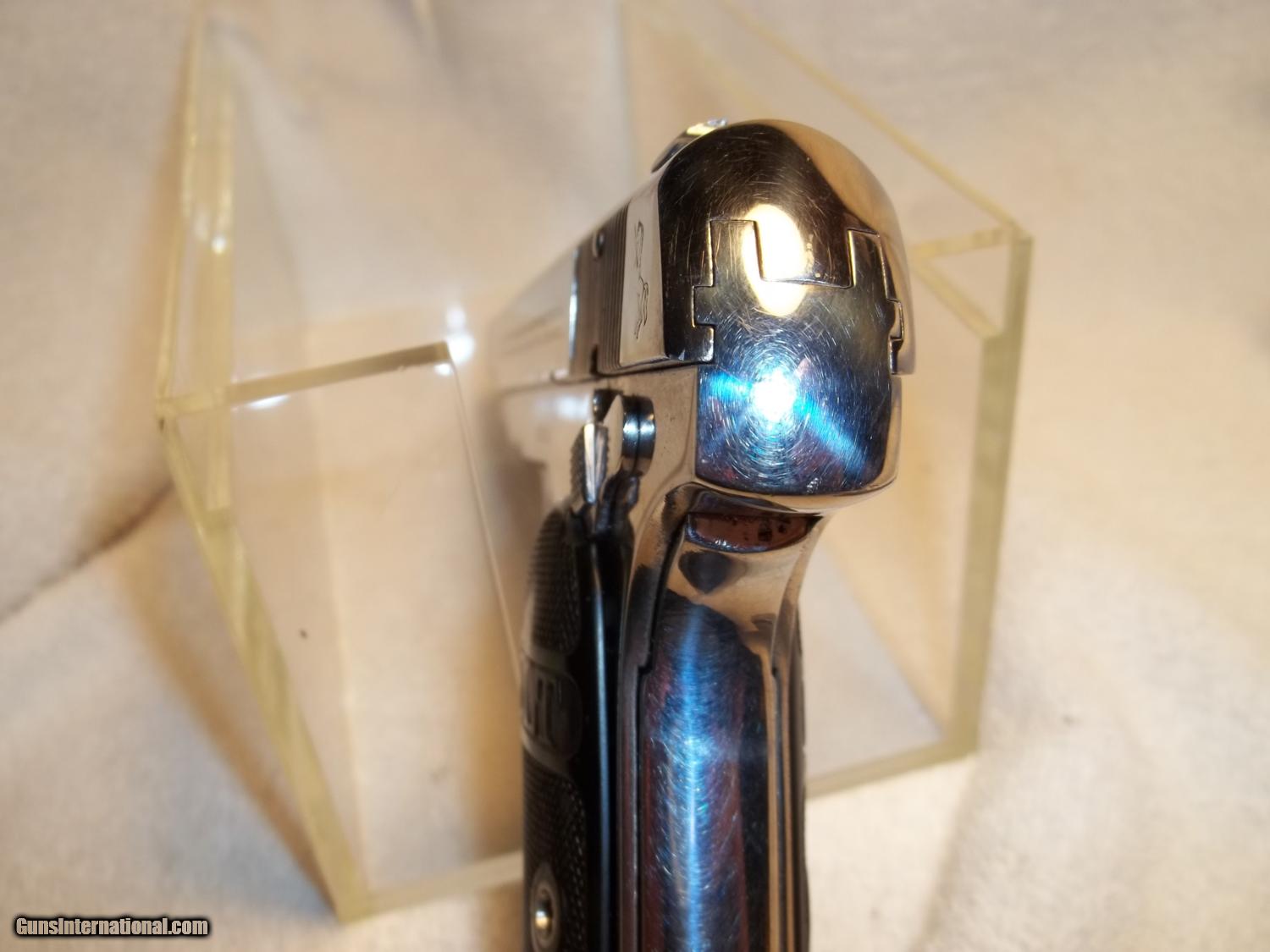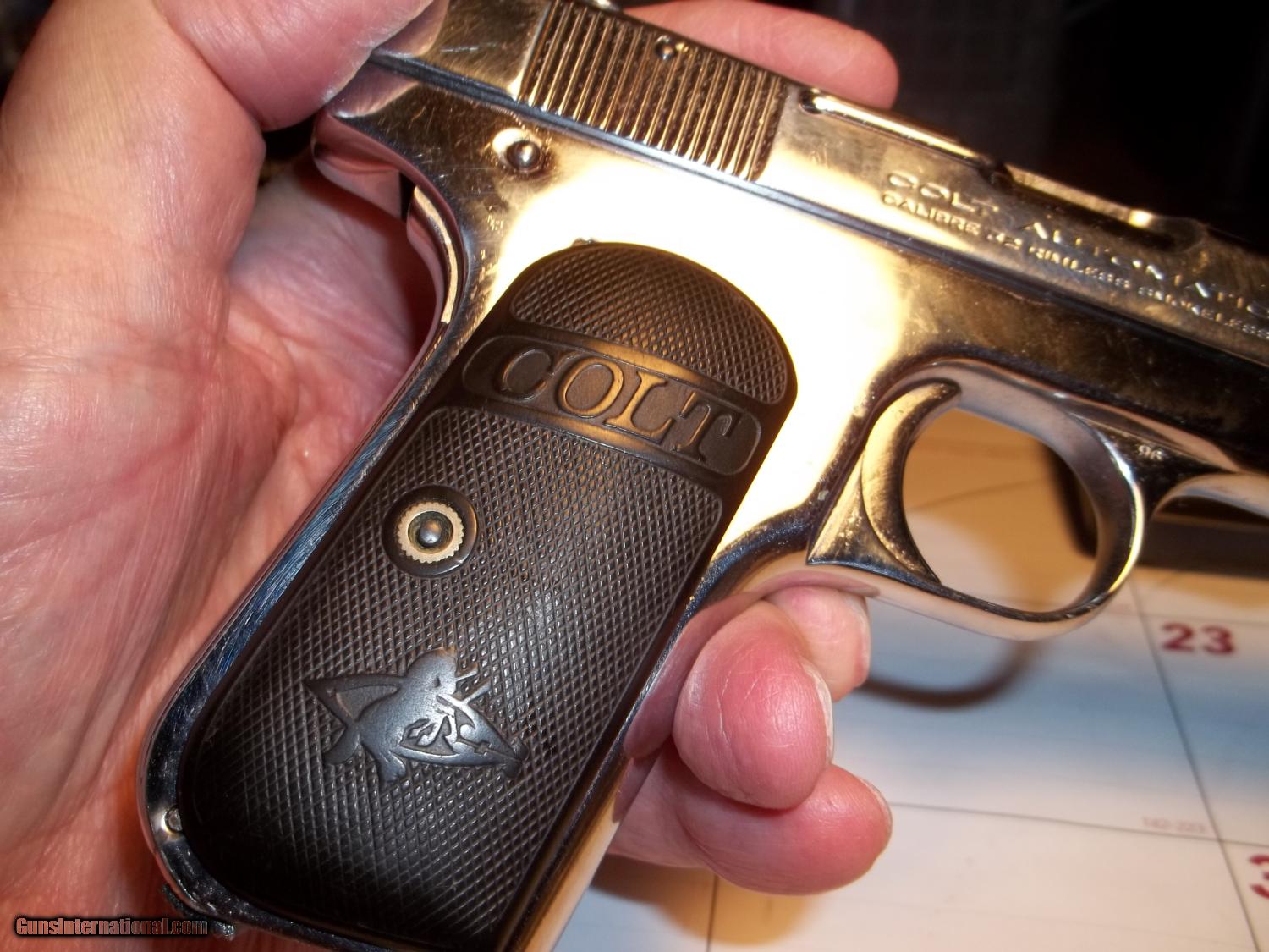 Description: Colt Model 1903 Pocket Hammerless Pistol...Type III....32ACP...3 3/4" Batrrel...Bright Boar...Nickel Finish ( Has been Polished and this makes it look like it has been refinished ) Slide and Frame have matching sewrial numbers...Weak strike on number"2" in serial number...Hard Rubber Grips with Colt Logo...Correct Colt .32 Magazine...Mfg. 1923...Very Good Condition...Personal Check or Money Order...Layaway Available. SOLD |