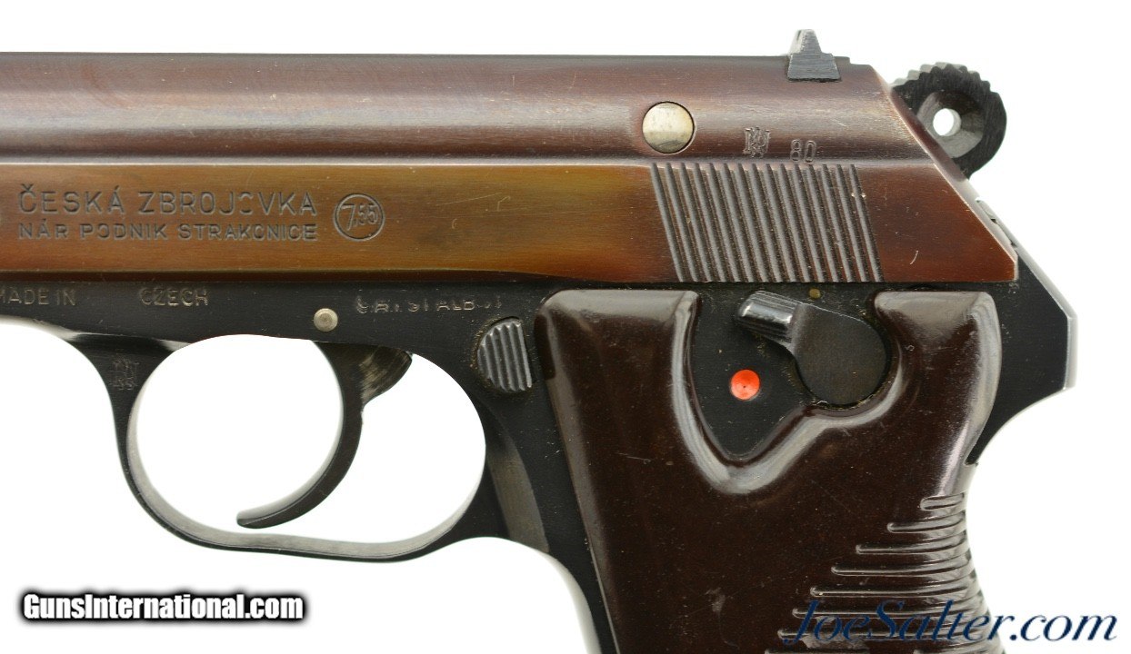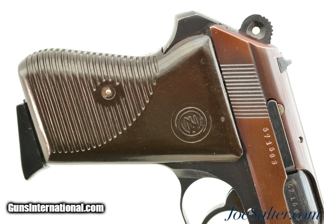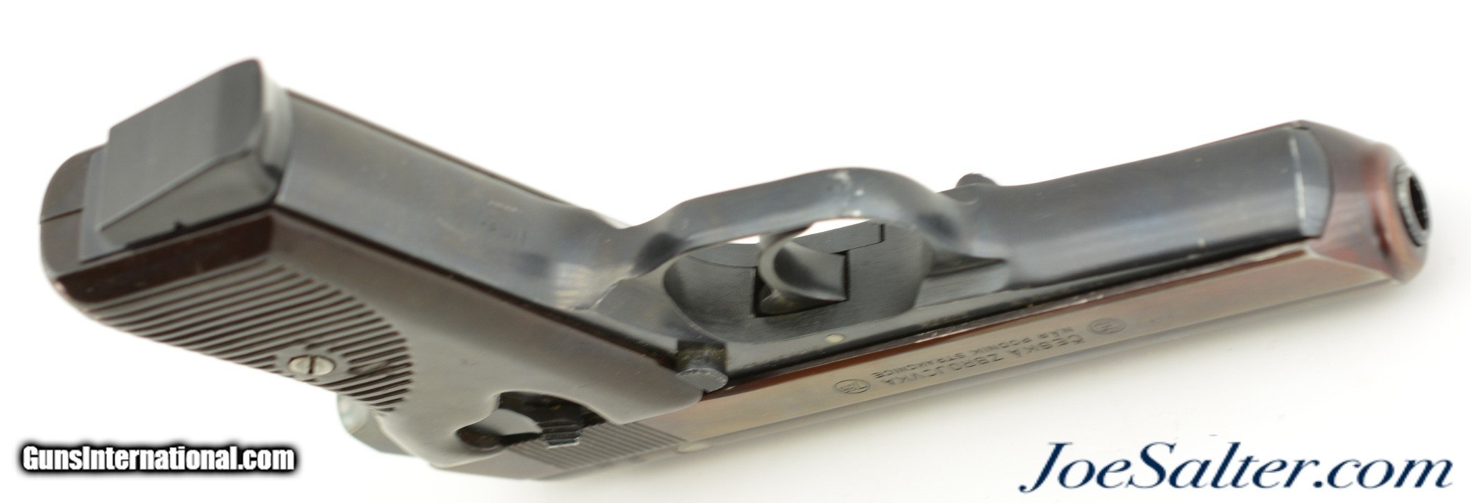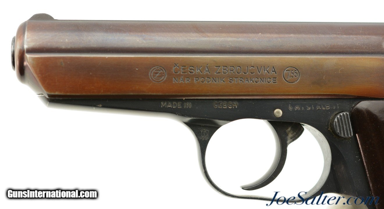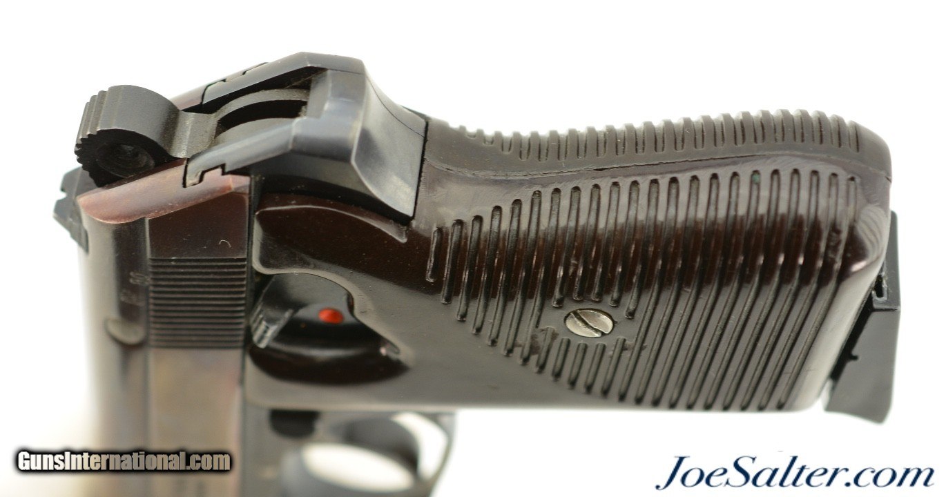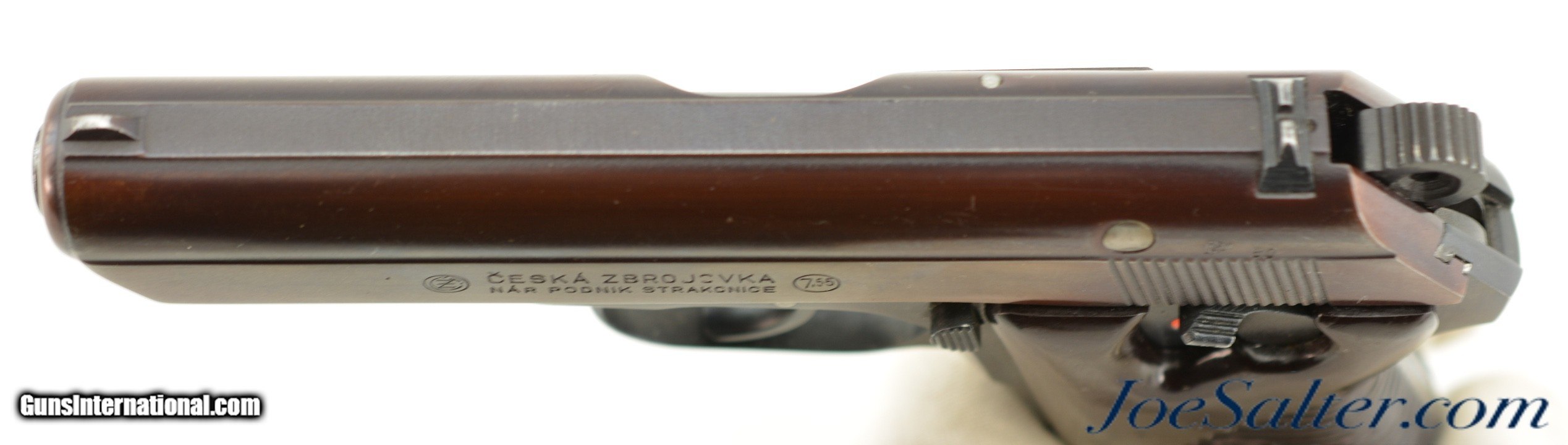Description: Serial #571603, 7.65mm (.32 ACP), 3.5 inch barrel with a bright, excellent bore. This is the Czech model 1950 blowback operated semi-automatic pistol manufactured in Czechoslovakia in 1950 and marked "NB50". The scarcely seen Cold War pistol was very briefly imported to the US with few seen today. This import marked police example remains in excellent condition with the frame retaining much of the original blue and the slide showing a brownish hue of what looks to be original, poor quality finish. The grips are in excellent condition. It comes with two original 8 round magazines. FFL or C&R Price: $595.00 Contact Seller |