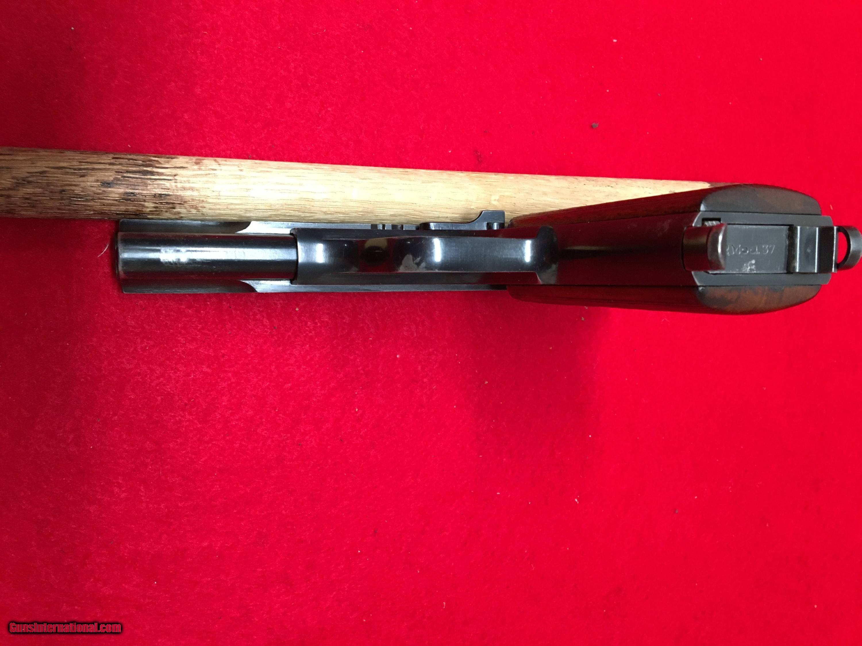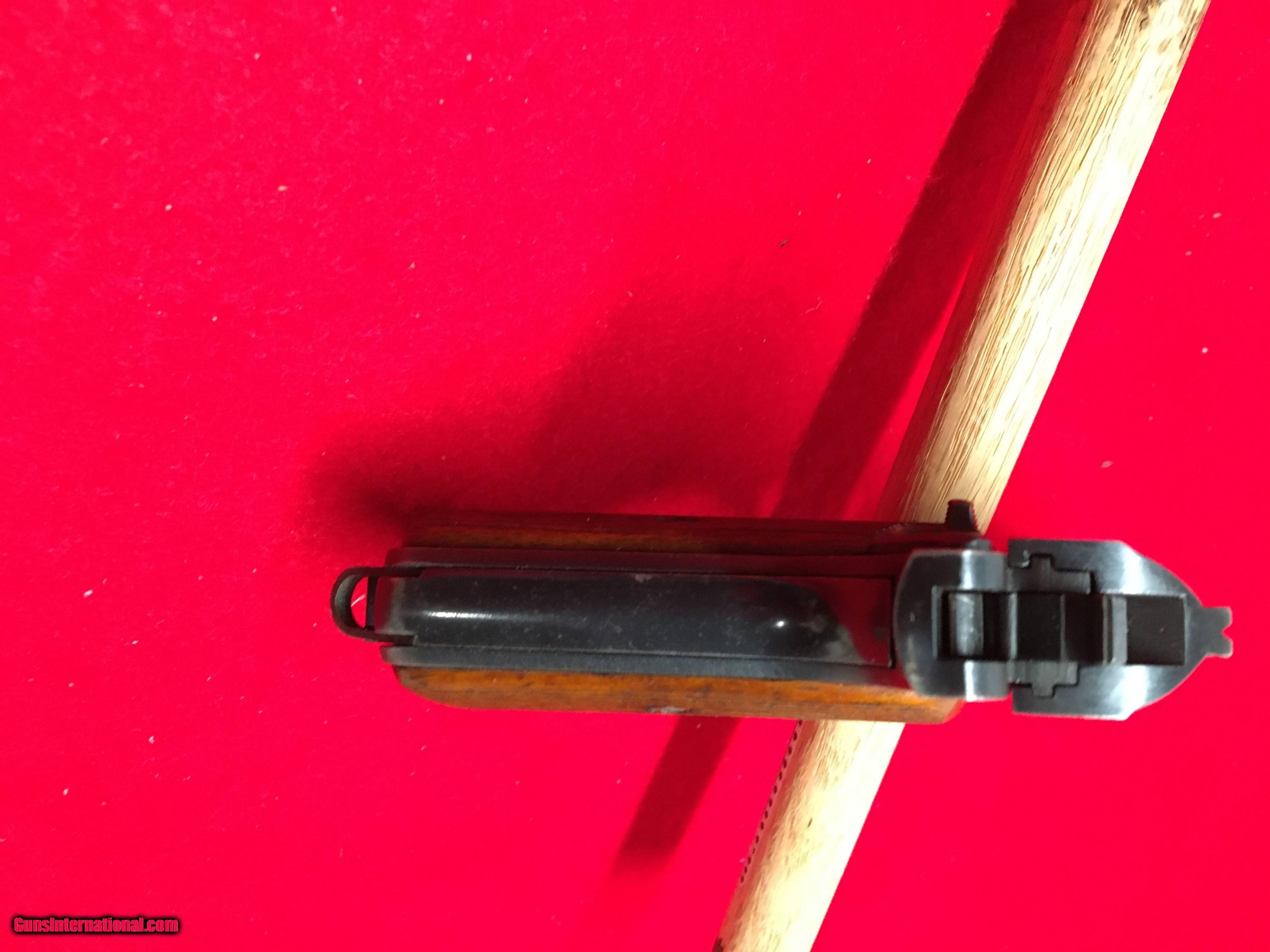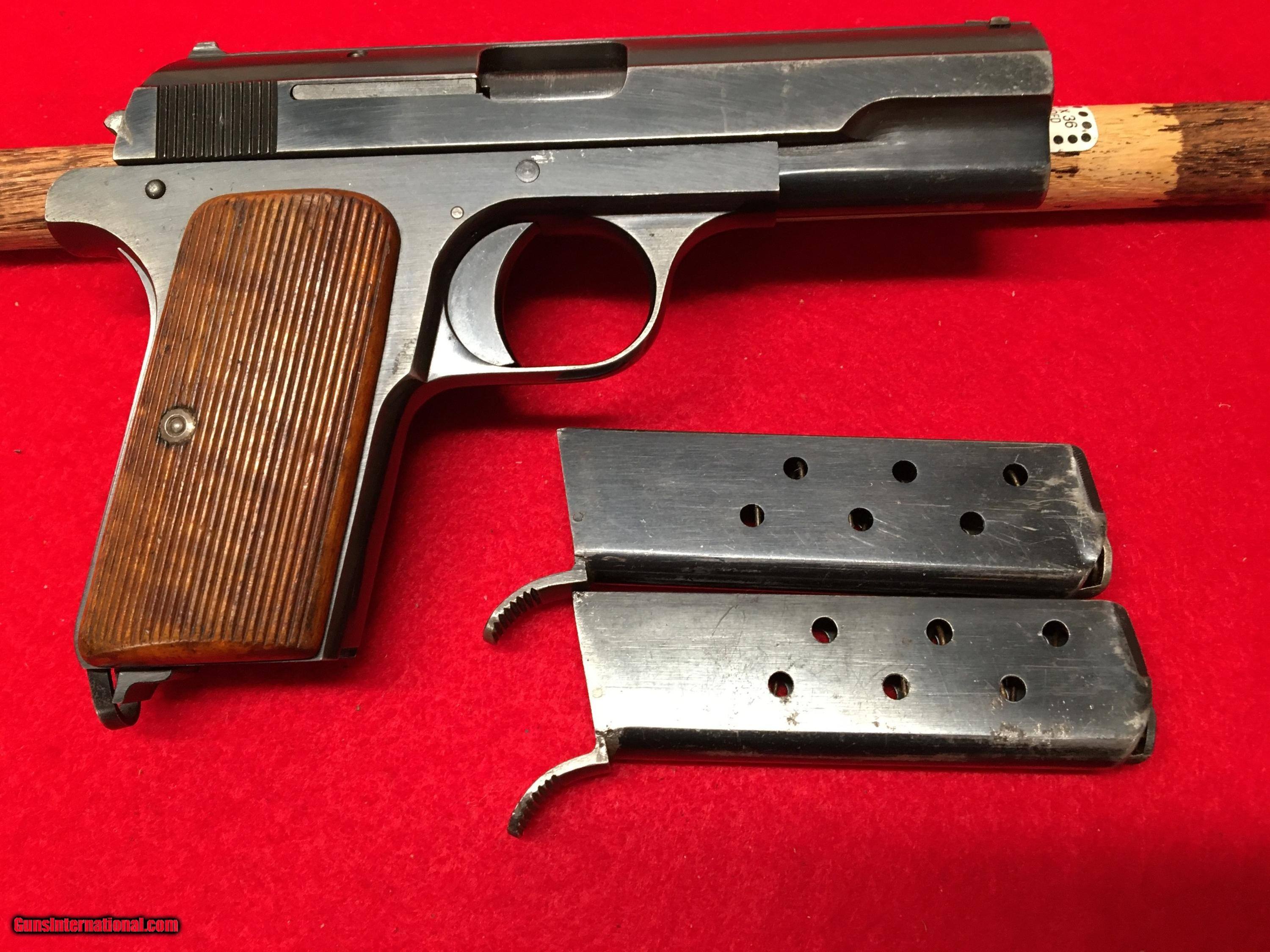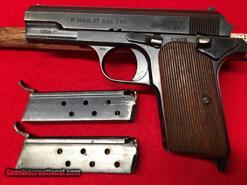 Description: Femaru Model 1937 in 7.65mm has a 3.93 inch barrel, 8 shot mag, commercial blue finish, vertically grooved 2-piece walnut grips. This is the jhv41 variation with the German Army Test Proof located on left slide and on the left side barrel forward edge. The German Army Acceptance Stamp E/WaA58 is located on left trigger guard web. This gun is the 2nd subvariation of the jhv41. Gun is in very good to excellent condition, considering wartime usage. It comes with 2 number mags not matching gun. These guns were used by the German Luftwaffe and as such saw little actual use. Sold: AS IS. Payment: USPS Money Order, Certified Check, Personal Check. Buyer pays shipping, handling and insurance costs; flat rate $35 SOLD Manufacturer: Femaru Model: 1937 |