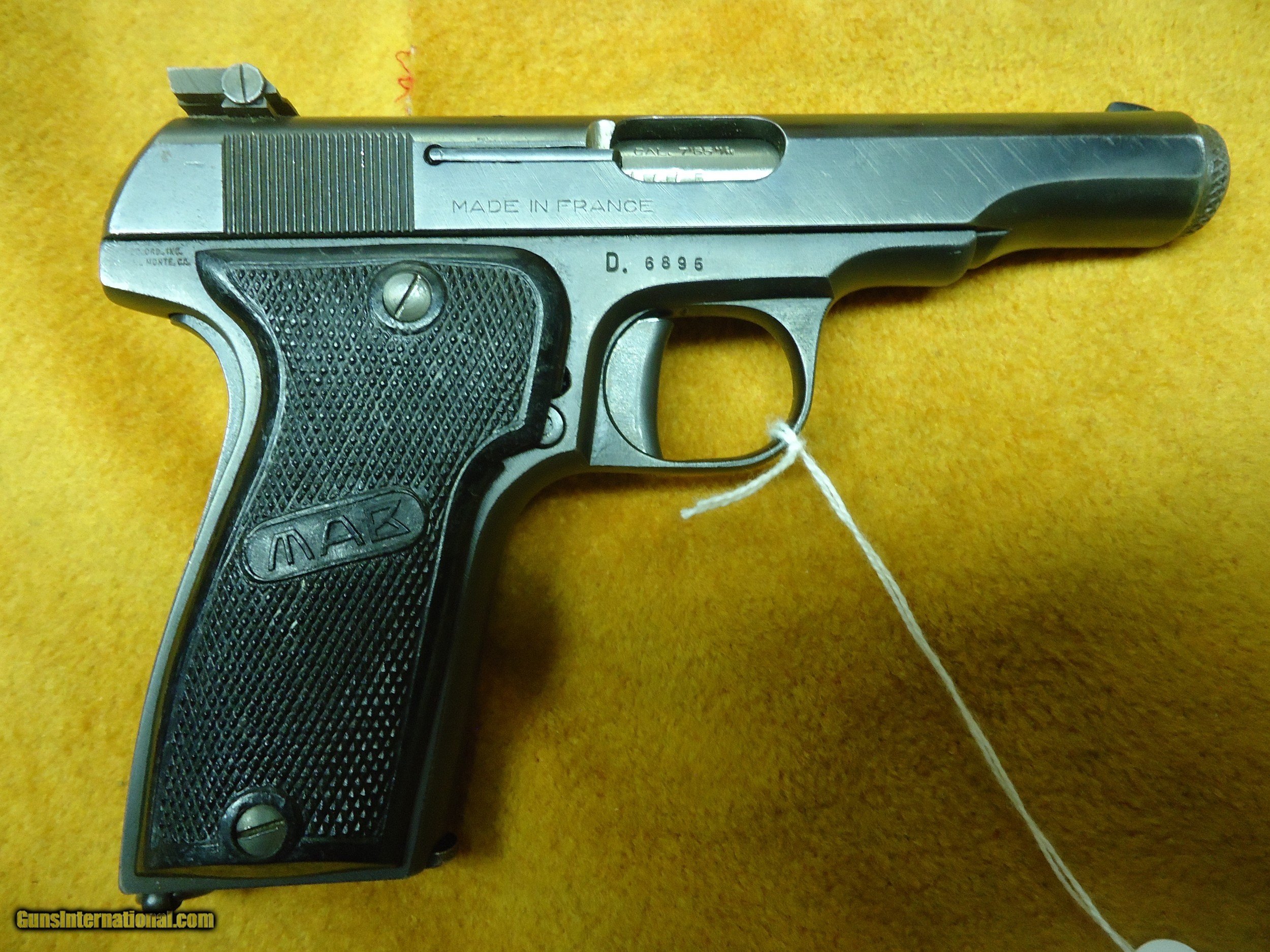 Description: French MAB Model D 32 acp with extra magazine SOLD Curio/Relic: Yes Manufacturer: MAB Model: Model D Serial Number: D6895 Caliber Info: 32 acp Bore: Good Condition: Very good 90% Metal Condition: good |