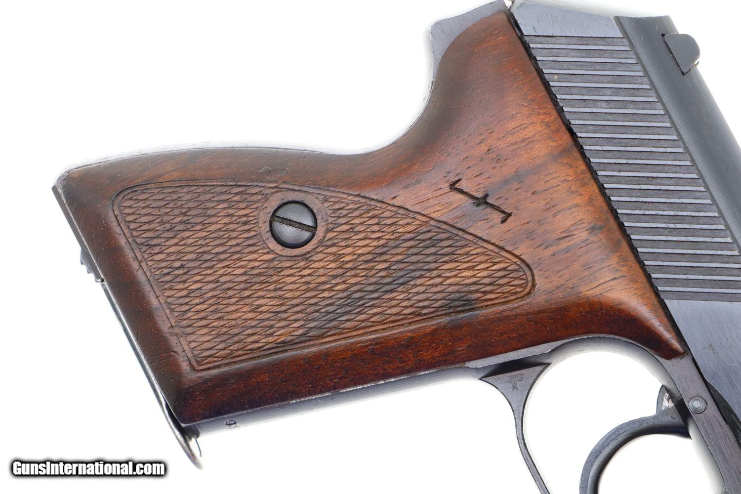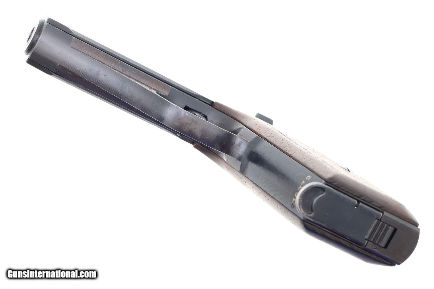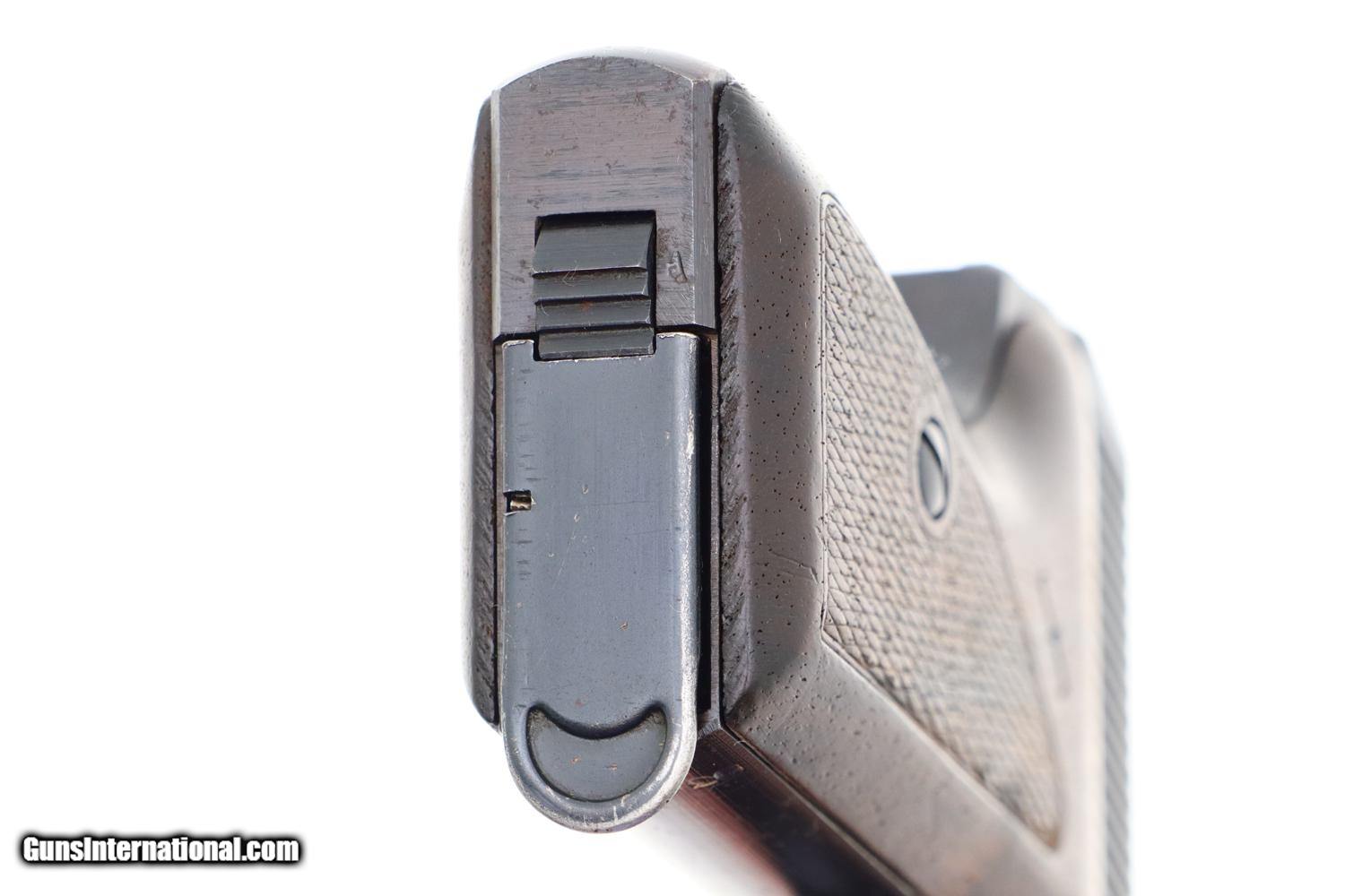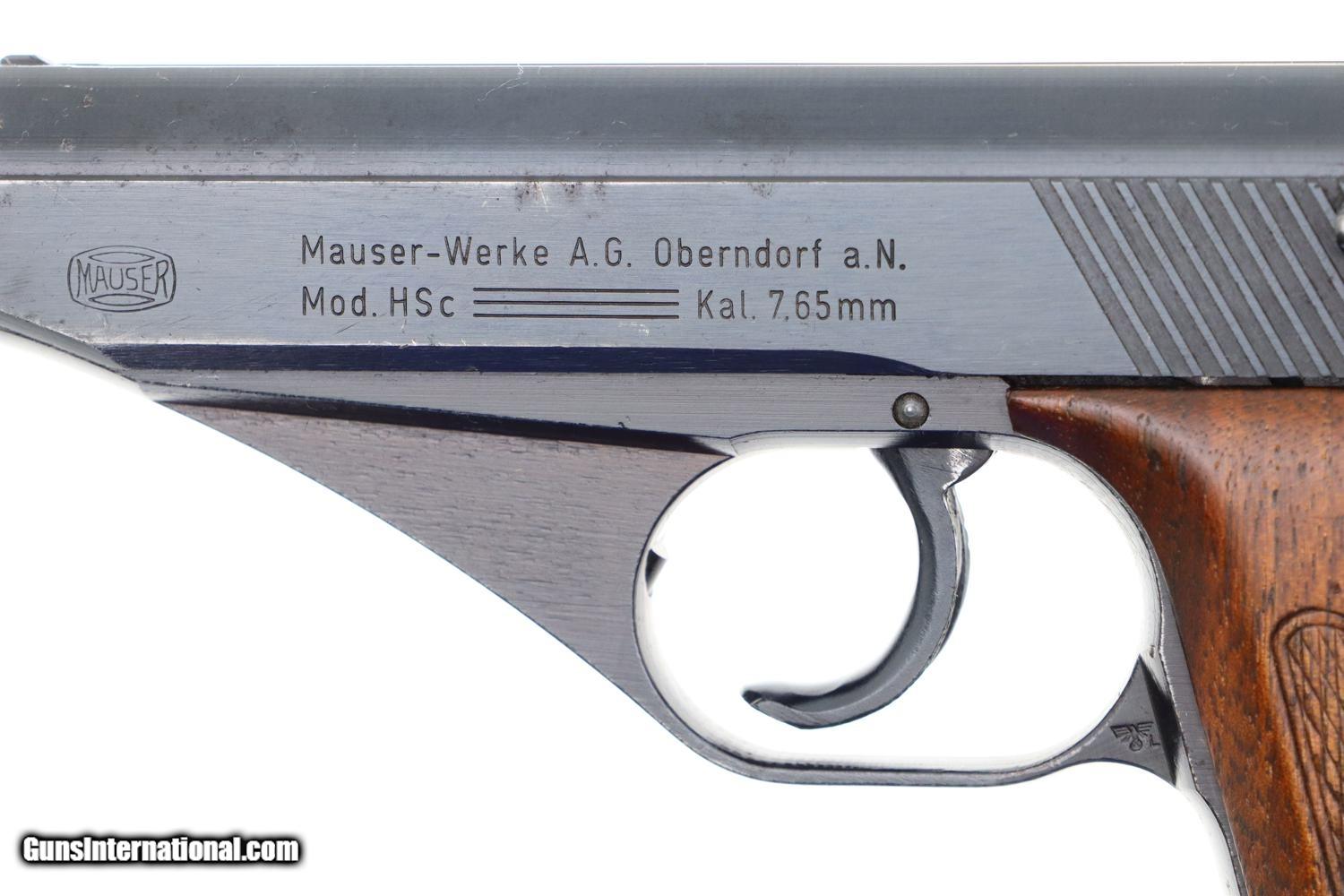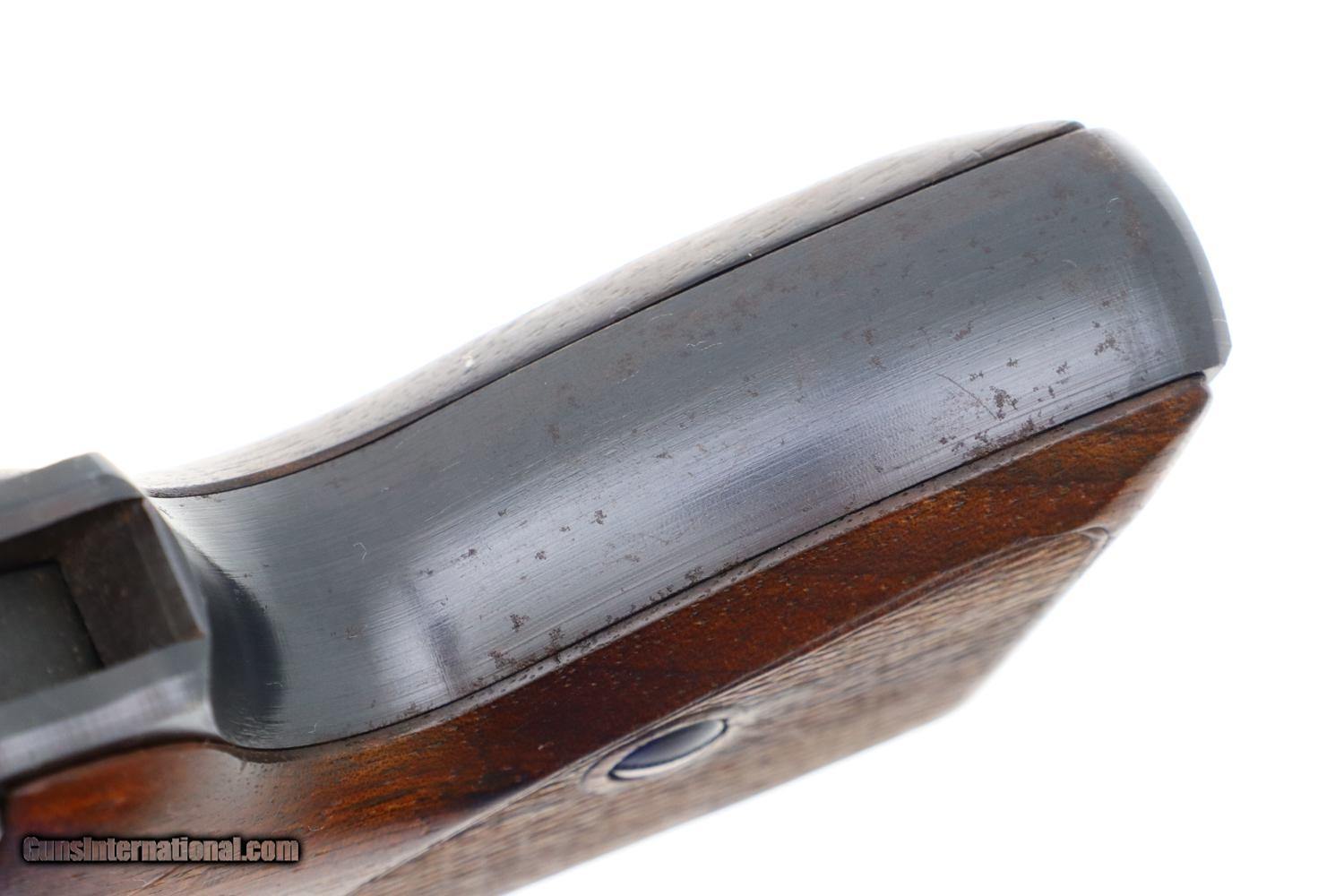 Description: Synopsis: Matching Mauser, HSc, Late WWII, German Police Pistol, Eagle L Description: Nice example of a late milled finish Mauser HSc German police Eagle/L pistol that is all-matching with correct magazine. Left side of slide marked with Mauser Banner and late two line address referencing manufacturer, model, and caliber. Usual Eagle/N proofs. Eagle/L marking on left side of trigger guard web. Full serial number on bottom of frontstrap with last few digits electropenciled inside slide and stamped under barrel. Usual wood grips with pressed checkering. Correct magazine with in-the-white body and unmarked indented floorplate. Condition: VG+ original salt blue with sharp edge wear and light freckling as one might expect from a police pistol that has seen service use. Comparable condition grips and magazine. Mirror bore. Perfect manual mechanics. A very attractive and all matching German police pistol from late WWII, equally at home at the range or in your collection. ~~Insured shipping fee of $55; most packages shipped using FedEx 2nd Day.~~ SOLD Manufacturer: Mauser Serial Number: 938372 Caliber Info: 7.65mm |