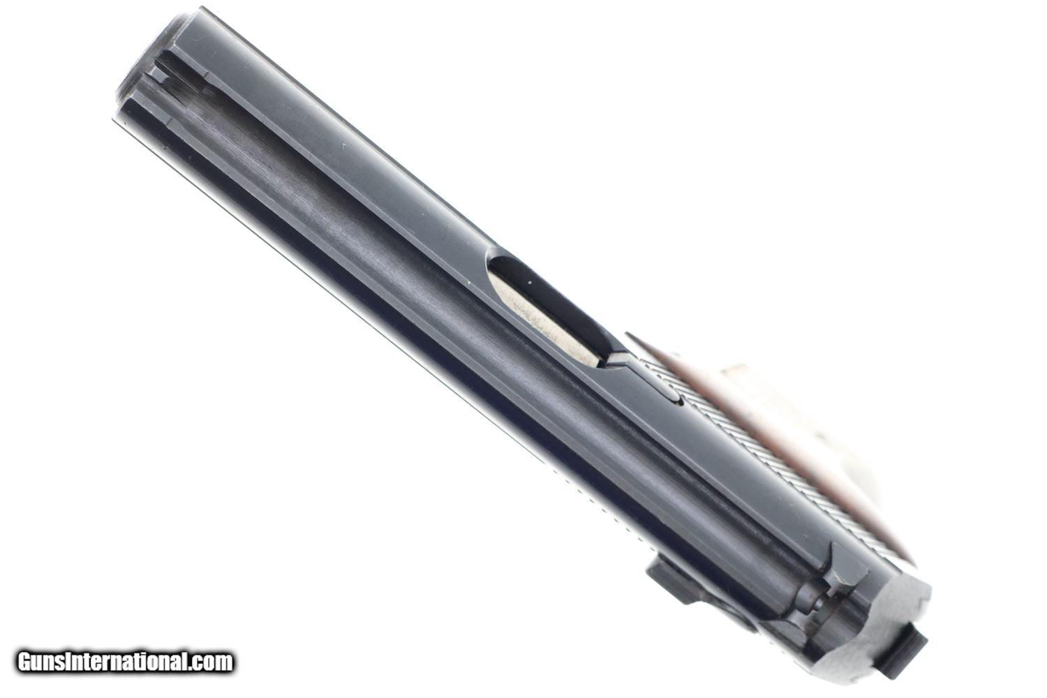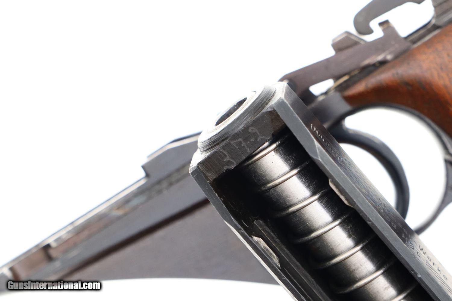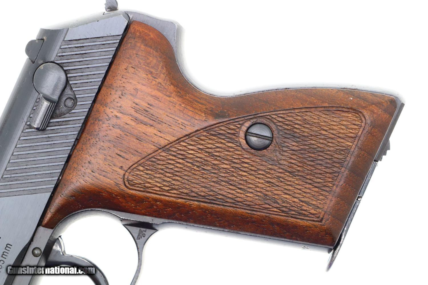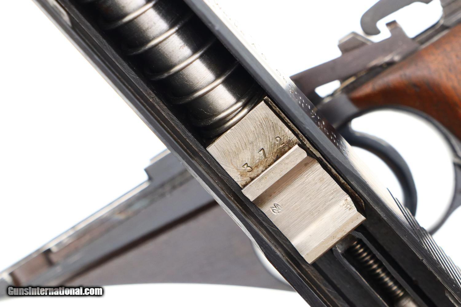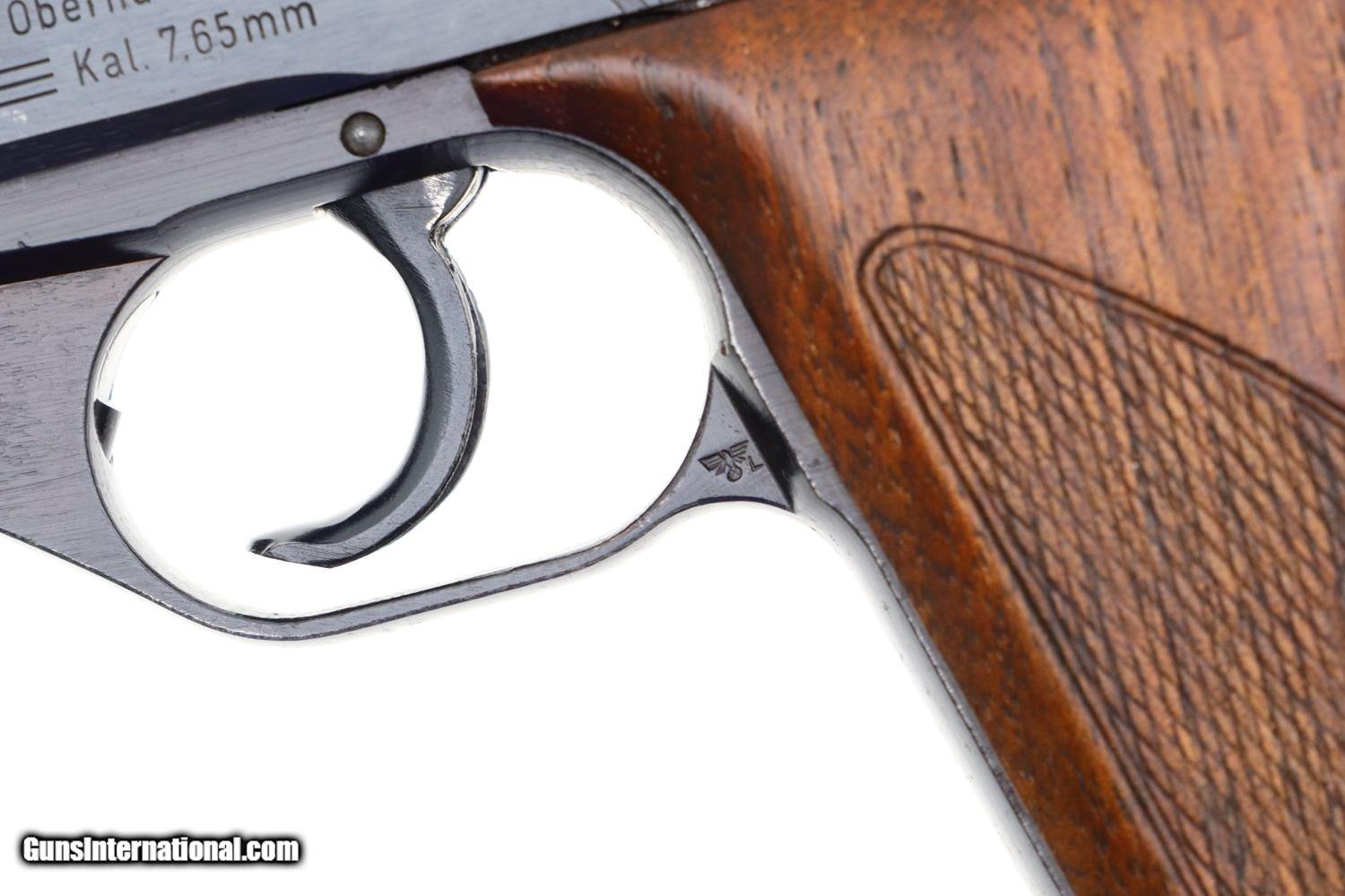 Description: Synopsis: Matching Mauser, HSc, Late WWII, German Police Pistol, Eagle L Description: Nice example of a late milled finish Mauser HSc German police Eagle/L pistol that is all-matching with correct magazine. Left side of slide marked with Mauser Banner and late two line address referencing manufacturer, model, and caliber. Usual Eagle/N proofs. Eagle/L marking on left side of trigger guard web. Full serial number on bottom of frontstrap with last few digits electropenciled inside slide and stamped under barrel. Usual wood grips with pressed checkering. Correct magazine with in-the-white body and unmarked indented floorplate. Condition: VG+ original salt blue with sharp edge wear and light freckling as one might expect from a police pistol that has seen service use. Comparable condition grips and magazine. Mirror bore. Perfect manual mechanics. A very attractive and all matching German police pistol from late WWII, equally at home at the range or in your collection. ~~Insured shipping fee of $55; most packages shipped using FedEx 2nd Day.~~ SOLD Manufacturer: Mauser Serial Number: 938372 Caliber Info: 7.65mm |