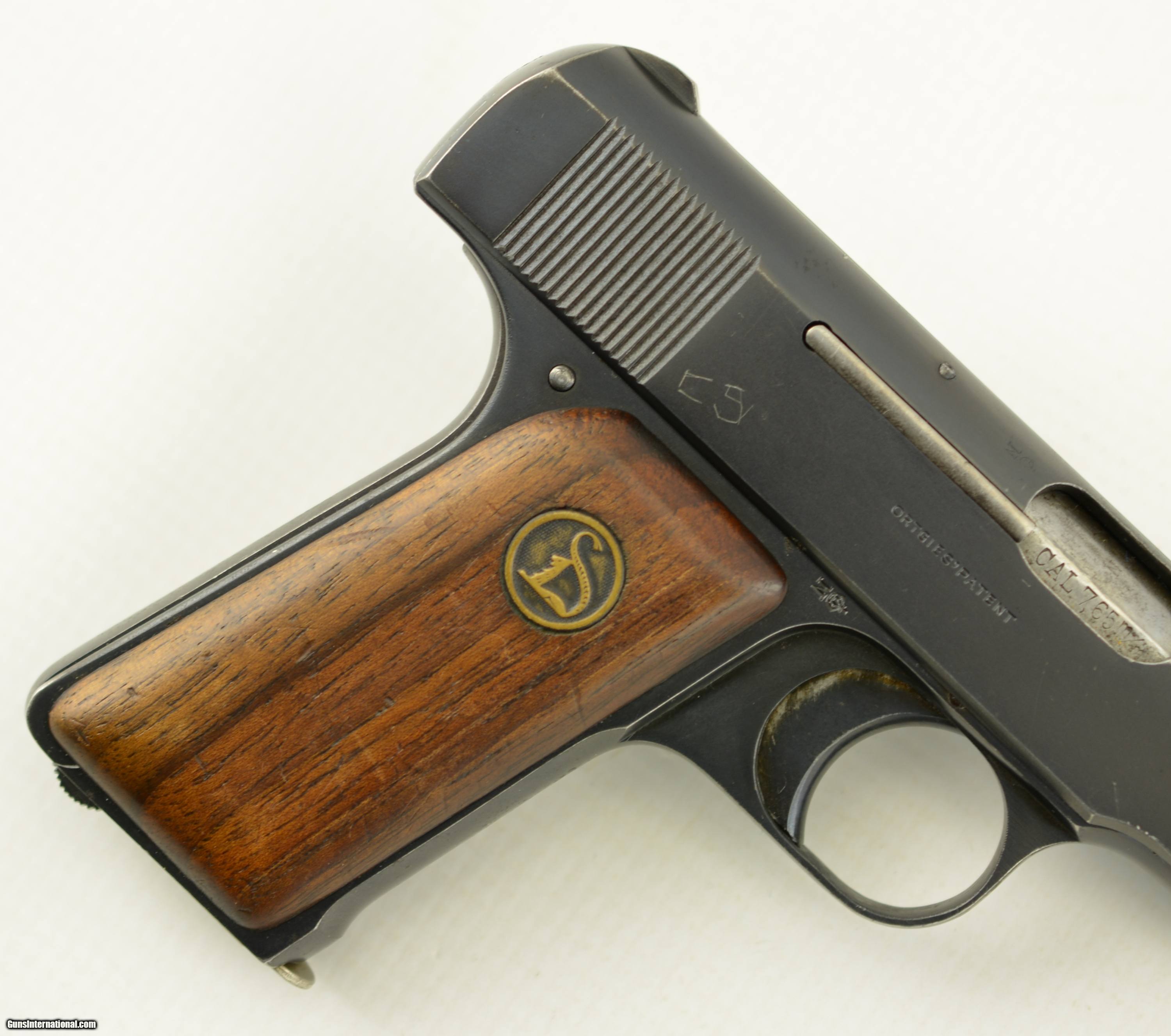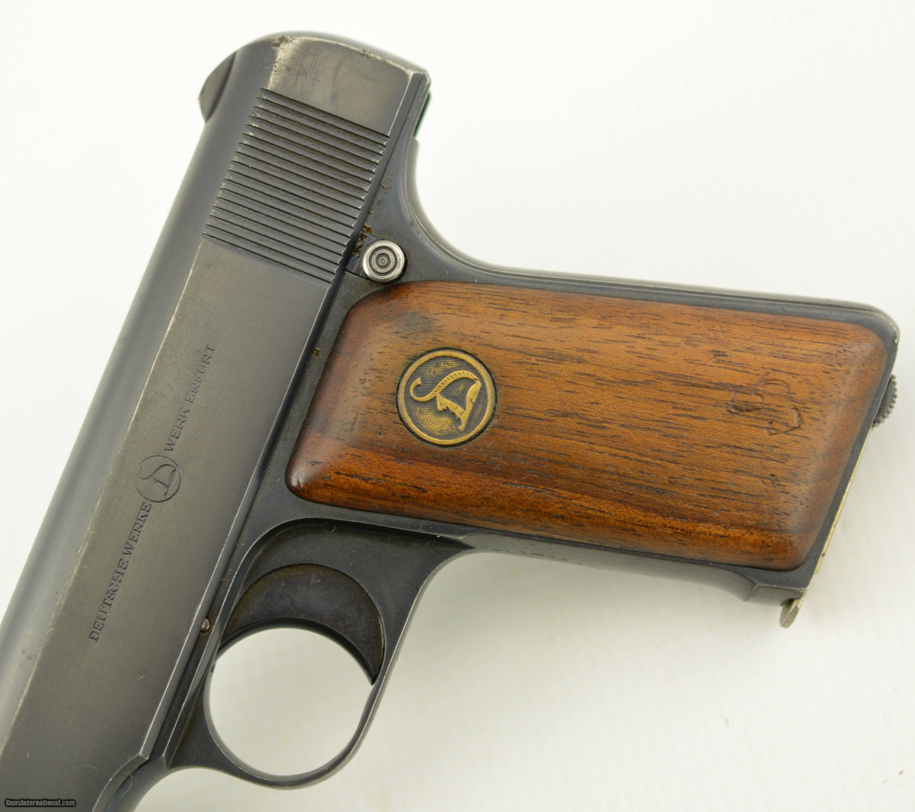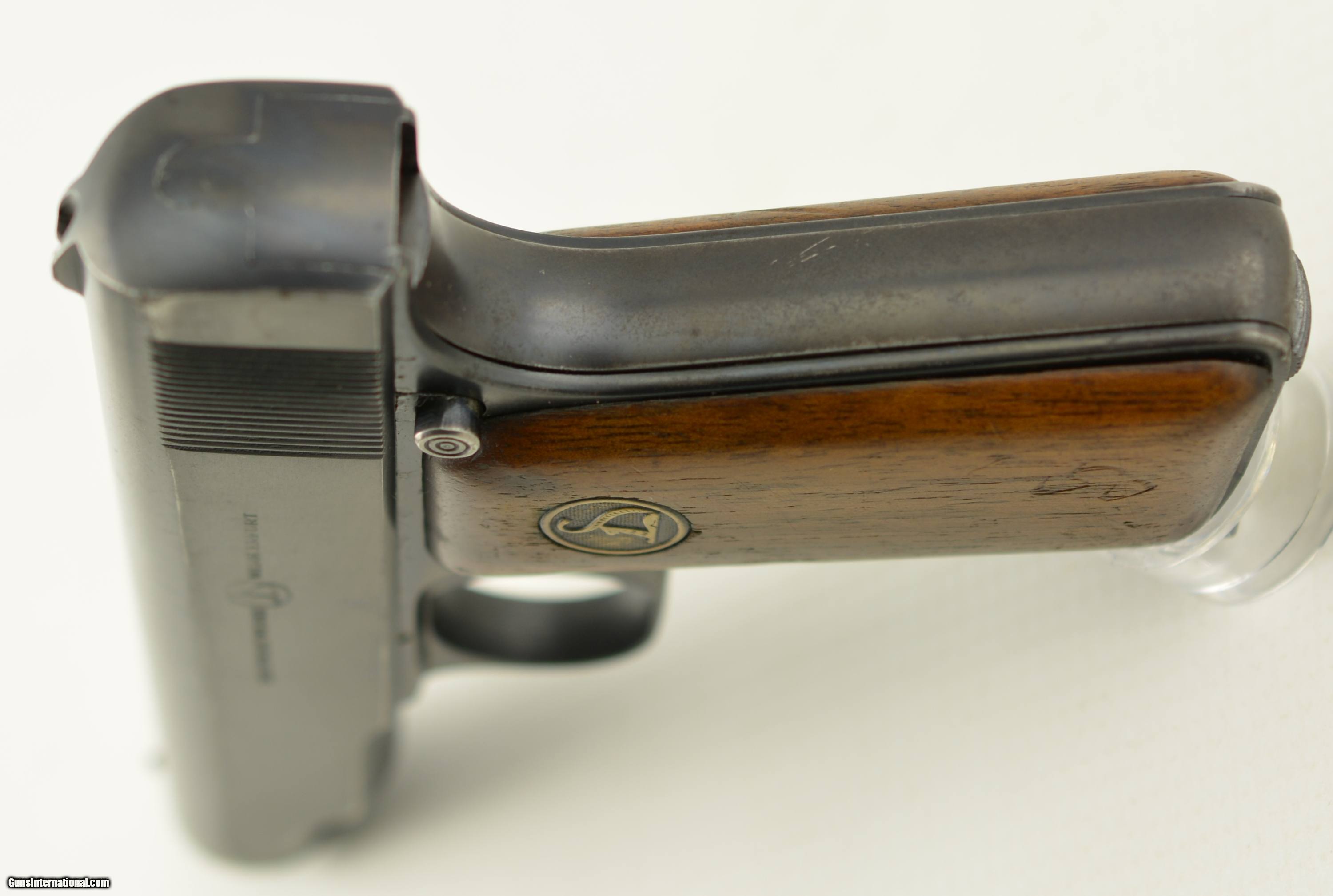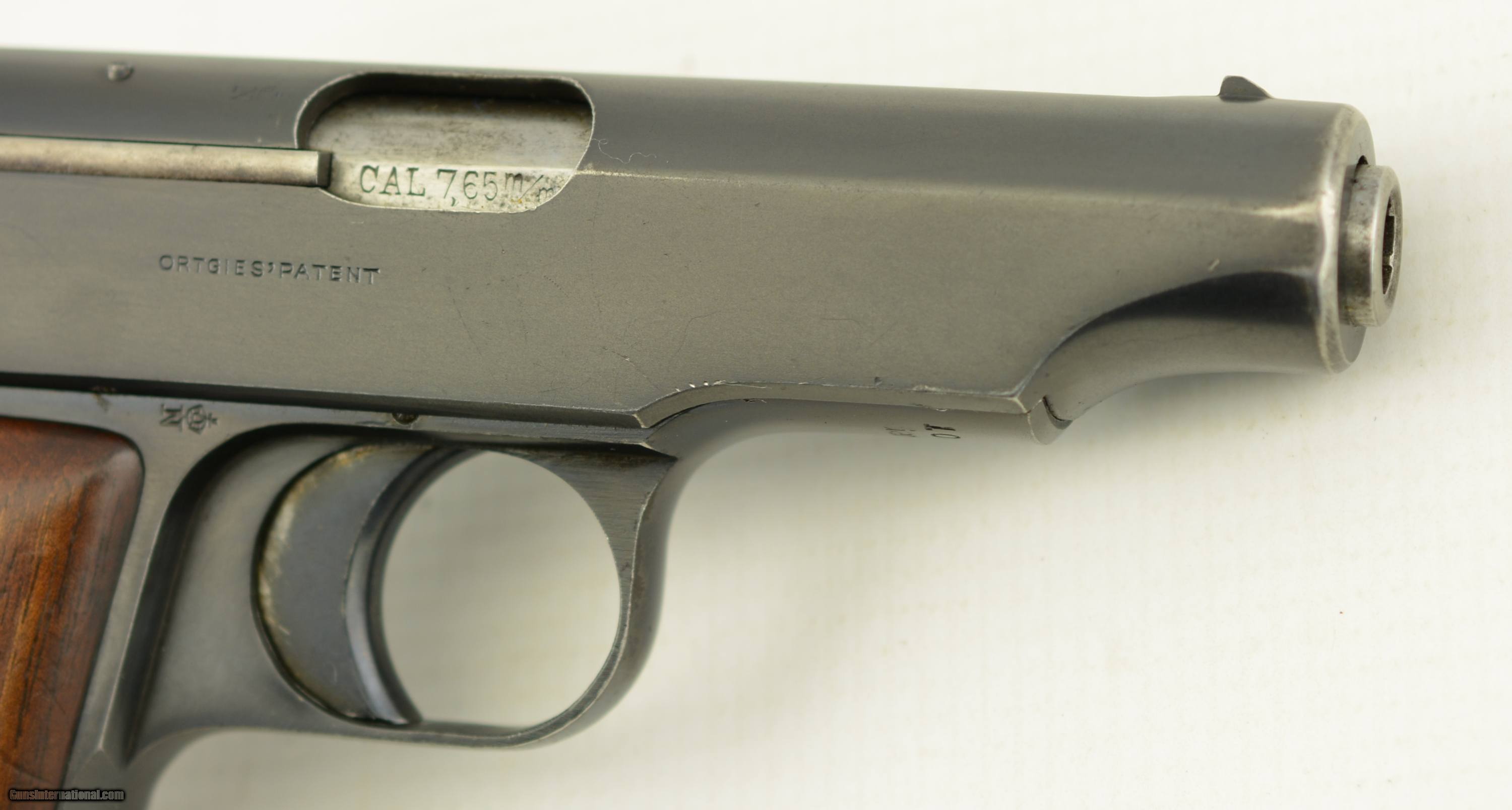 Description: Serial #108549, 7.65mm (.32 ACP), 3 1/4" barrel with an excellent, bright bore. This is a handsome little pistol that retains 92-95% of the original blue finish with some mild silvering and fading along a few of the edges, and along the top radius of the slide. Also a small "CS" is scratched into the right side of the slide. The smooth walnut grips with “D" medallions are likewise in fine shape with hardly any handling marks or blemishes marring the original finish. A single magazine is included, and the pistol rates fine plus-near excellent overall. FFL or C&R SOLD Curio/Relic: Yes Manufacturer: Ortgies Model: Pocket Caliber Info: .32 ACP Gauge Info: .32 ACP |