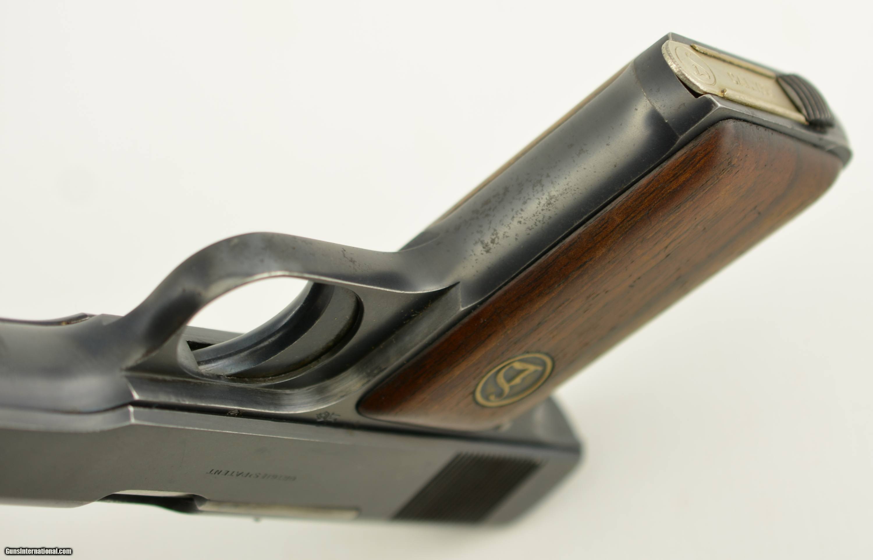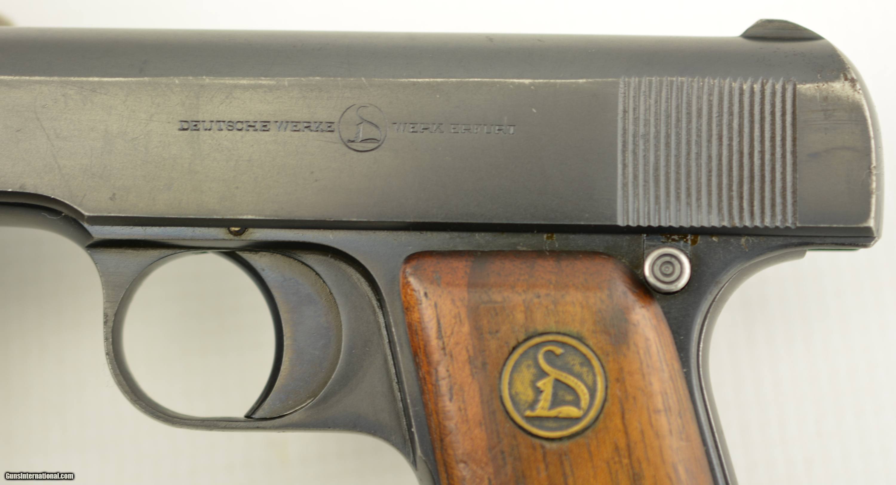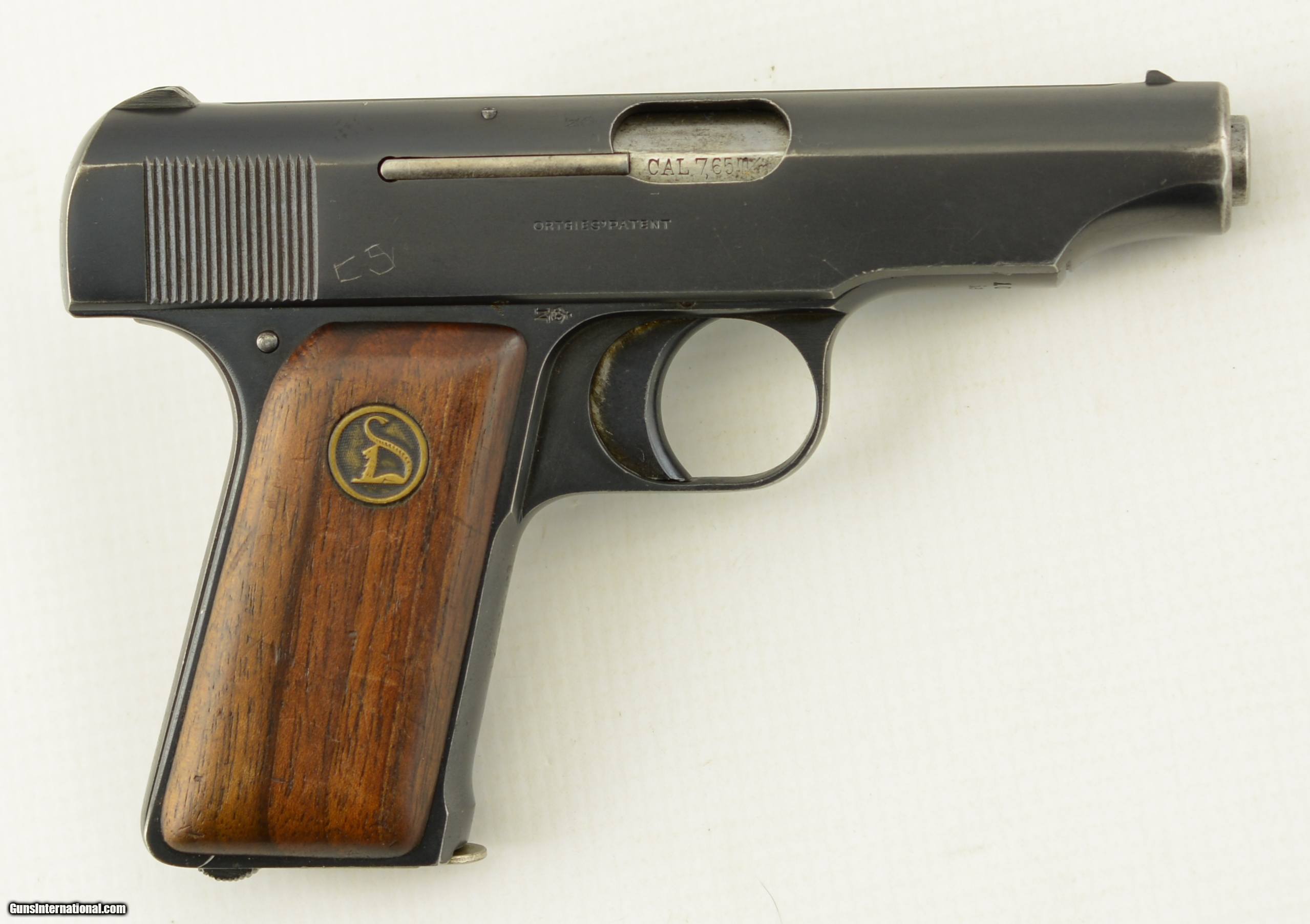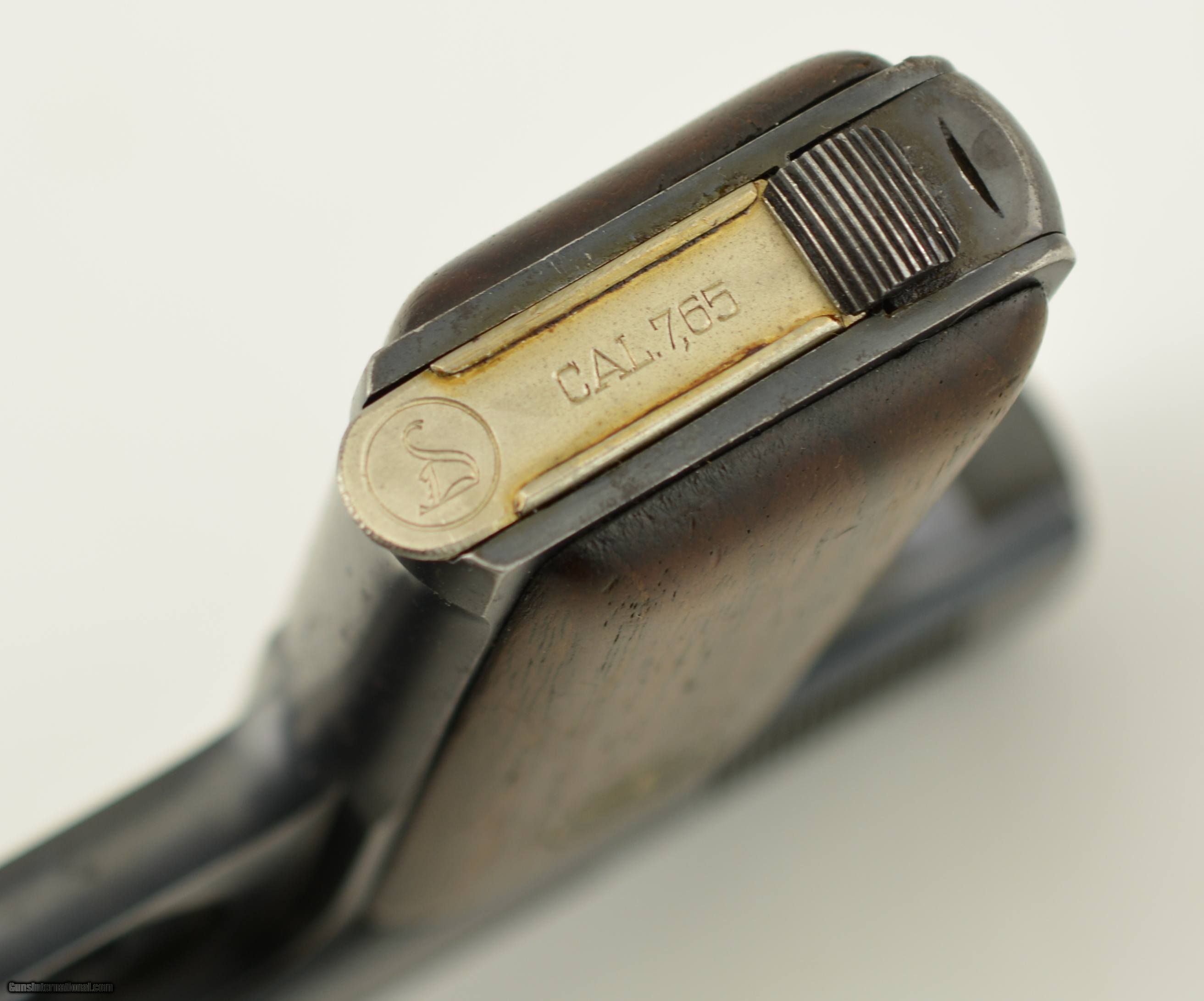 Description: Serial #108549, 7.65mm (.32 ACP), 3 1/4" barrel with an excellent, bright bore. This is a handsome little pistol that retains 92-95% of the original blue finish with some mild silvering and fading along a few of the edges, and along the top radius of the slide. Also a small "CS" is scratched into the right side of the slide. The smooth walnut grips with “D" medallions are likewise in fine shape with hardly any handling marks or blemishes marring the original finish. A single magazine is included, and the pistol rates fine plus-near excellent overall. FFL or C&R SOLD Curio/Relic: Yes Manufacturer: Ortgies Model: Pocket Caliber Info: .32 ACP Gauge Info: .32 ACP |