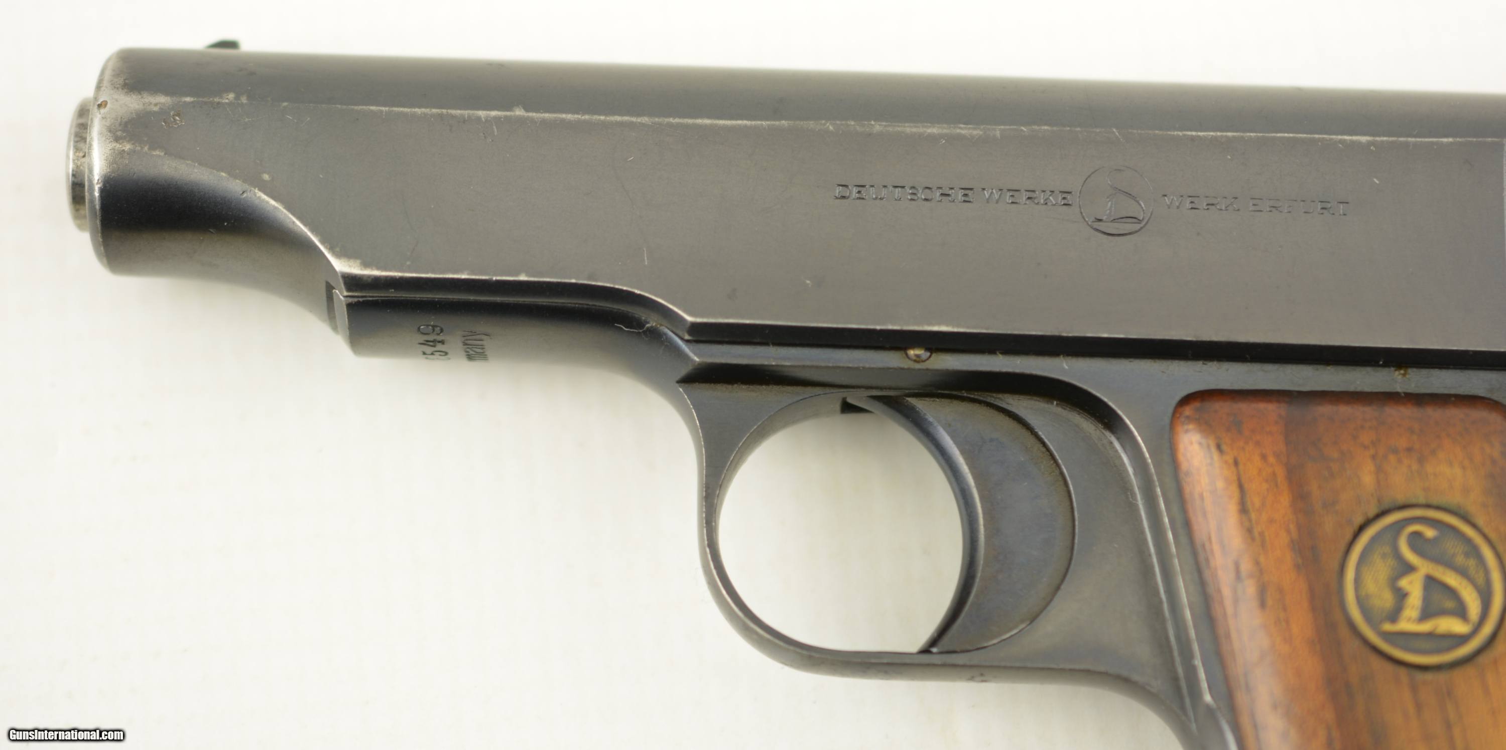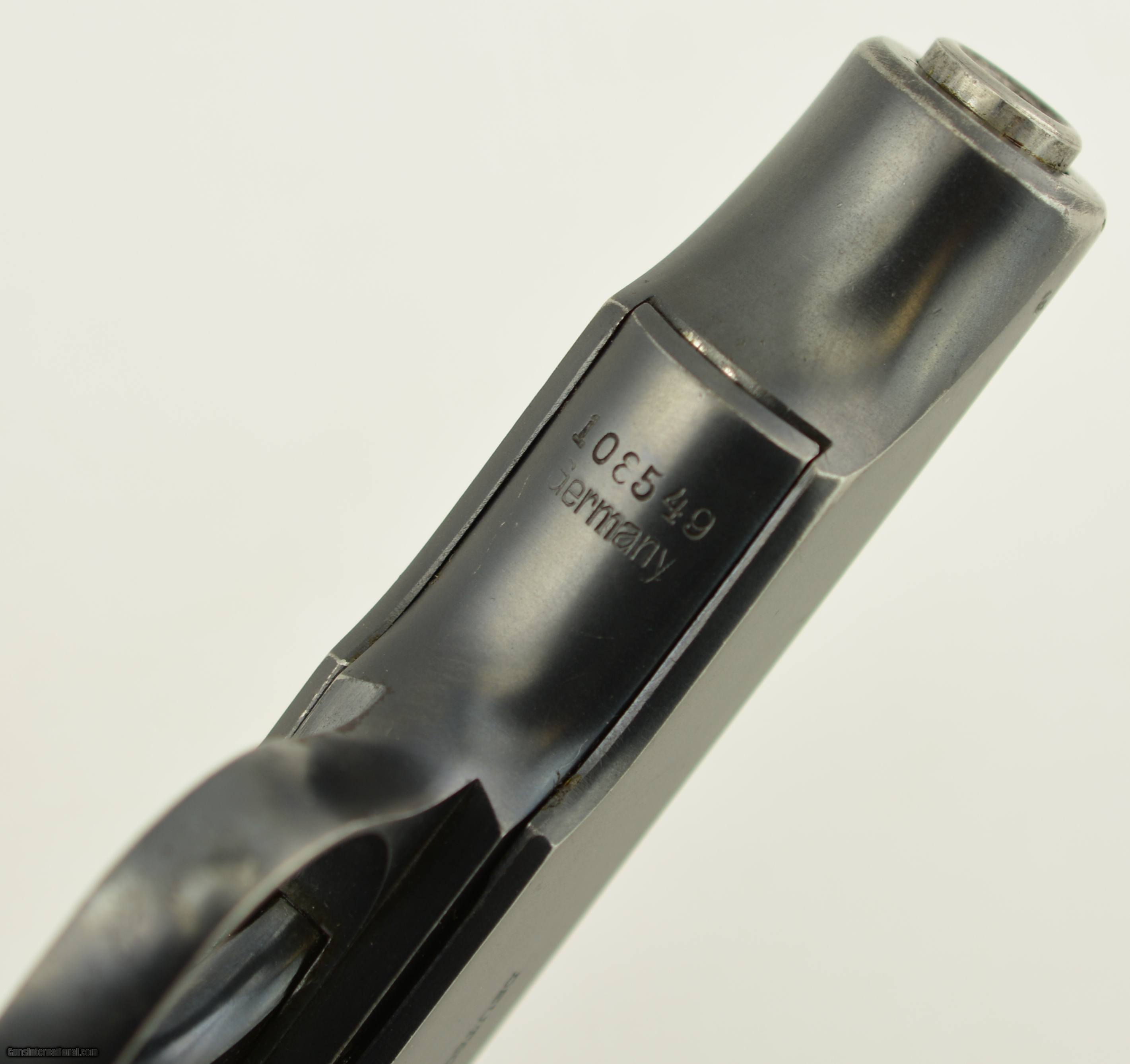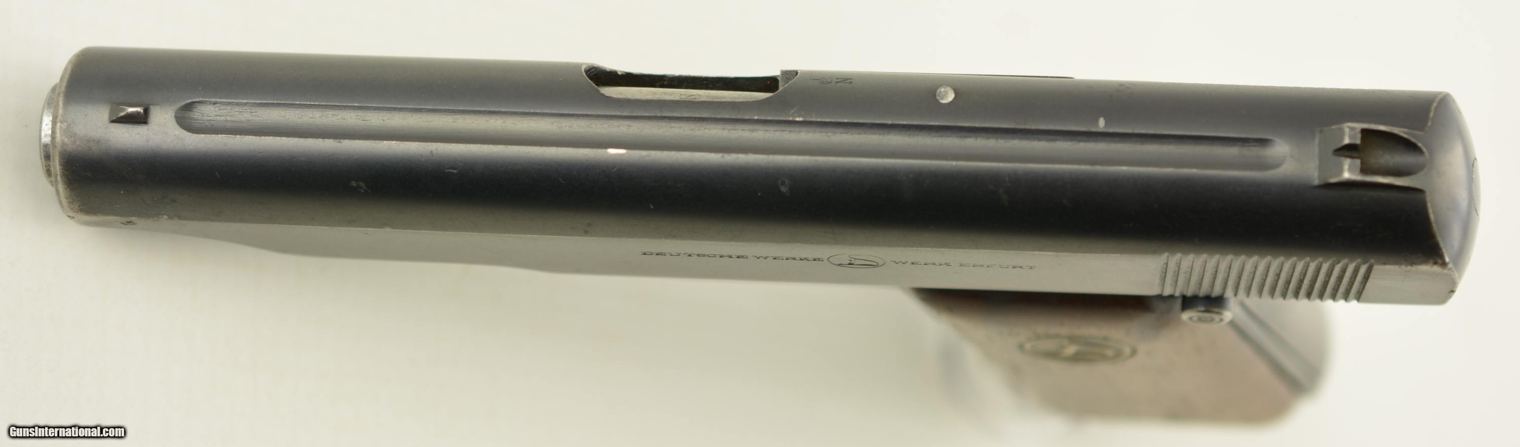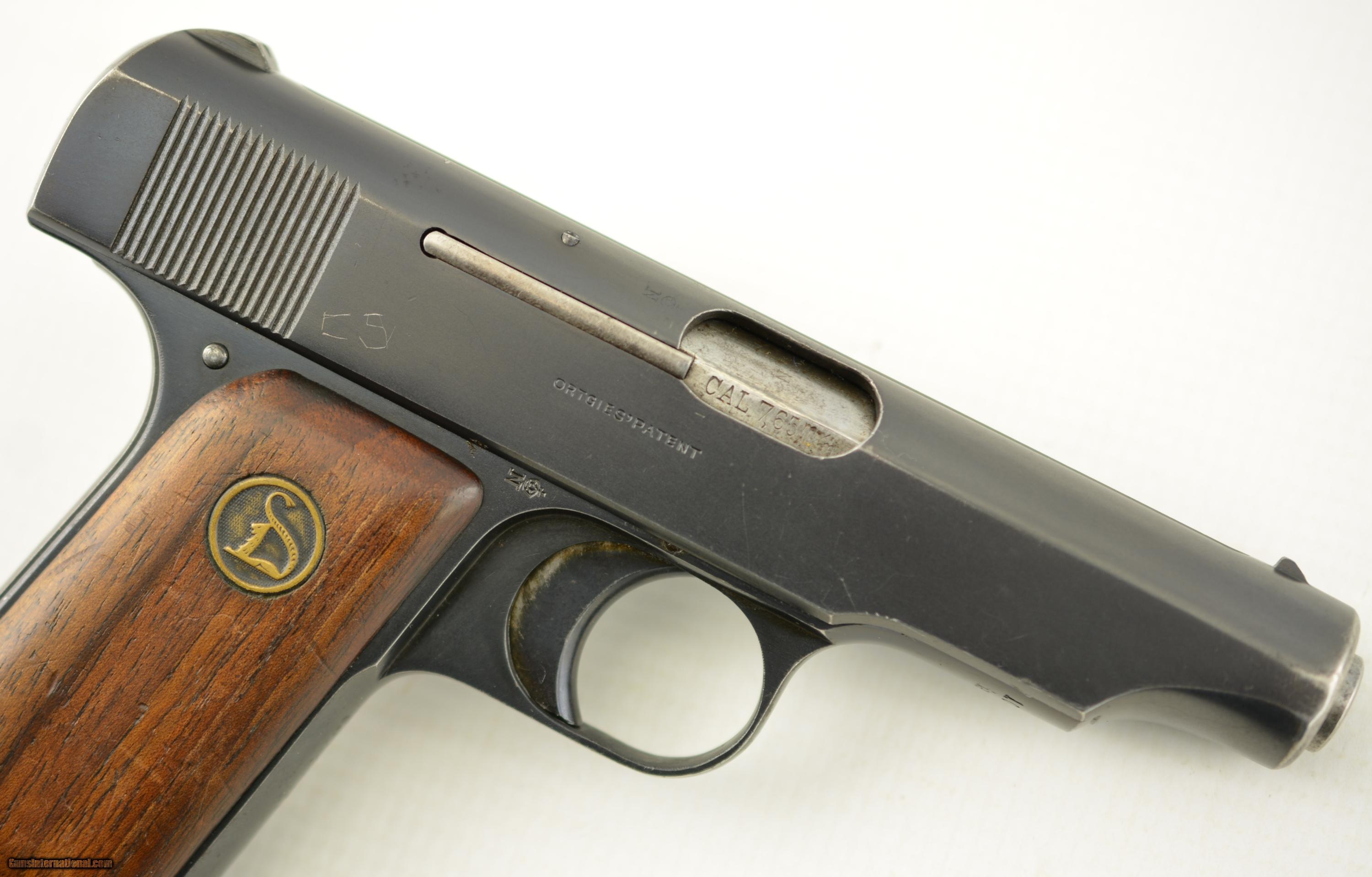 Description: Serial #108549, 7.65mm (.32 ACP), 3 1/4" barrel with an excellent, bright bore. This is a handsome little pistol that retains 92-95% of the original blue finish with some mild silvering and fading along a few of the edges, and along the top radius of the slide. Also a small "CS" is scratched into the right side of the slide. The smooth walnut grips with “D" medallions are likewise in fine shape with hardly any handling marks or blemishes marring the original finish. A single magazine is included, and the pistol rates fine plus-near excellent overall. FFL or C&R SOLD Curio/Relic: Yes Manufacturer: Ortgies Model: Pocket Caliber Info: .32 ACP Gauge Info: .32 ACP |