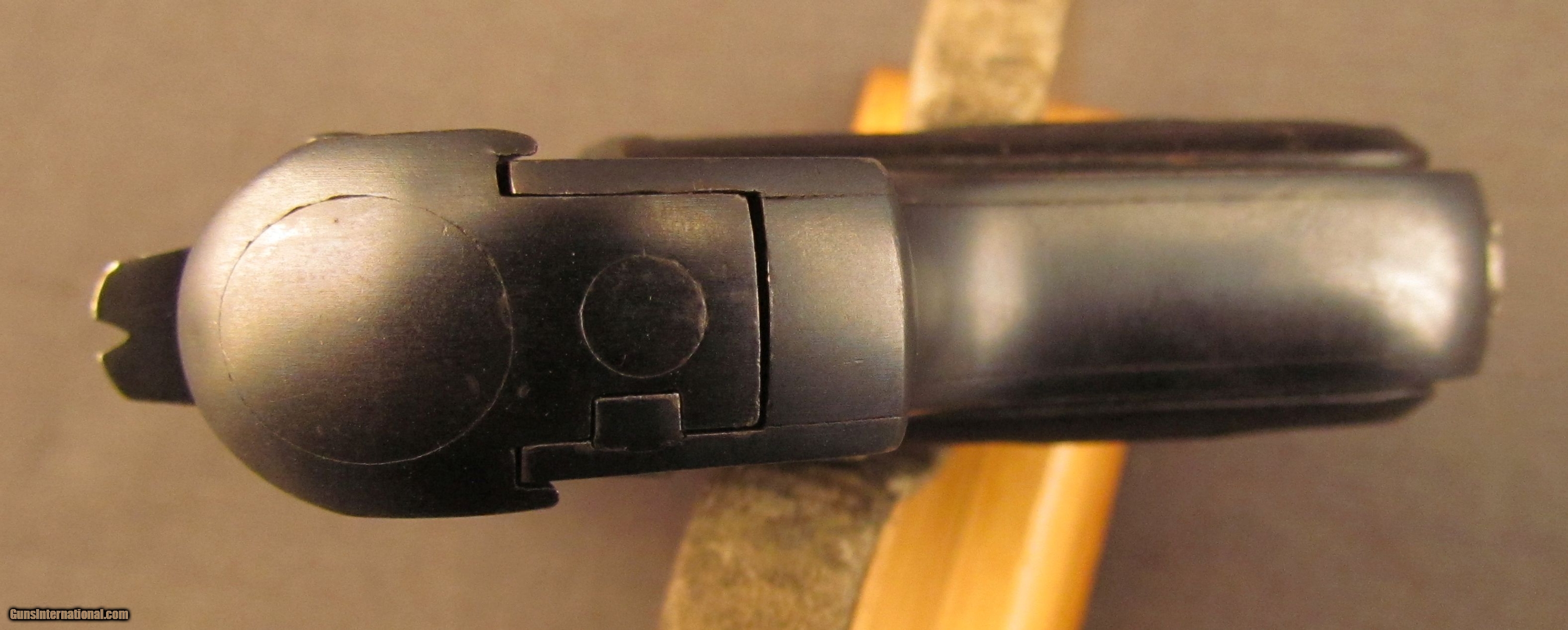 Description: Serial #250651, 7.65mm (.32 ACP), 2” barrel with a fine, bright bore that has some mild freckling within the grooves towards the muzzle. This pistol has matching numbers on the frame and slide and retains 97-98% of the original blue finish with some trace silvering at the muzzle and along the exposed edges. The extractor has nearly all of the original bright fire blue remaining and the “BAYARD” marked horn grips are in nearly excellent shape with very little wear and no stress or drying cracks, and a small chip missing from the top screw on the left panel. The pistol comes with a single original magazine and is in excellent shape overall. FFL or C&R SOLD Curio/Relic: Yes Manufacturer: Pieper Model: Bayard Serial Number: 250651 Caliber Info: .32 ACP Gauge Info: .32 ACP |