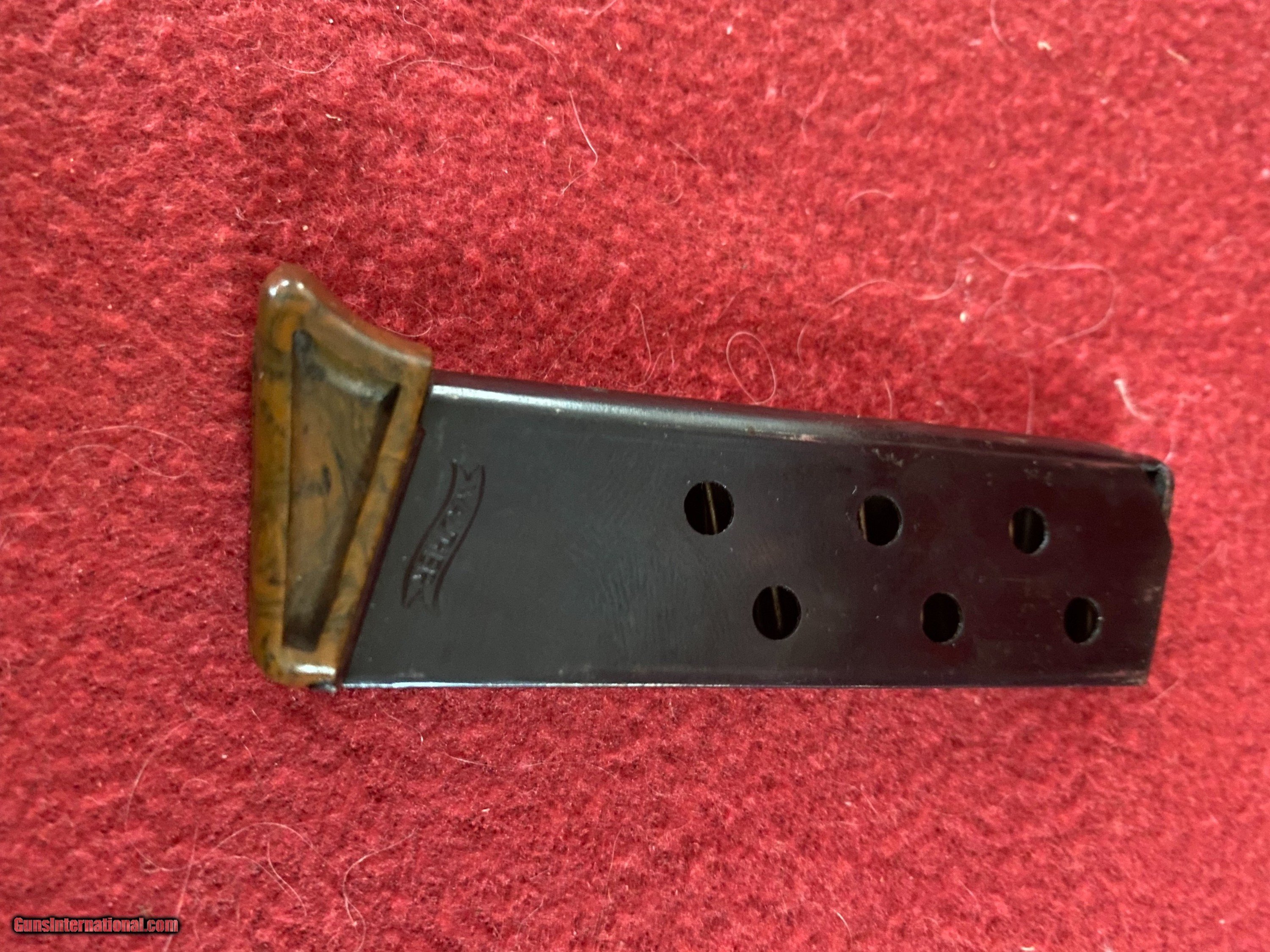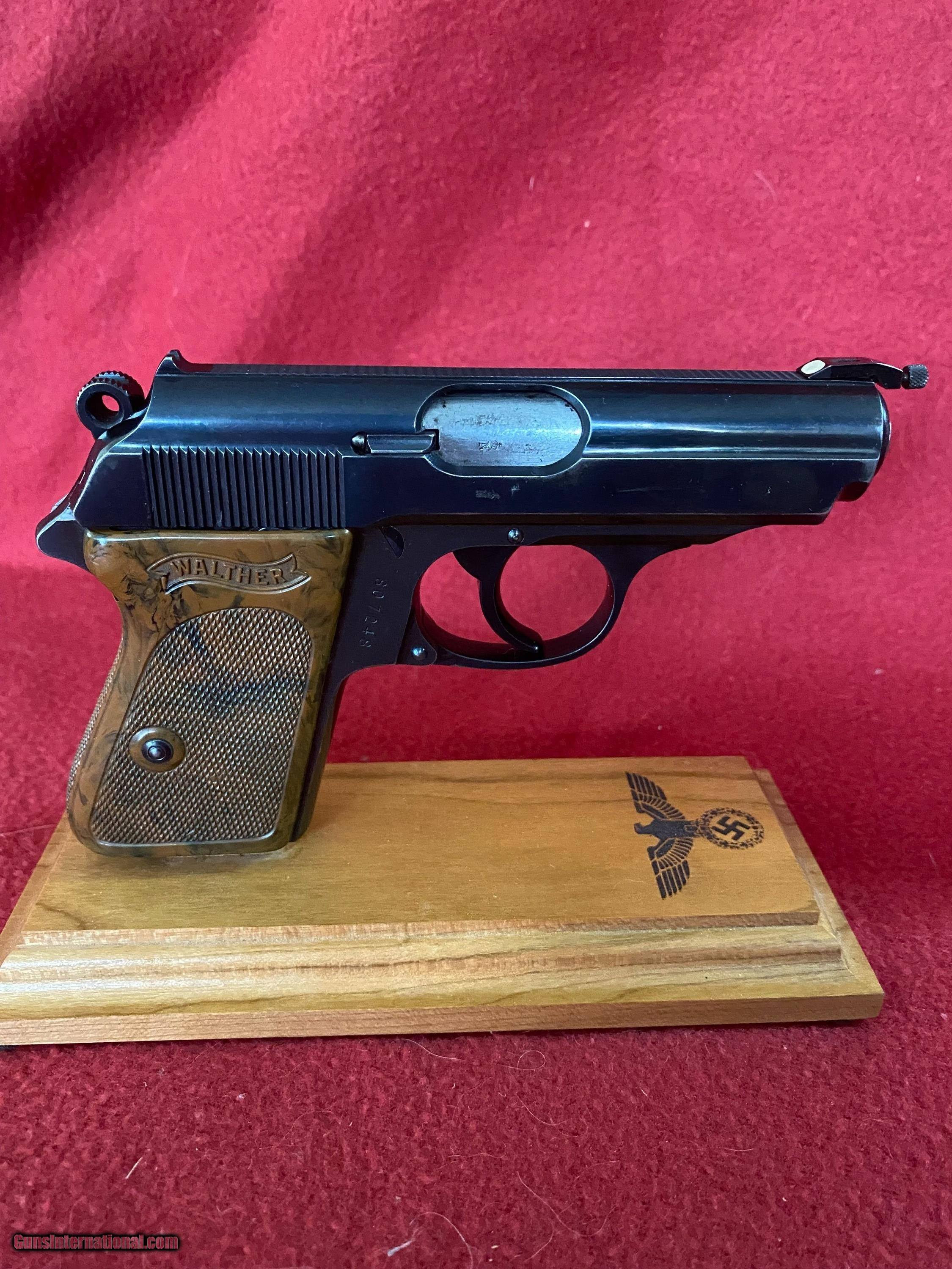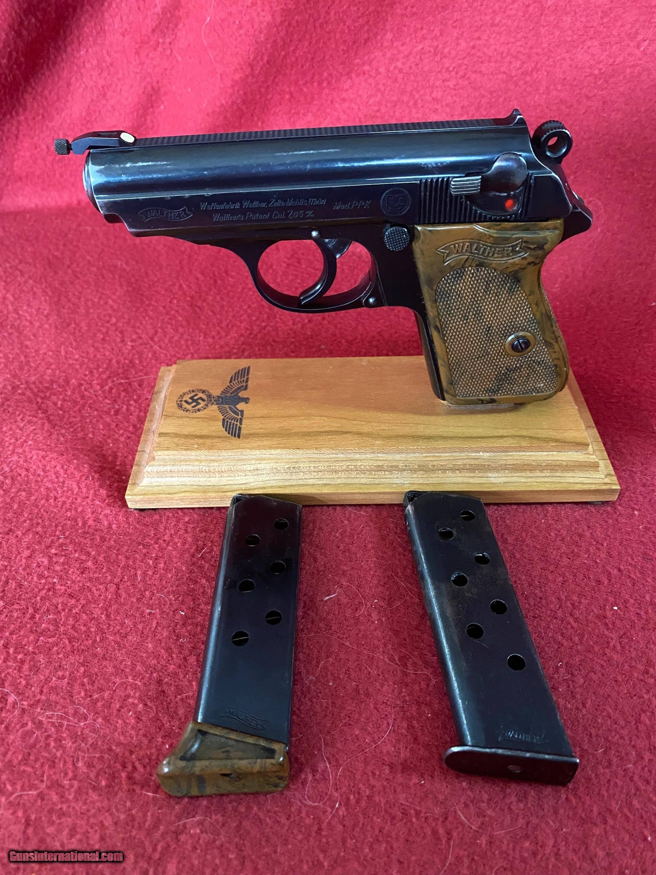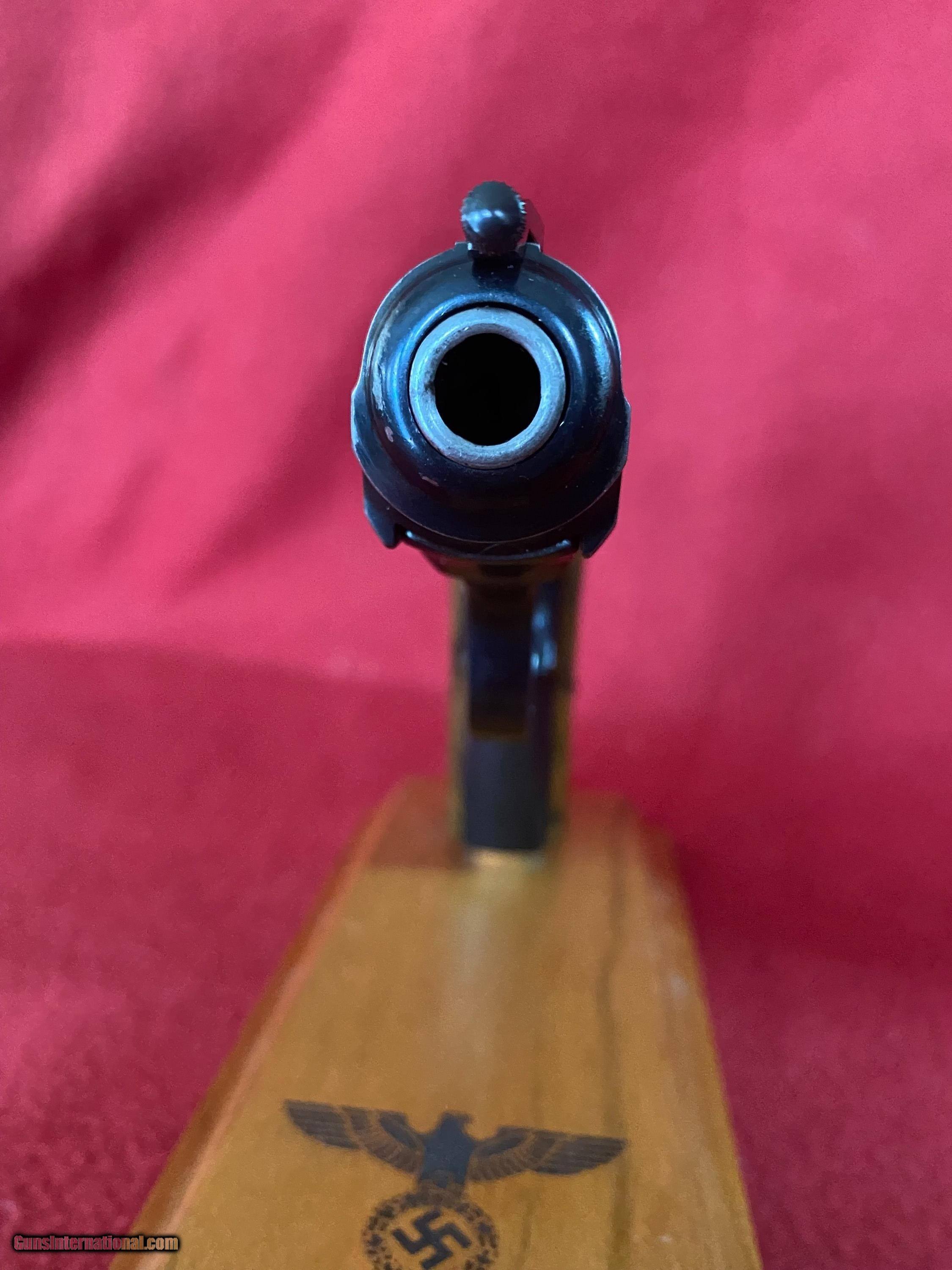Description: WALTHER 807248 PPK RZM "RZM" Marked Pre-World War II Walther PPK Semi-Automatic Pistol Walther PPK Semi-Automatic Pistol and Holster Manufacturer: Walther Model: PPK Gauge: 7.65 mm auto Barrel: 3 1/4 inch round Finish: blue Grip: Excellent, retains 97+ plus of the original blue finish with some very light holster type wear on the leading edges and some very slight thinning on the front strap. The grip is very fine with slight warping on the bottom, minimal handling marks and crisp checkering. Mechanically excellent. The holster is excellent with minimal wear. Description: The Reichszeugmeisterei (RZM) served as the quartermasters office of the National Socialists and later became the chief authority on textiles in the Third Reich. Radium night and notch sights, and standard markings, with "crown/N" proofs on the barrel, chamber hood and slide, and the addition of the etched circular "RZM" logo on the left side of the slide between the model marking and the serrations. Serrated ring hammer, 90 degree safety and checkered brown plastic "WALTHER" banner grips with matching colored grip extension on the magazine. Includes a Leading Edge Holster in excellant shape."D.R.G.M." over the crossed rifle " $50.00 Shipping SHIP TO FFL ONLY SOLD Curio/Relic: Yes Handgun Caliber: .32 ACP (7.65x17mm Browning SR) Manufacturer: Walther Model: PPK Condition: Great Metal Condition: Beautiful Bore Condition: Mint |