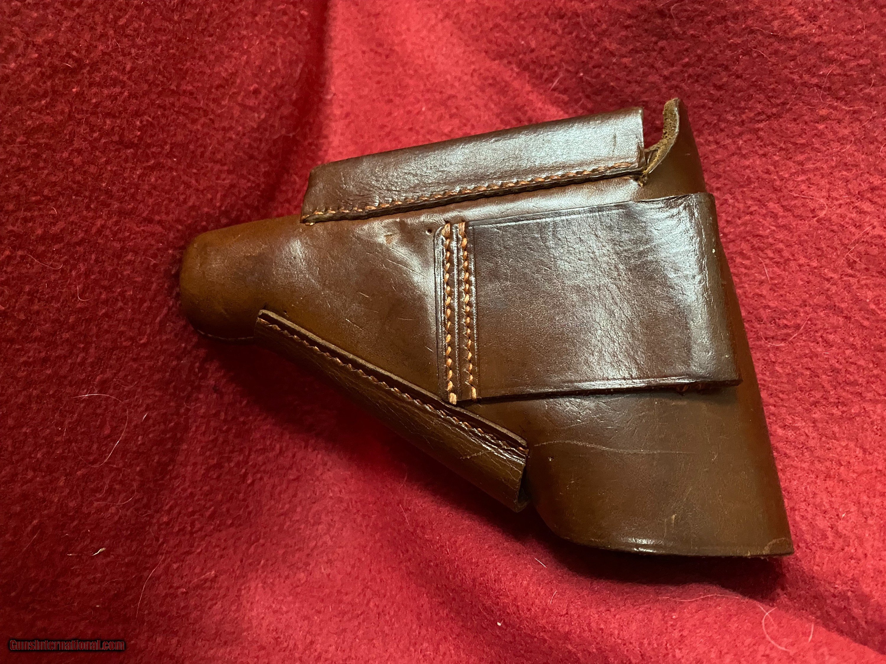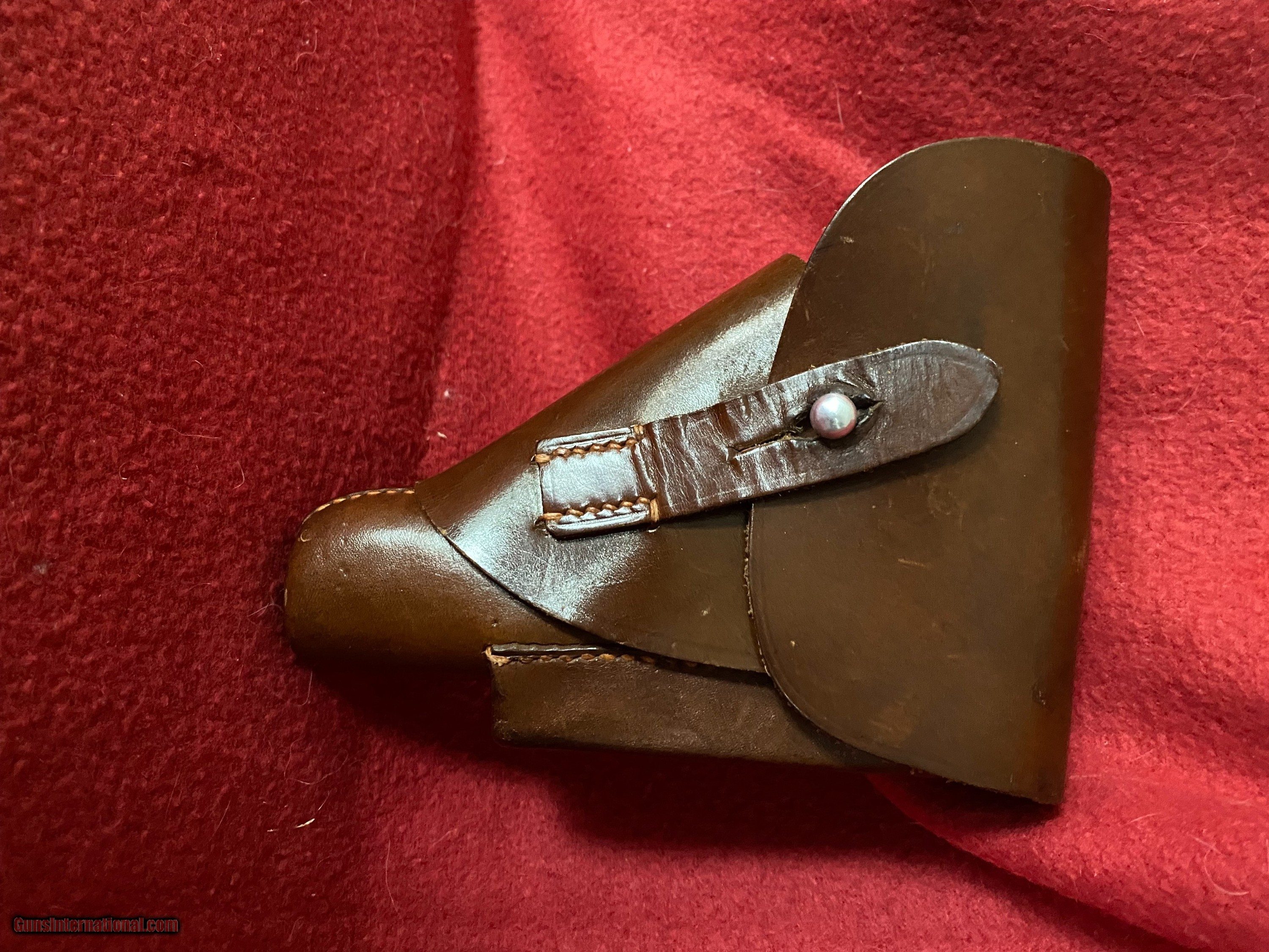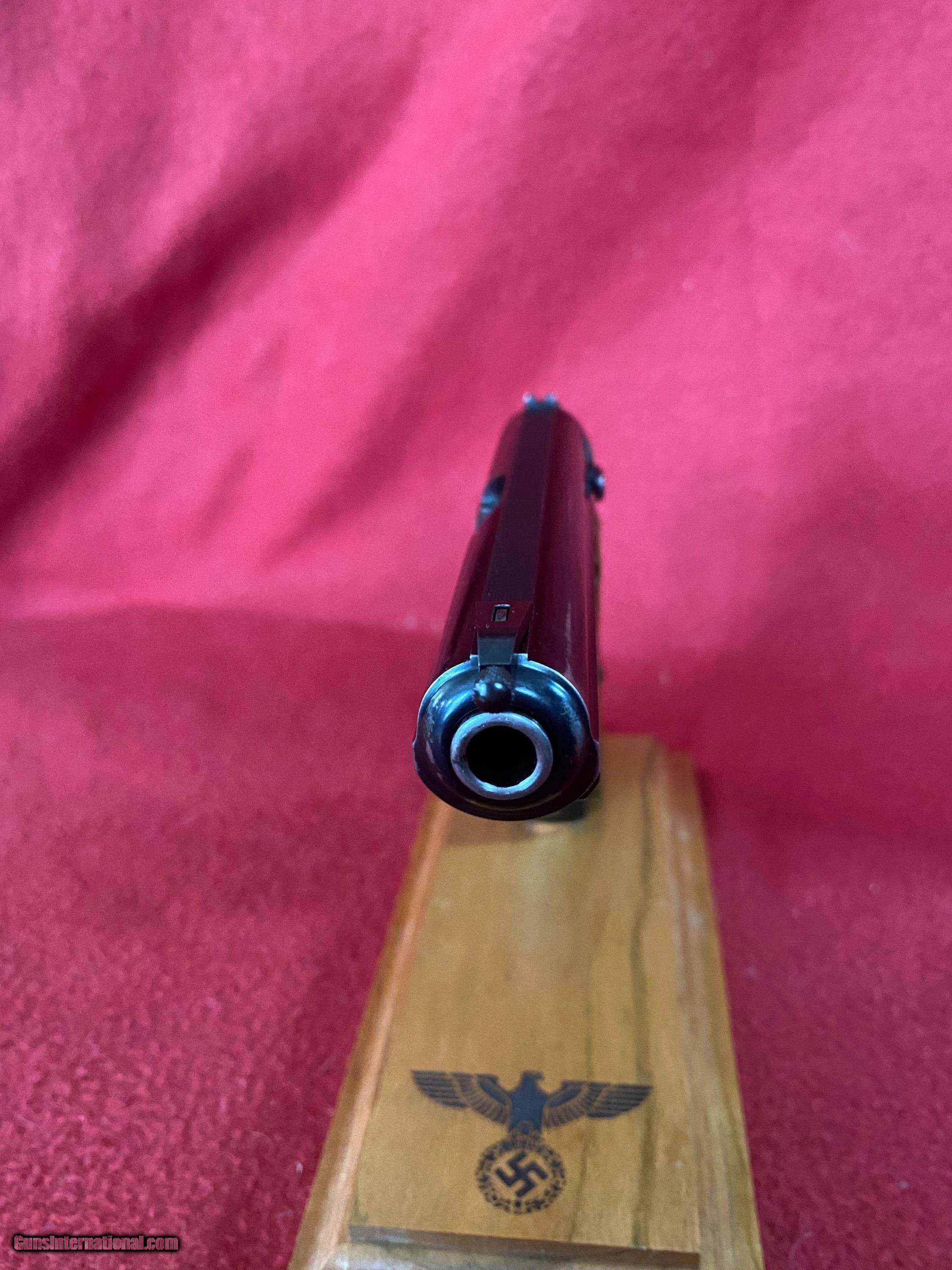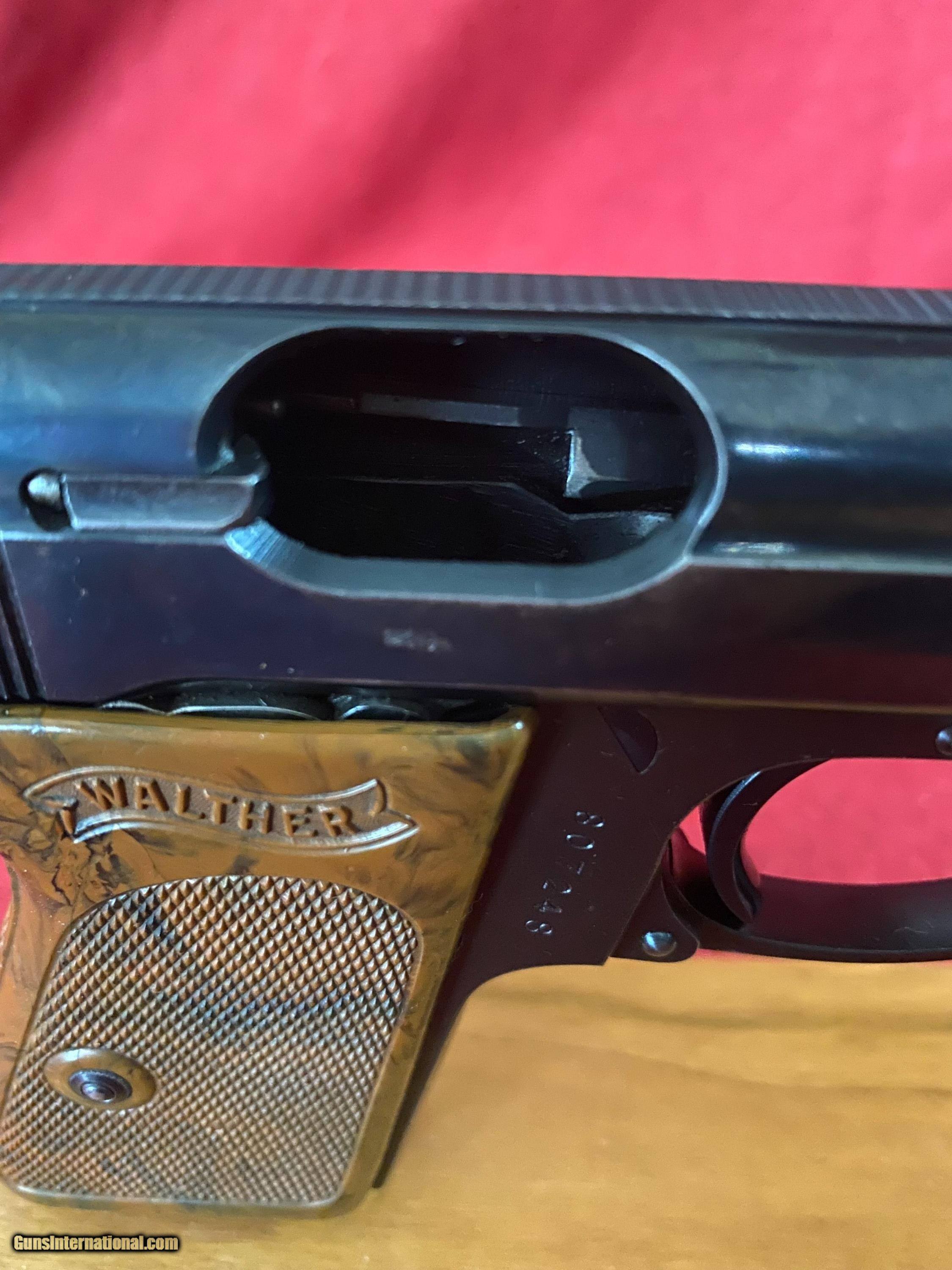 Description: WALTHER 807248 PPK RZM "RZM" Marked Pre-World War II Walther PPK Semi-Automatic Pistol Walther PPK Semi-Automatic Pistol and Holster Manufacturer: Walther Model: PPK Gauge: 7.65 mm auto Barrel: 3 1/4 inch round Finish: blue Grip: Excellent, retains 97+ plus of the original blue finish with some very light holster type wear on the leading edges and some very slight thinning on the front strap. The grip is very fine with slight warping on the bottom, minimal handling marks and crisp checkering. Mechanically excellent. The holster is excellent with minimal wear. Description: The Reichszeugmeisterei (RZM) served as the quartermasters office of the National Socialists and later became the chief authority on textiles in the Third Reich. Radium night and notch sights, and standard markings, with "crown/N" proofs on the barrel, chamber hood and slide, and the addition of the etched circular "RZM" logo on the left side of the slide between the model marking and the serrations. Serrated ring hammer, 90 degree safety and checkered brown plastic "WALTHER" banner grips with matching colored grip extension on the magazine. Includes a Leading Edge Holster in excellant shape."D.R.G.M." over the crossed rifle " $50.00 Shipping SHIP TO FFL ONLY SOLD Curio/Relic: Yes Handgun Caliber: .32 ACP (7.65x17mm Browning SR) Manufacturer: Walther Model: PPK Condition: Great Metal Condition: Beautiful Bore Condition: Mint |