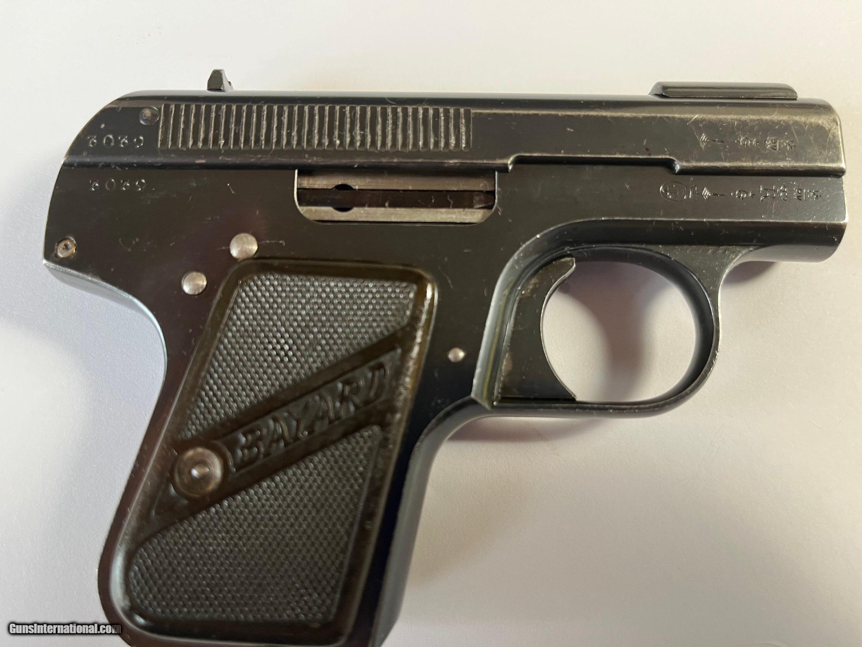 Description: For sale is a very rare Bayard Self Loading Pistol, sometimes referred to as a 1908 Bayard. This is the first varient with only one screw for each grip plate. I have only seen a handful of these in the many years that I have been collecting. I would rate the blue as about 98%, with some typical edge wear. I have test racked the pistol and never fired it. The magazine and the magazine extension are correct for this pistol. Probably made in 1908, given the very low serial number. Stored in a climate controlled safe. Also included is a NOS box of 32 ACP ammo that is period correct, made by SFM. As with all vintage pistols, if you intend to fire this pistol, you should consult a firearms expert. Payment is by USPS Money Order or Bank Certified Check. Pistol ships when the payment clears. Shipping is from my FFL to your FFL, no exceptions. Please see my other Bayard listings. Please contact me if you have any questions. Not for sale to states where not allowed. It is your responsibility to make sure that you can legally purchase this. Curio/Relic: Yes Handgun Caliber: .32 ACP (7.65x17mm Browning SR) Manufacturer: Bayard Pieper Model: 1908 Serial Number: 3039 Condition: Very Good for Age Metal Condition: 98% Bore Condition: Very Good Grips: Excellent Price: $1,350.00 Buy Now Contact Seller |