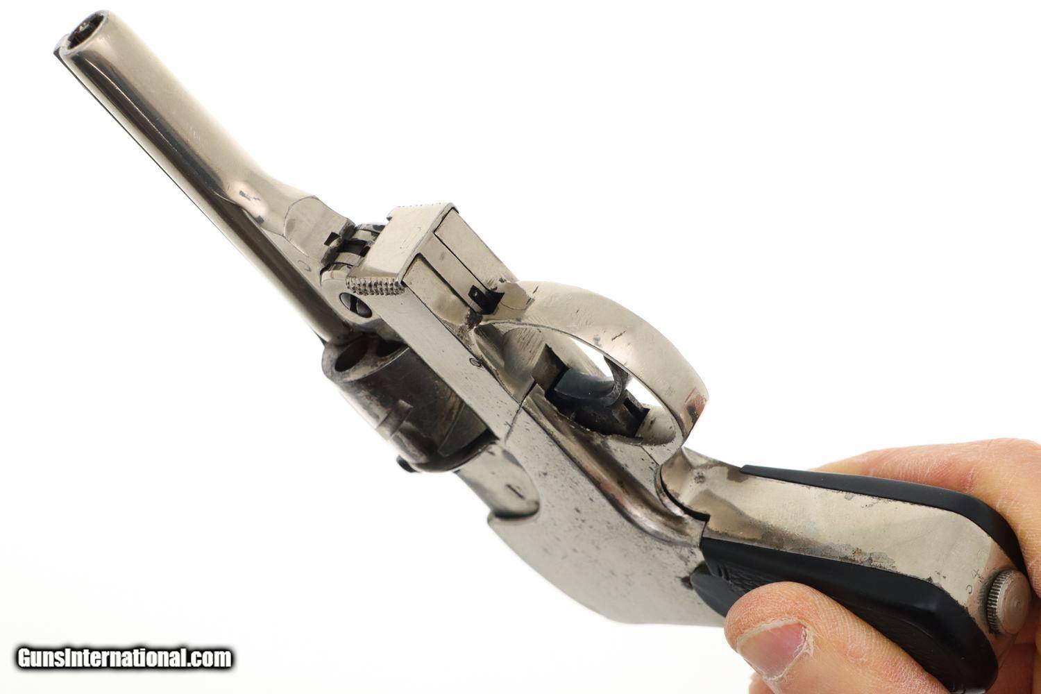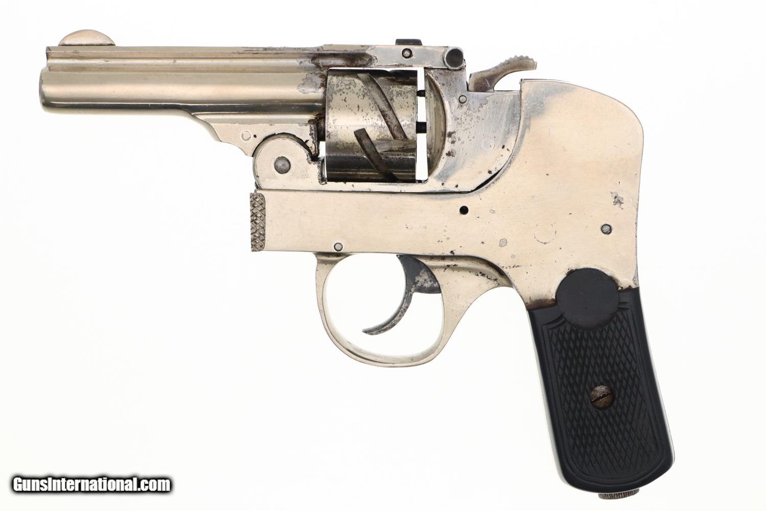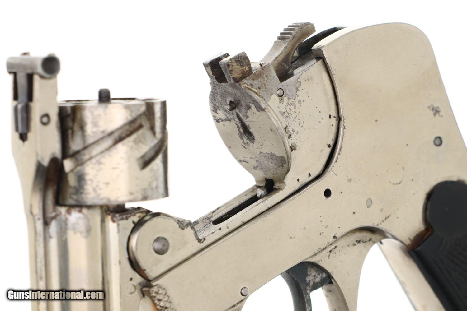 Description: Synopsis: Rare Union Firearms, Semi-Automatic Union Revolver Description: VG all original, all matching (frame, cylinder, and extractor), nickel-plated Union Fire Arms semi-automatic revolver in .32 S&W, made in Toledo, Ohio, production fewer than 300 units, this one SN: 54. Standard configuration revolver with 2 7/8" barrel, fixed front and rear sights. Top break, SA/DA action. Zig-zag cylinder that functions in the same manner as the classic Webley-Fosbery revolver. No manufacturer markings; serial number on base. Factory nickel with color case-hardened hammer and trigger. Black checkered HR grips. Condition: VG, with scattered areas of flaking and discoloration, especially on the cylinder and trigger as carefully imaged. Minimal use as reflected by a very light case imprint on the recoil shield. Slightly dull bore with sharp rifling. Perfect manual mechanics. A super-rare revolver, one of very few made to function as a semi-automatic (Webley-Fosbery, Zulaica, Mateba 6-Unica). ~~Insured shipping fee of $155; most packages shipped using FedEx 2nd Day.~~ SOLD Manufacturer: Union Firearms Serial Number: 54 Caliber Info: .32 S&W |