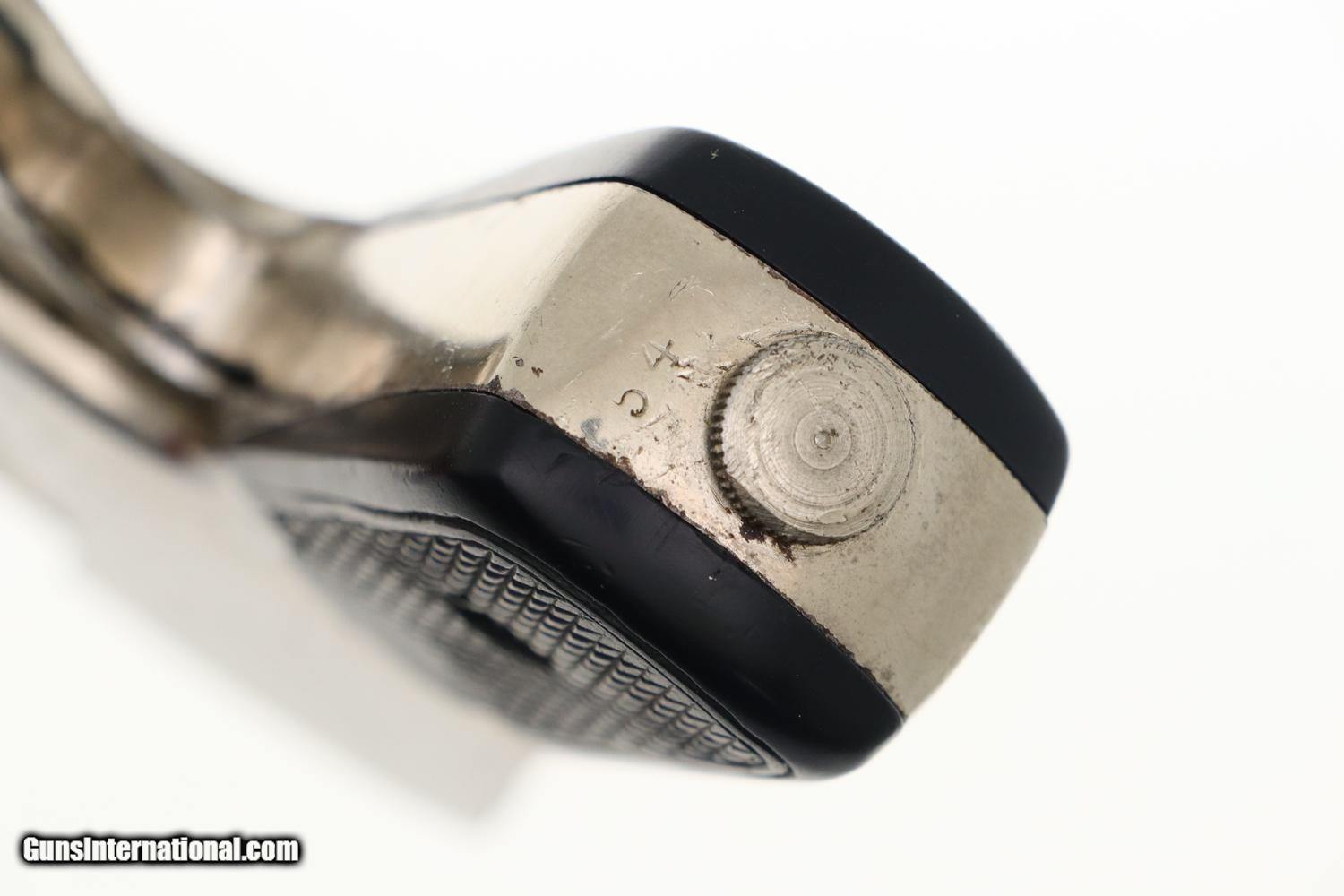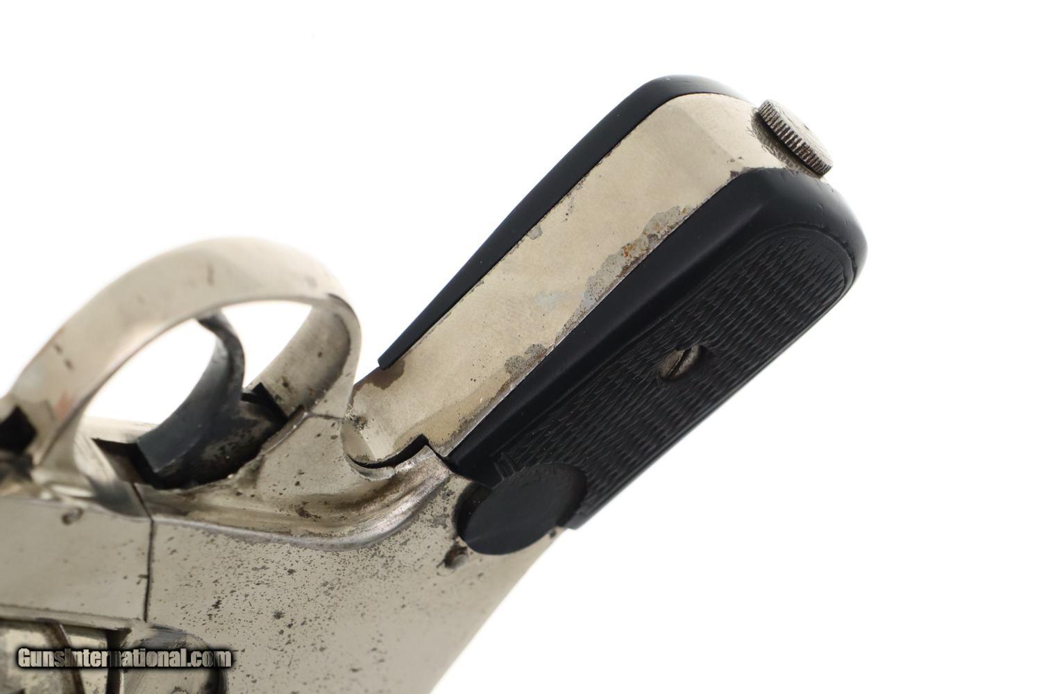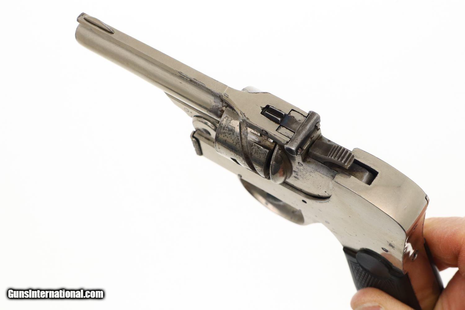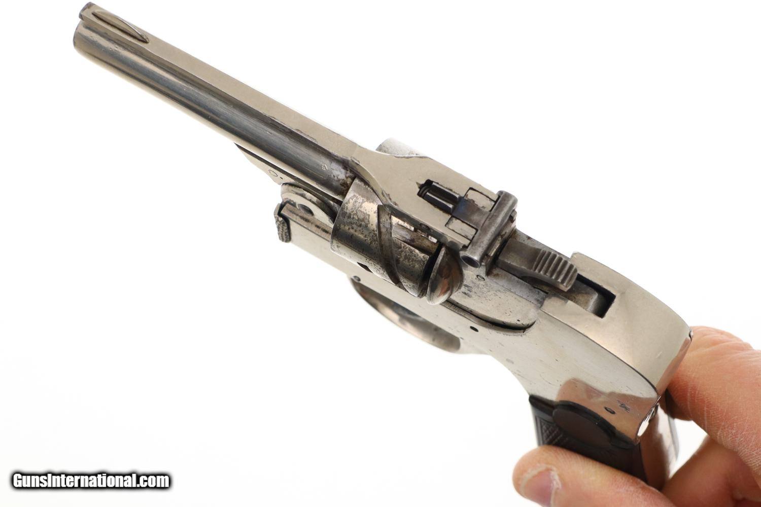 Description: Synopsis: Rare Union Firearms, Semi-Automatic Union Revolver Description: VG all original, all matching (frame, cylinder, and extractor), nickel-plated Union Fire Arms semi-automatic revolver in .32 S&W, made in Toledo, Ohio, production fewer than 300 units, this one SN: 54. Standard configuration revolver with 2 7/8" barrel, fixed front and rear sights. Top break, SA/DA action. Zig-zag cylinder that functions in the same manner as the classic Webley-Fosbery revolver. No manufacturer markings; serial number on base. Factory nickel with color case-hardened hammer and trigger. Black checkered HR grips. Condition: VG, with scattered areas of flaking and discoloration, especially on the cylinder and trigger as carefully imaged. Minimal use as reflected by a very light case imprint on the recoil shield. Slightly dull bore with sharp rifling. Perfect manual mechanics. A super-rare revolver, one of very few made to function as a semi-automatic (Webley-Fosbery, Zulaica, Mateba 6-Unica). ~~Insured shipping fee of $155; most packages shipped using FedEx 2nd Day.~~ SOLD Manufacturer: Union Firearms Serial Number: 54 Caliber Info: .32 S&W |