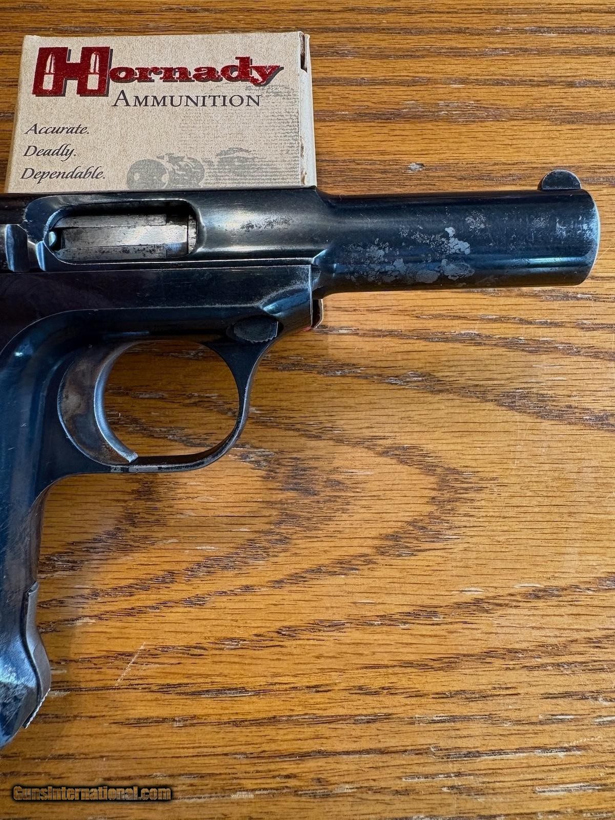Description: Exceptional rare Savage 1915 pistol manufactured from 1915 to 1916 with only 6,500 made in 32 ACP. It has the standard blade and notch sights, grip safety, shrouded trigger, slide lock back on empty, with very good grips. The bluing is the deep lustrous color of the old savages. The left side of the barrel is missing some bluing and there is spotting on the right side. Excellent case color on the trigger. Has one original ten round magazine. Curio/Relic: Yes Handgun Caliber: .32 ACP (7.65x17mm Browning SR) Price: $850.00 Shipping: $35.00 Contact Seller |