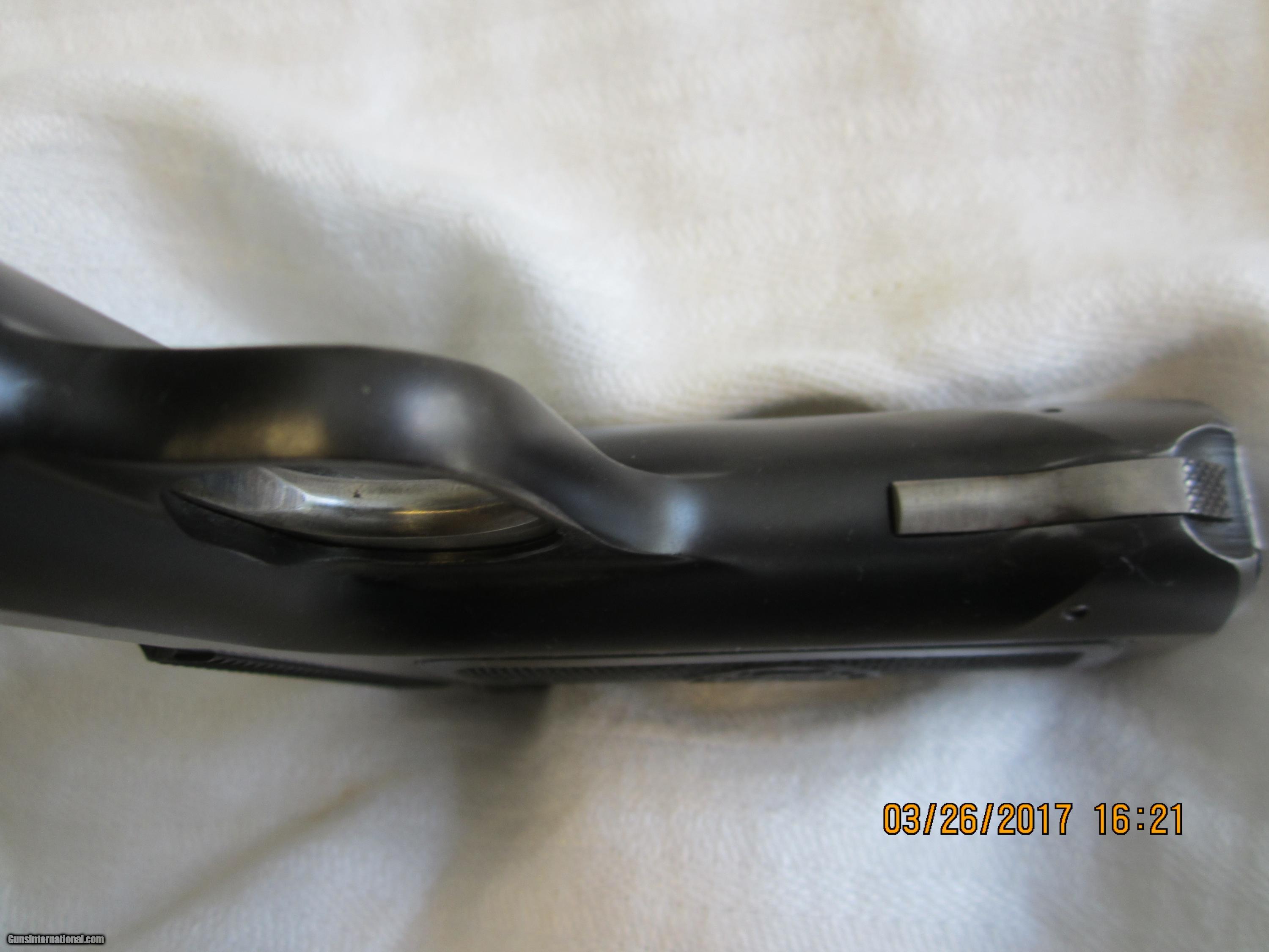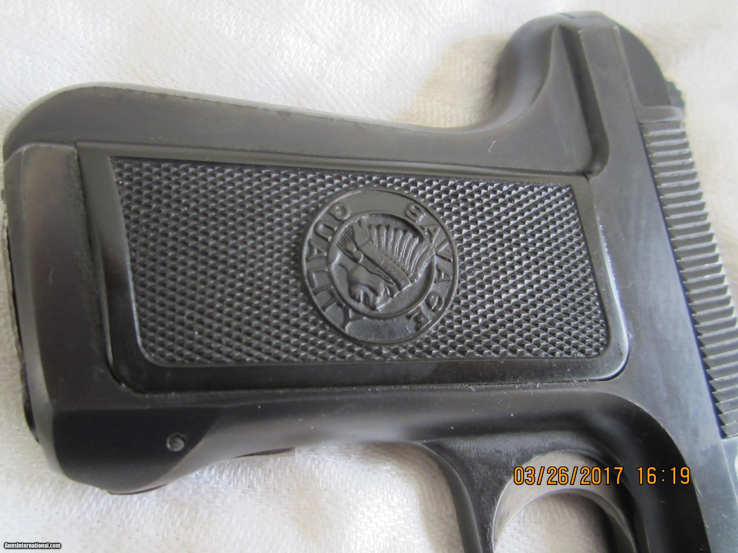 Description: A neat little well made pocket pistol in .32 caliber (7.65mm) that looks almost new although it could be 100 years old. About 96 to 98% of the blued metal finish remains and the grips look even better Both grips contain the Savage "Indian Head" logo showing no wear. . The action is strong and the bore is bright and shiney with lots of sharp rifling.The spur hammer is exposed and there is a slide "hold open" lever. This unique pistol was made entirely without any screws. Only 20,980 were made. It holds 10 rounds. The barrel is about 3 & 1/2 " long.. Transfers must go through an FFL holder. NOTE; PRICE REDUCED ! SOLD Curio/Relic: Yes Manufacturer: Savage Arms Corp. ,Utica, N.Y,, USA Model: Model 1907 Serial Number: 202493 Caliber Info: .32 Bore: rifled Condition: 96-98% Metal Condition: 96-98% Wood Condition: Hard rubber grips Bore Condition: Bright & sharp Barrels: one Barrel Type: round Action: semi-automatic Triggers: one Finish: Blued Sights: front & rear Manufacture Date: 1910-1928 Engraving: none Extras: zip up carry bag Item Location: California |