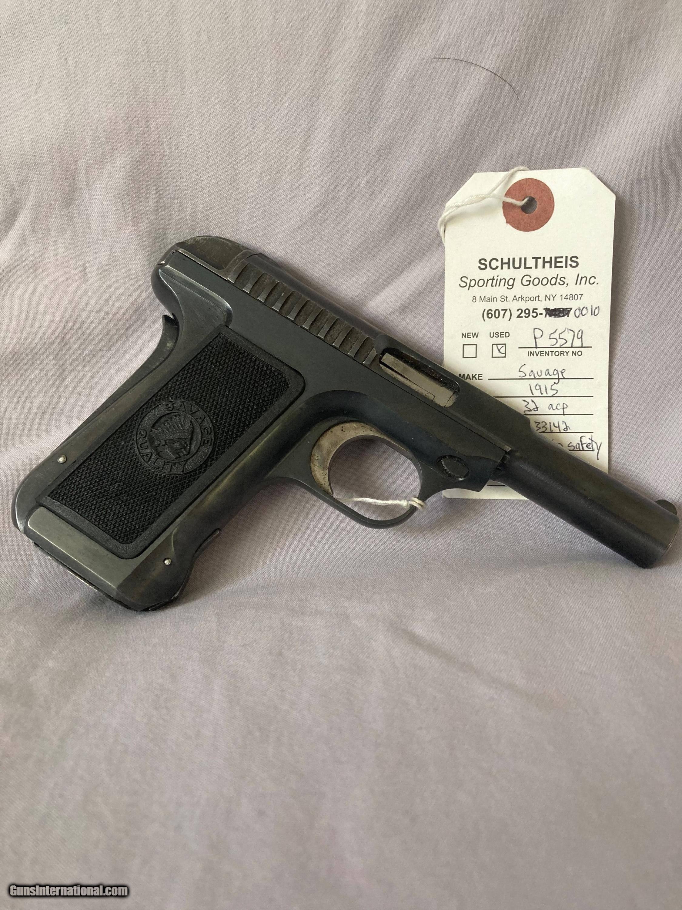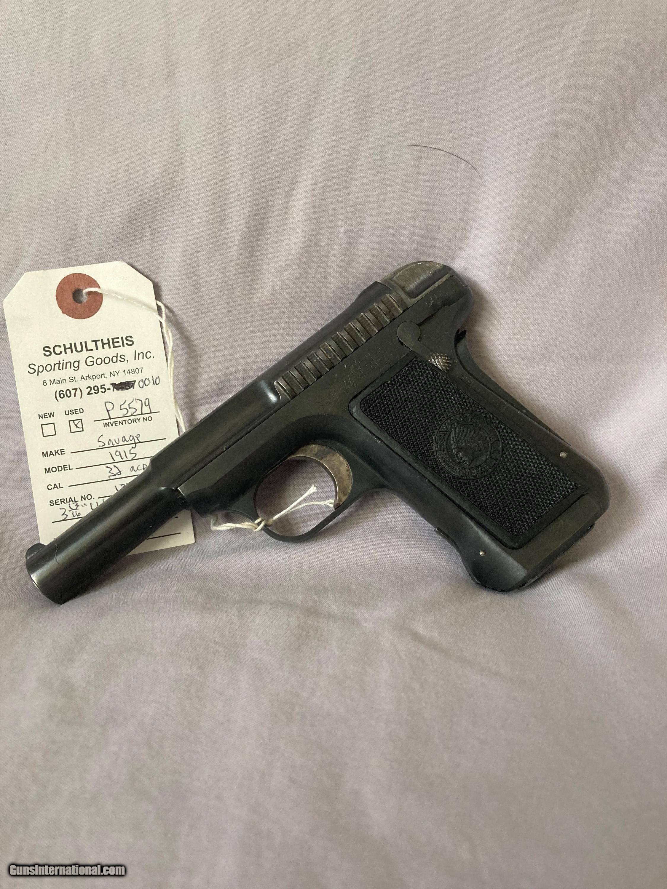 Description: Savage Model 1915 Hammerless, grip safety, 32acp, serial #133XXX, aftermarket grips with Savage Quality emblem, professionally fitted and look original, a small area of light pitting on the left side near the Savage name, 95% original blue, excellent bore and excellent original magazine. ($30.00 shipping) SOLD |