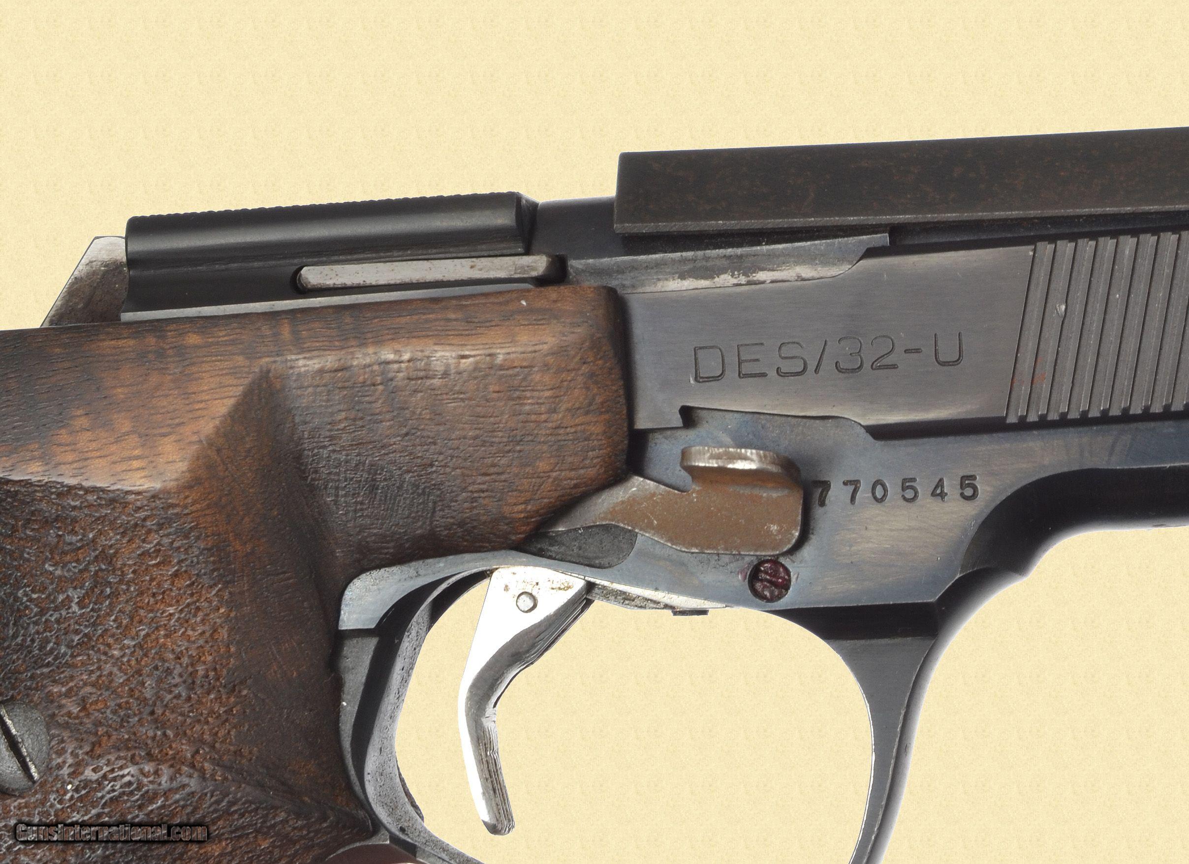 Description: 32 Wad Cutter; 80% blue, excellent bore, good grips, 6'' barrel, Manufactured in France. Original blued finish and stippled walnut target grips with adjustable palm rest. Factory magazine. Fixed front and fully adjustable rear sights. Adjustable trigger. Grooved front grip frame strap. Barrel weight attached. Used, showing some wear and handling, most finish loss on the grip frame. Mechanically fine. SOLD Serial Number: 770545 |