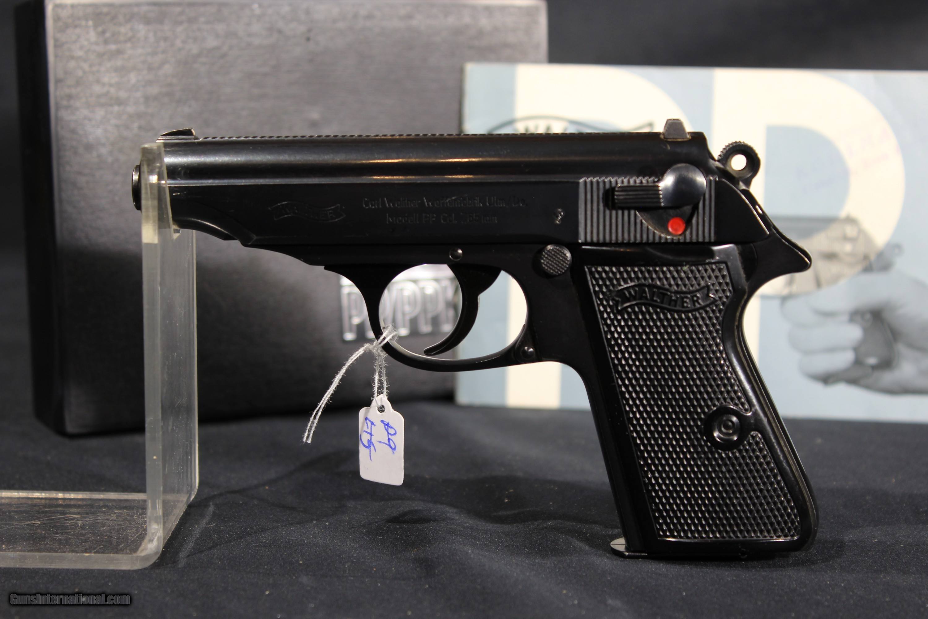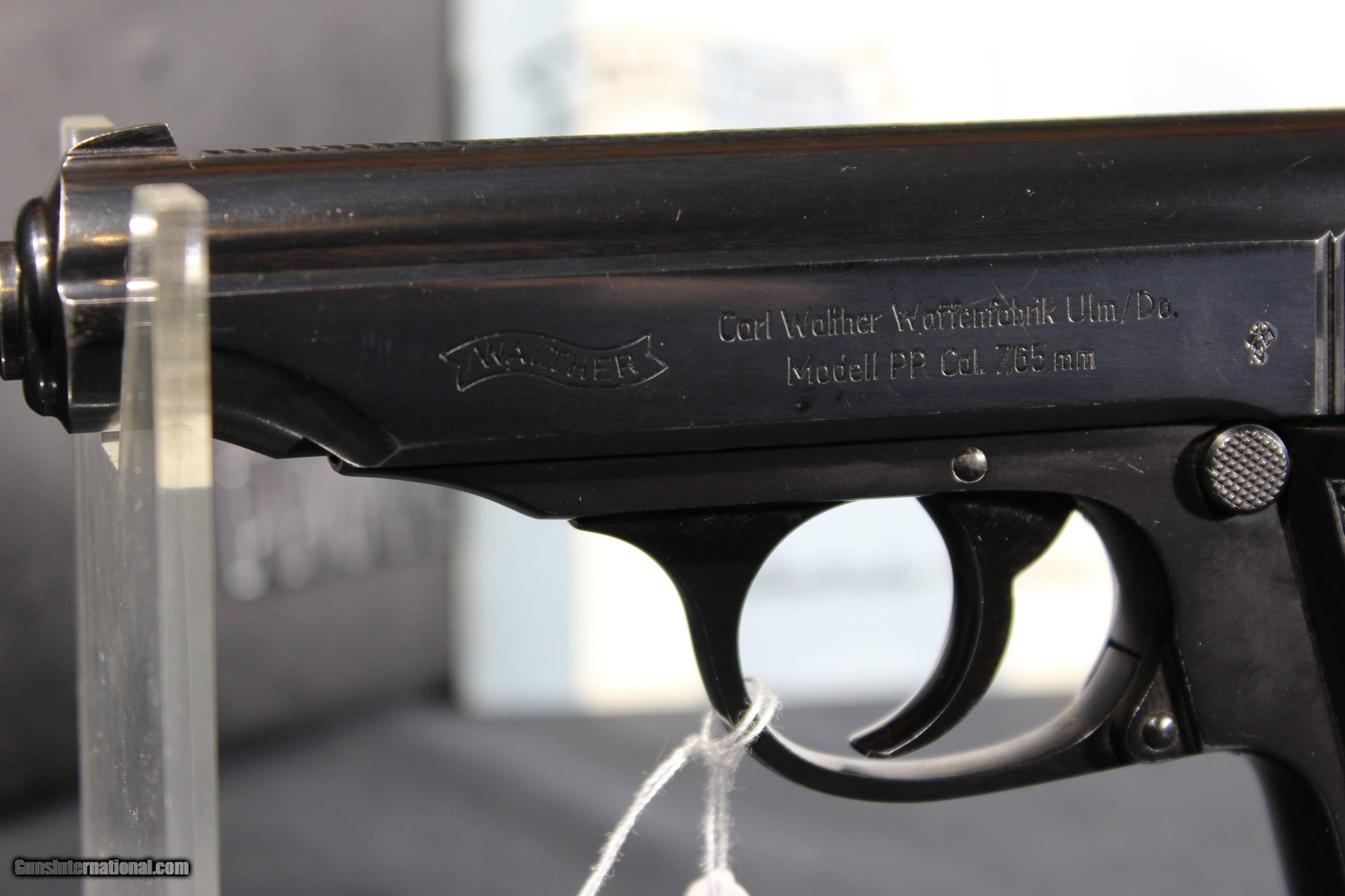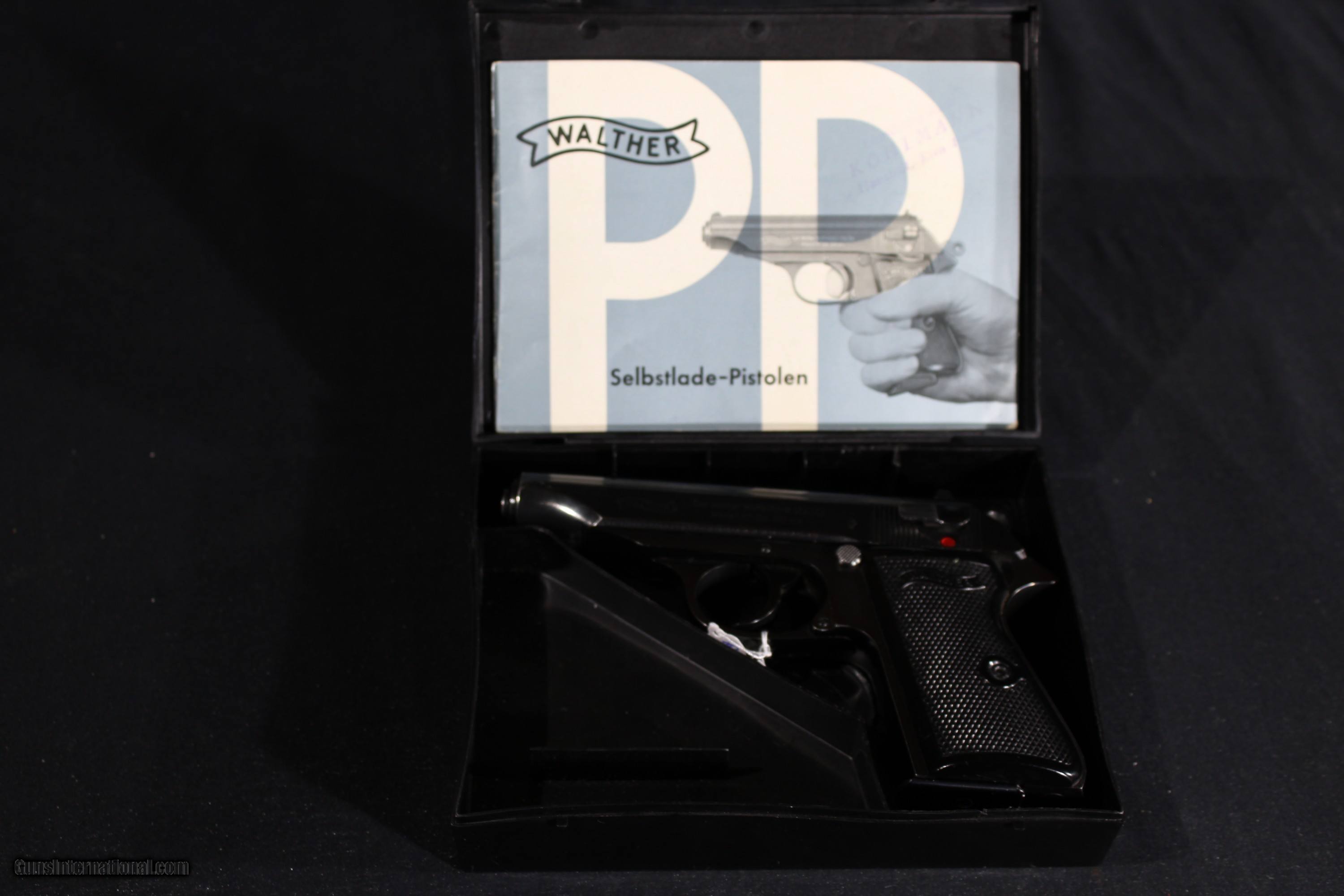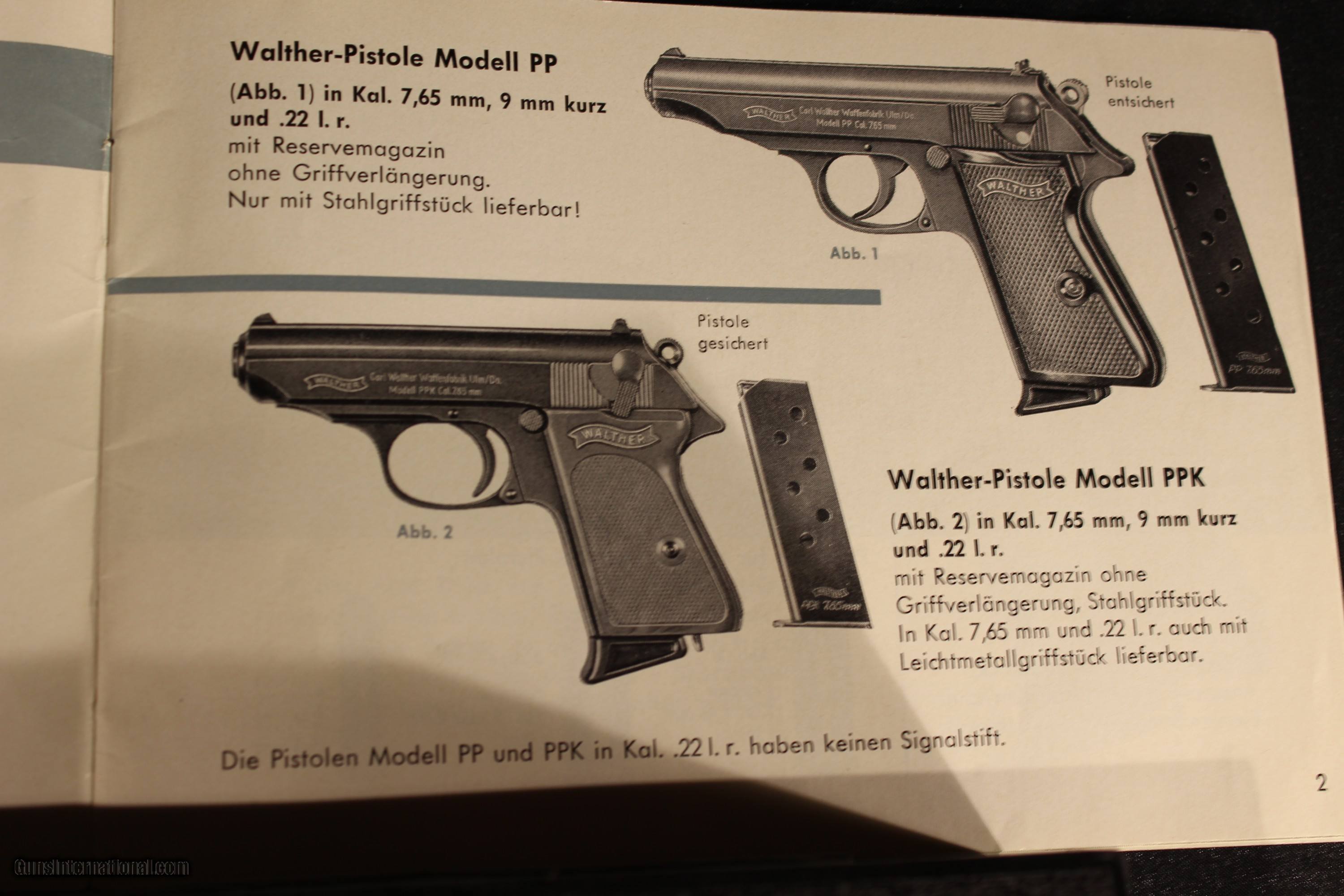 Description: Walther PP 32acp 3.9'' barrel, WALTHER ULM PP IN 32 MADE IN 1969 IN NEAR NEW CONDITION. THE BRIGHT ORIGINAL BLUING IS NEAR FLAWLESS. THE BORE IS MIRROR BRIGHT WITH EXCELLENT RIFLING. THE CHECKERED BLACK PLASTIC GRIPS ARE EXCELLENT. Gun comes in black plastic case and with German manual. SOLD The Walther PP (German: Polizeipistole, or police pistol) series pistols are blowback-operated semi-automatic pistols, developed by the German arms manufacturer Carl Walther GmbH Sportwaffen.[9] It features an exposed hammer, a traditional double-action trigger mechanism,[10] a single-column magazine, and a fixed barrel that also acts as the guide rod for the recoil spring. The series includes the Walther PP, PPK, PPK/S, and PPK/E models. The Walther TPH pocket pistol is a smaller calibre pistol introduced in 1971 which is identical in handling and operation to the PPK. Various PP series are manufactured in Germany, France and the United States.[11] In the past, the PPK version was manufactured by Walther in its own factory in Germany, as well as under licenses by Manurhin in France; Interarms in Virginia, and by Smith & Wesson in Maine. Since 2018, PPK and PPK/S models have been built at the factory of US-based subsidiary Walther Arms, Inc.[12][13] The PP and the PPK were among the world's first successful double action semi-automatic pistols. The PPK is still manufactured by Walther, but the PP went out of production in 1999 and have been widely copied. The design inspired other pistols, among them the Soviet Makarov, the Hungarian FEG PA-63, the Polish P-64, the American Accu-Tek AT-380 II, and the Argentinian Bersa Thunder 380. The PP and PPK were both popular with European police and civilians for being reliable and concealable. During World War II, they were issued to the German military (officers), including the Luftwaffe, as well as the uniformed Ordnungspolizei and plainclothes detectives of the Kriminalpolizei.[1] SOLD Handgun Caliber: .32 ACP (7.65x17mm Browning SR) Manufacturer: Walther Model: PP Serial Number: 385986 Barrel Length: 4 Condition: Excellent Metal Condition: vg Bore Condition: Excellent |