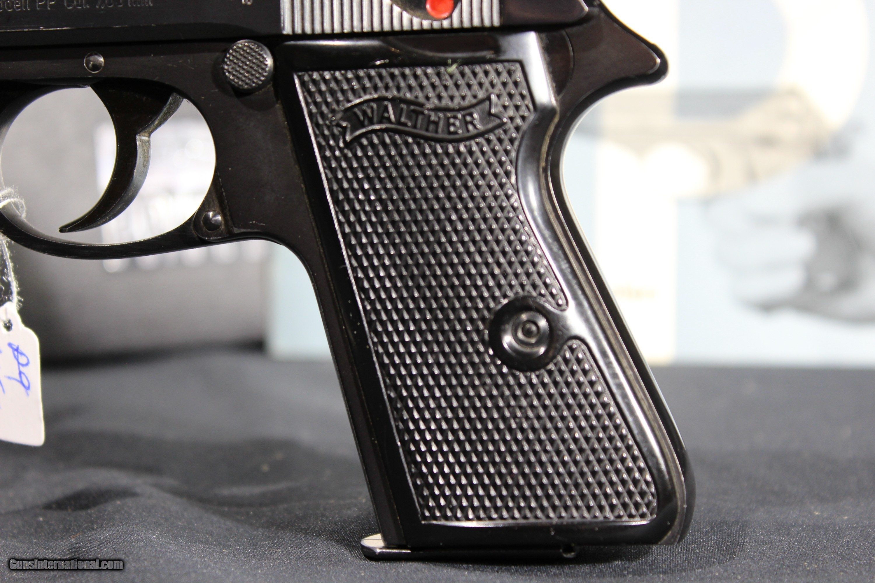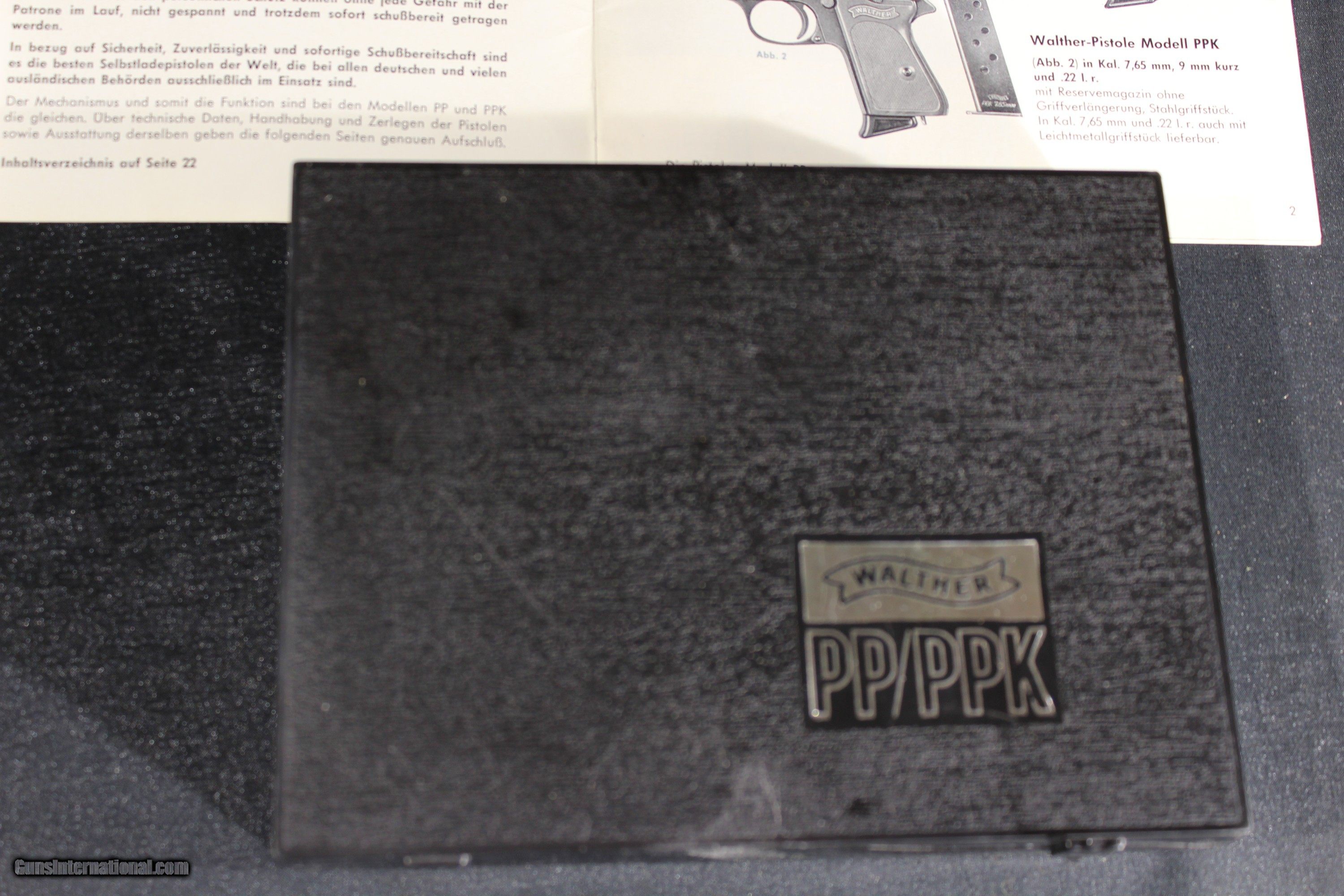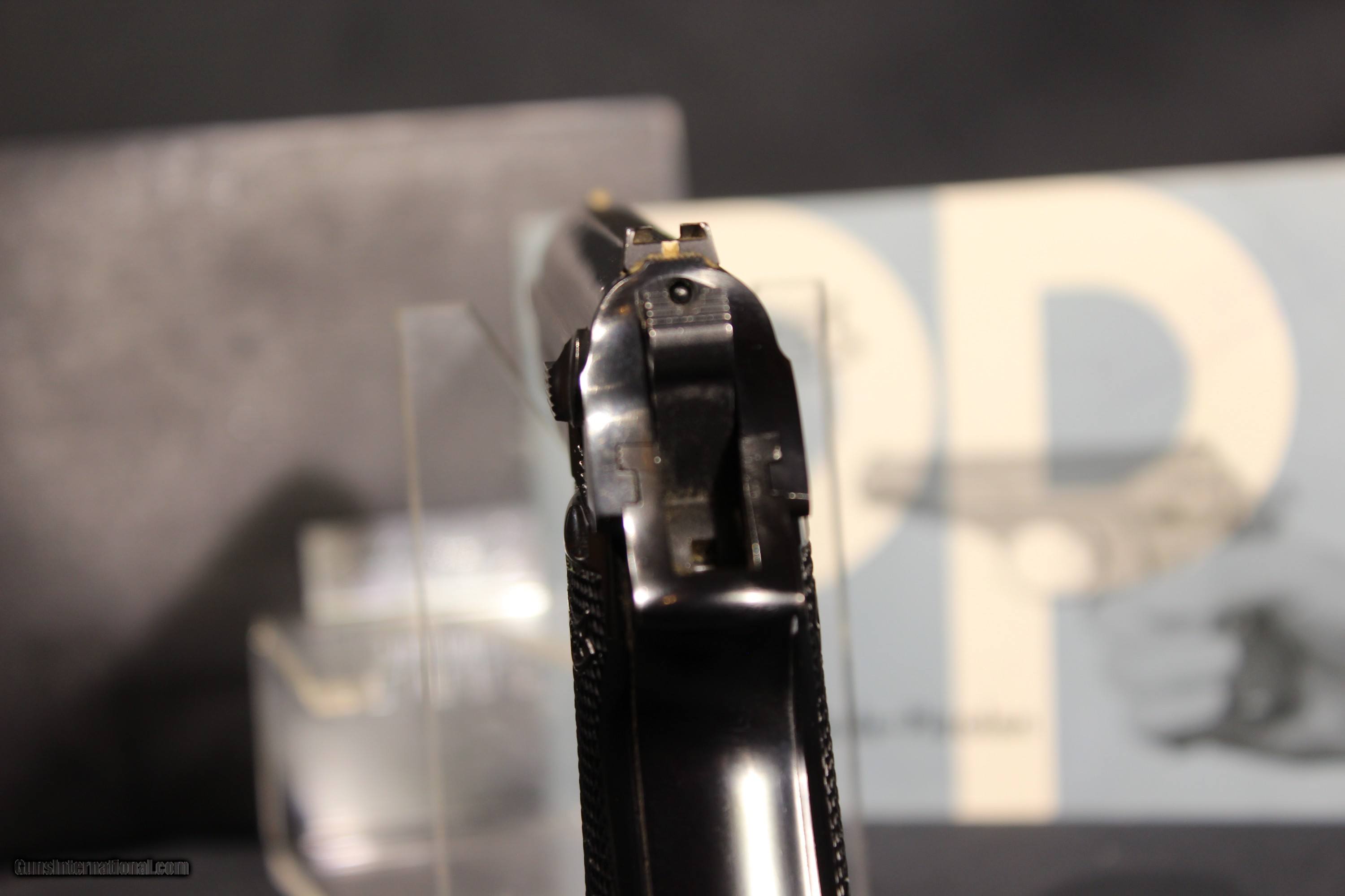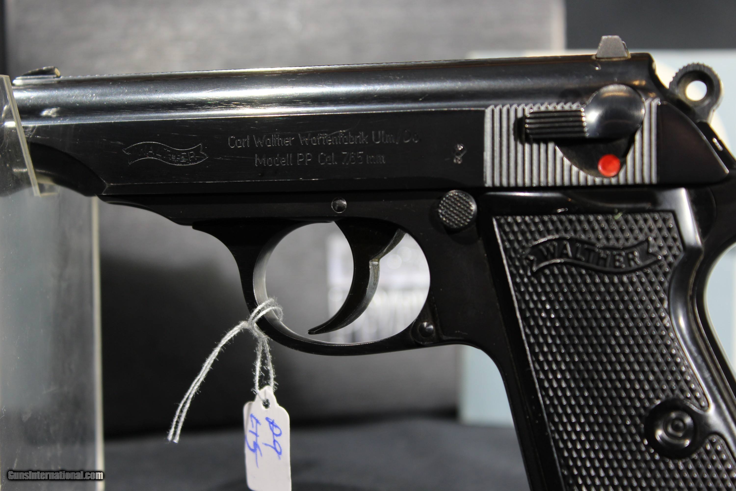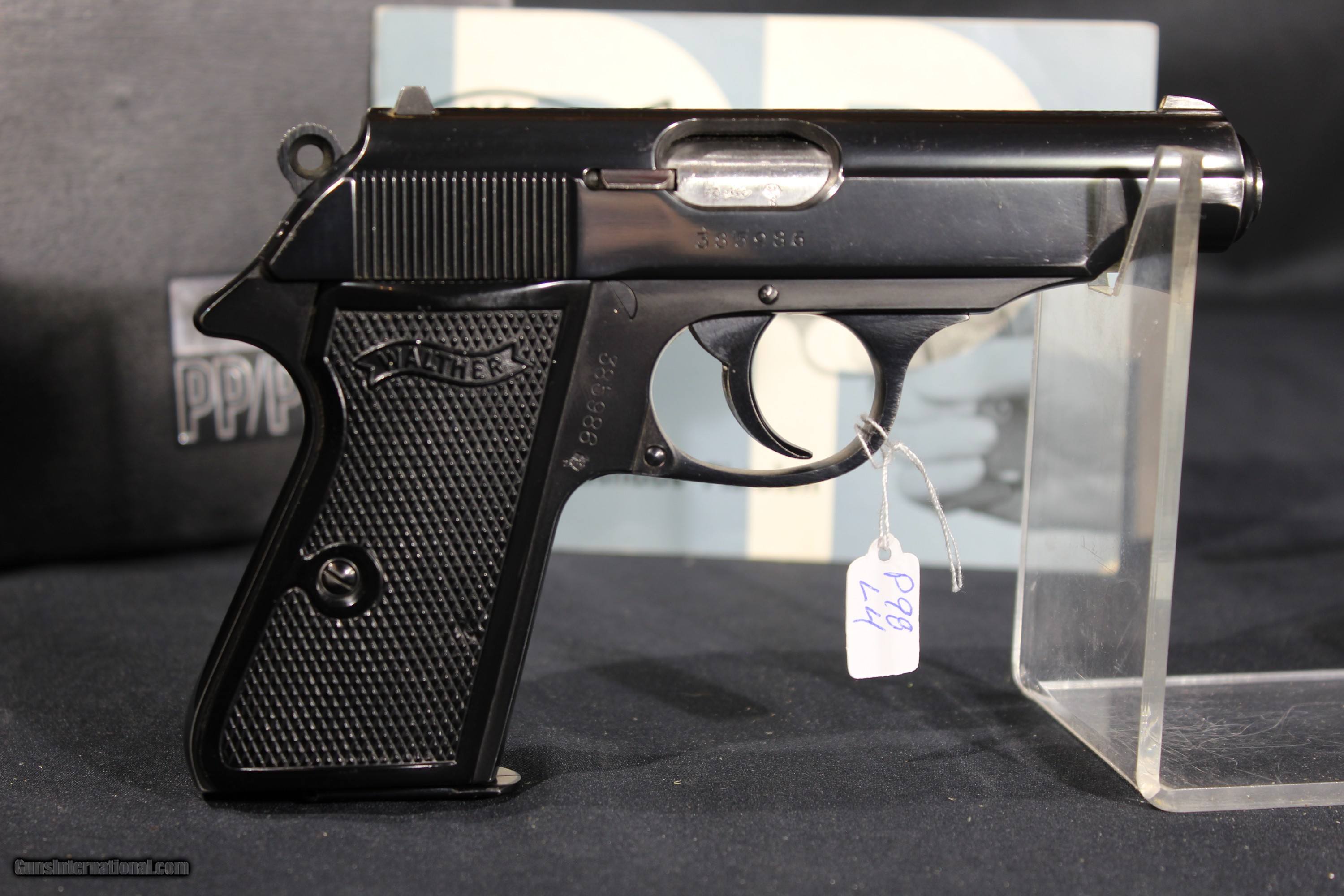 Description: Walther PP 32acp 3.9'' barrel, WALTHER ULM PP IN 32 MADE IN 1969 IN NEAR NEW CONDITION. THE BRIGHT ORIGINAL BLUING IS NEAR FLAWLESS. THE BORE IS MIRROR BRIGHT WITH EXCELLENT RIFLING. THE CHECKERED BLACK PLASTIC GRIPS ARE EXCELLENT. Gun comes in black plastic case and with German manual. SOLD The Walther PP (German: Polizeipistole, or police pistol) series pistols are blowback-operated semi-automatic pistols, developed by the German arms manufacturer Carl Walther GmbH Sportwaffen.[9] It features an exposed hammer, a traditional double-action trigger mechanism,[10] a single-column magazine, and a fixed barrel that also acts as the guide rod for the recoil spring. The series includes the Walther PP, PPK, PPK/S, and PPK/E models. The Walther TPH pocket pistol is a smaller calibre pistol introduced in 1971 which is identical in handling and operation to the PPK. Various PP series are manufactured in Germany, France and the United States.[11] In the past, the PPK version was manufactured by Walther in its own factory in Germany, as well as under licenses by Manurhin in France; Interarms in Virginia, and by Smith & Wesson in Maine. Since 2018, PPK and PPK/S models have been built at the factory of US-based subsidiary Walther Arms, Inc.[12][13] The PP and the PPK were among the world's first successful double action semi-automatic pistols. The PPK is still manufactured by Walther, but the PP went out of production in 1999 and have been widely copied. The design inspired other pistols, among them the Soviet Makarov, the Hungarian FEG PA-63, the Polish P-64, the American Accu-Tek AT-380 II, and the Argentinian Bersa Thunder 380. The PP and PPK were both popular with European police and civilians for being reliable and concealable. During World War II, they were issued to the German military (officers), including the Luftwaffe, as well as the uniformed Ordnungspolizei and plainclothes detectives of the Kriminalpolizei.[1] SOLD Handgun Caliber: .32 ACP (7.65x17mm Browning SR) Manufacturer: Walther Model: PP Serial Number: 385986 Barrel Length: 4 Condition: Excellent Metal Condition: vg Bore Condition: Excellent |