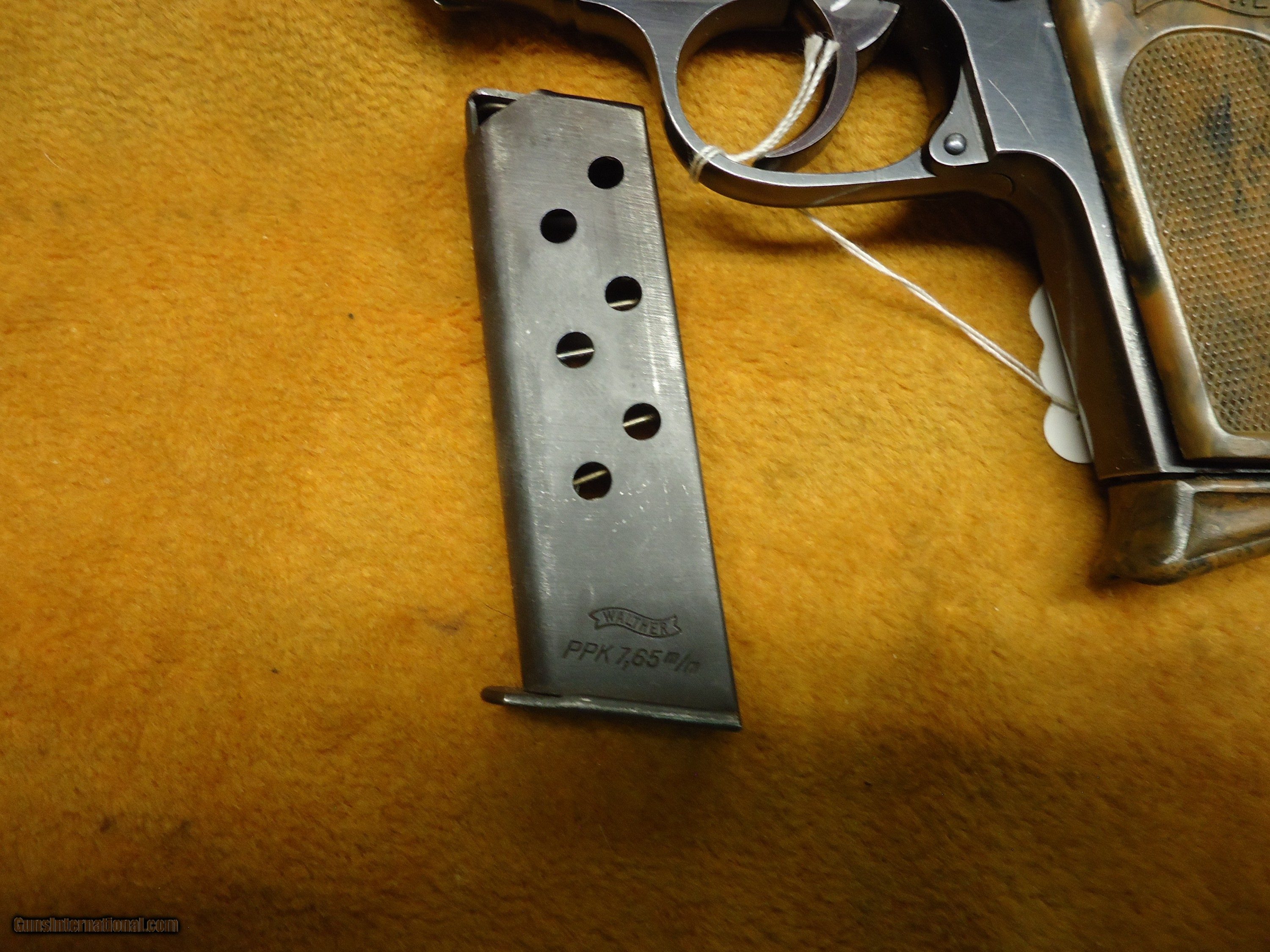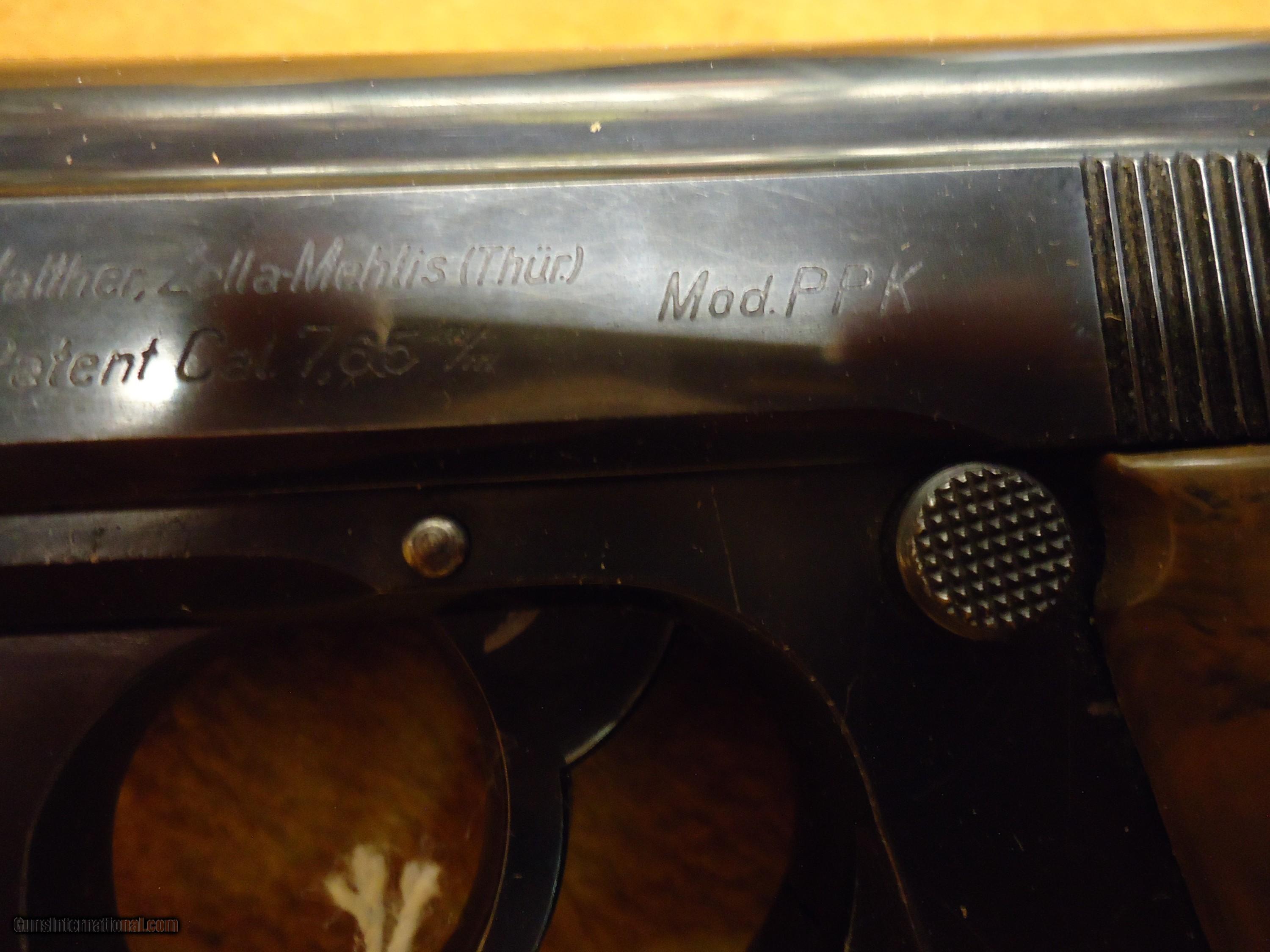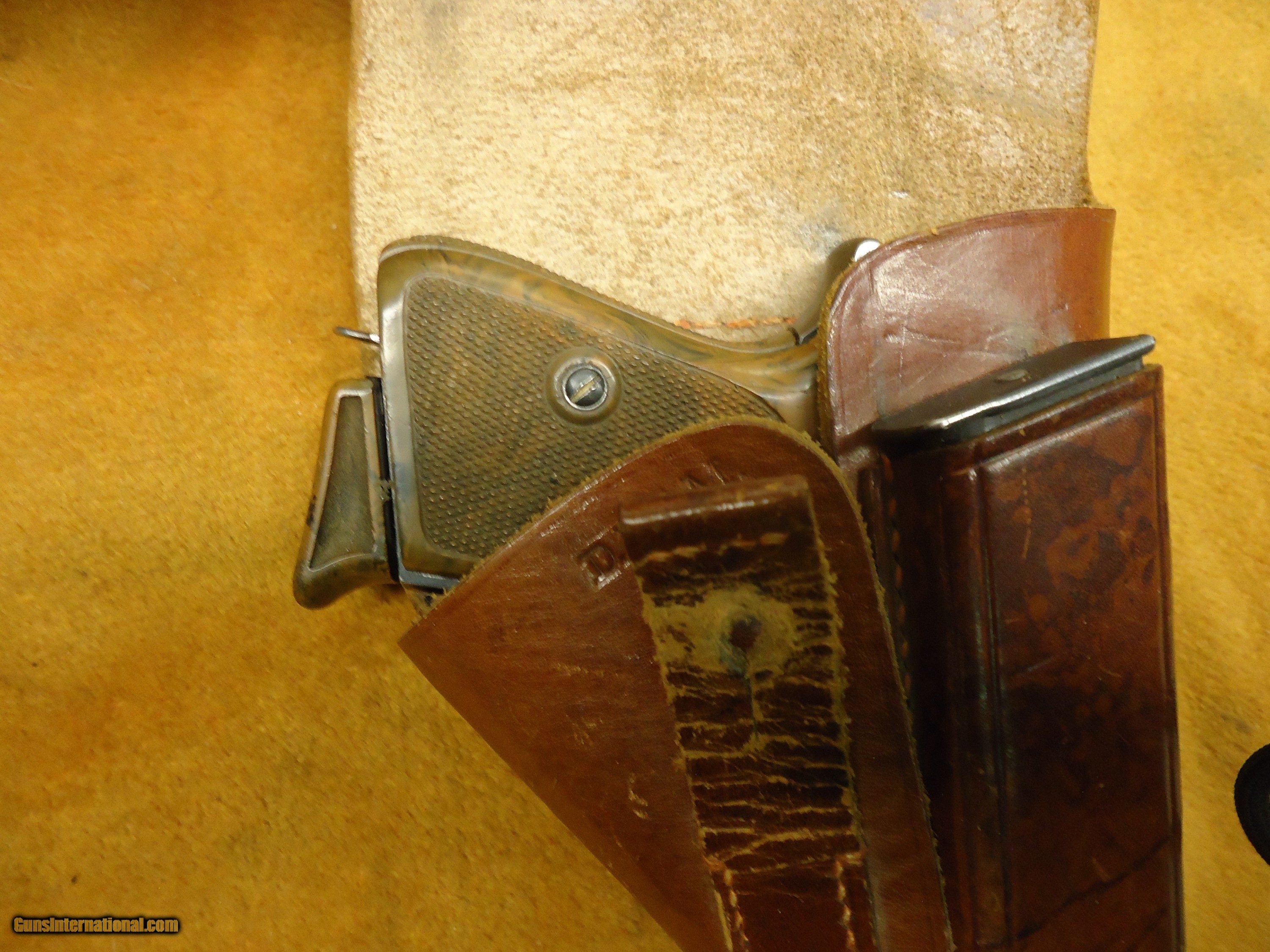 Description: Walther PPK 32acp w/ Party Holster.with Nazi Eagle Enbossed. Bring Back close to the end of WWII By Lynn Teale of the 406th Infantry. On orders to search resitences after the Battle of Krefeld 4March - 3 April 1945, Teale found this PPK on anOfficer who had killed himself. {Previous to the search a Lt who spoke fluent German called ot "Leave your wepons and go home, At the time the POW camps were full.}. $4000.00 -Will consider serious offer. If requested will supply information about Lynn and the 406th. SOLD Curio/Relic: Yes Handgun Caliber: .32 ACP (7.65x17mm Browning SR) Manufacturer: Walther Model: PPK Serial Number: 858711 Condition: 95% Metal Condition: very good Wood Condition: very good Bore Condition: perfrct |