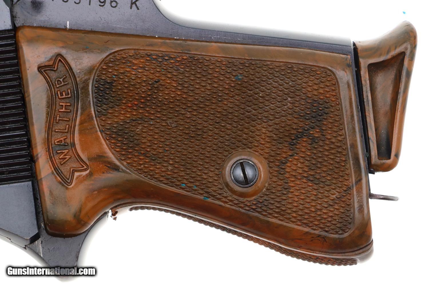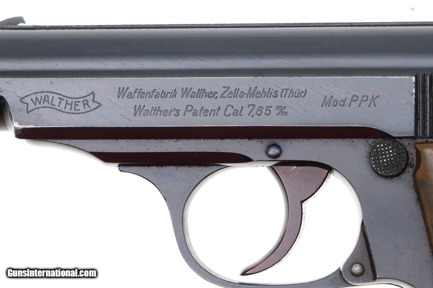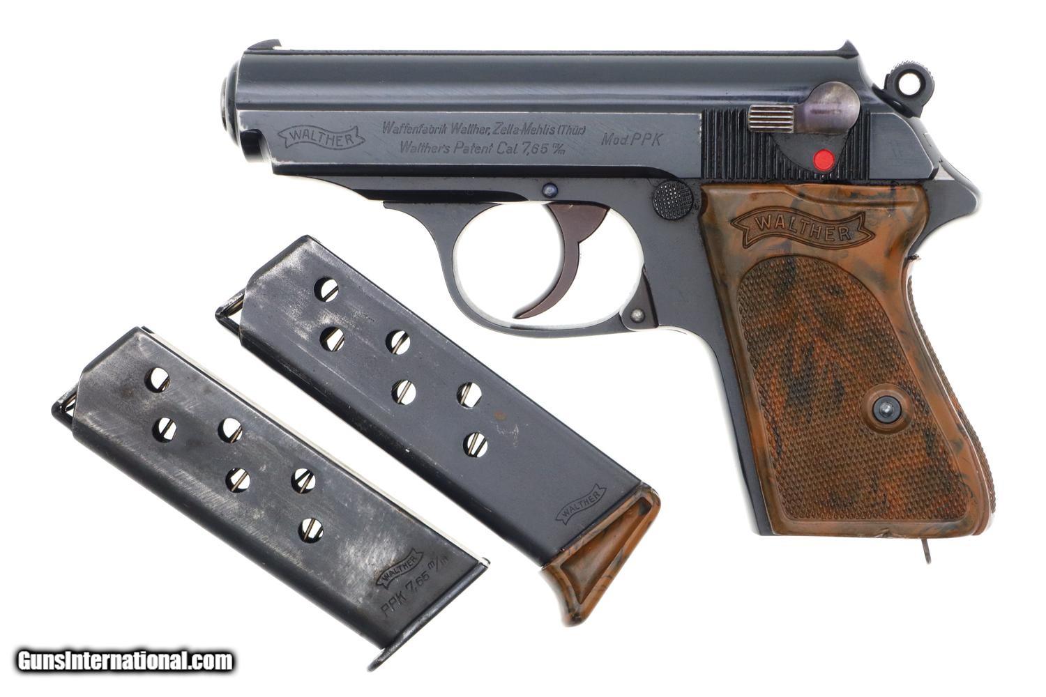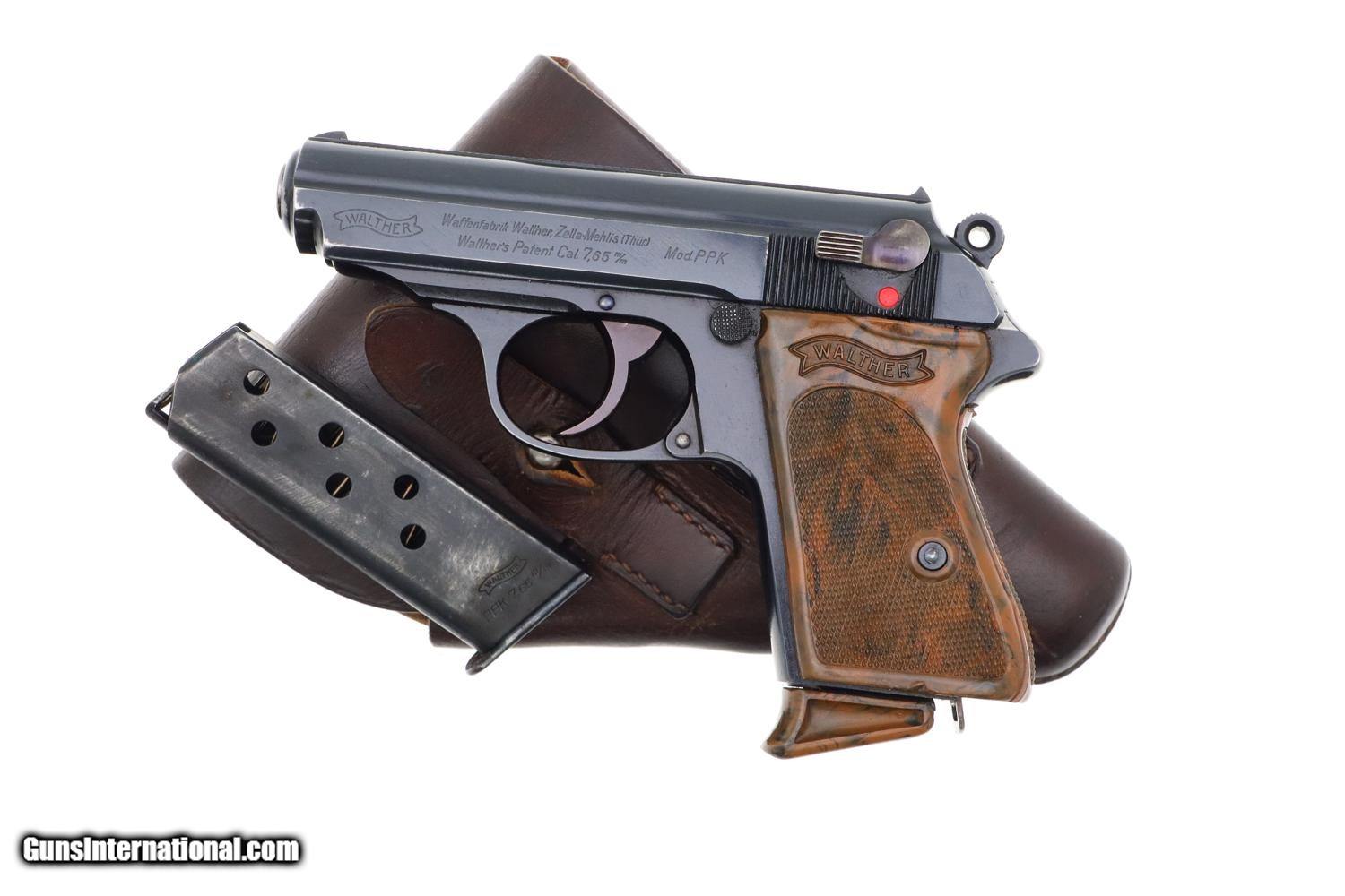Pre WWII Walther PPK, cal 7.65mm (.32 ACP), with high polish blue, fixed front and rear sights, no loaded indicator. Two line Walther address on left side of slide that underscores the manufacturer, model and caliber. Crown/N proofs on exposed barrel boss and right side of slide. Full serial number on the right side of the frame with the last three digits coarsely inscribed inside the slide. Single piece multicolor Walther banner grip. Two correct magazines, one with matte body and flat floorplate whose left side is marked with the Walther banner/PPK 7.65mm, the other with just the Walther banner and a finger extension floorplate. Complete with military style leather holster marked D.R.G.M. under closure strap, inked ownership details under the main flap.