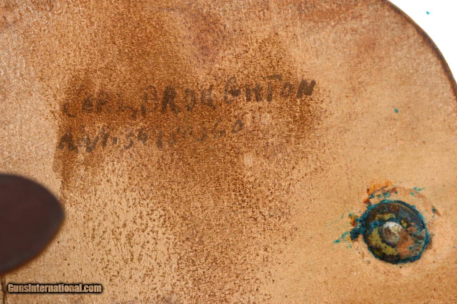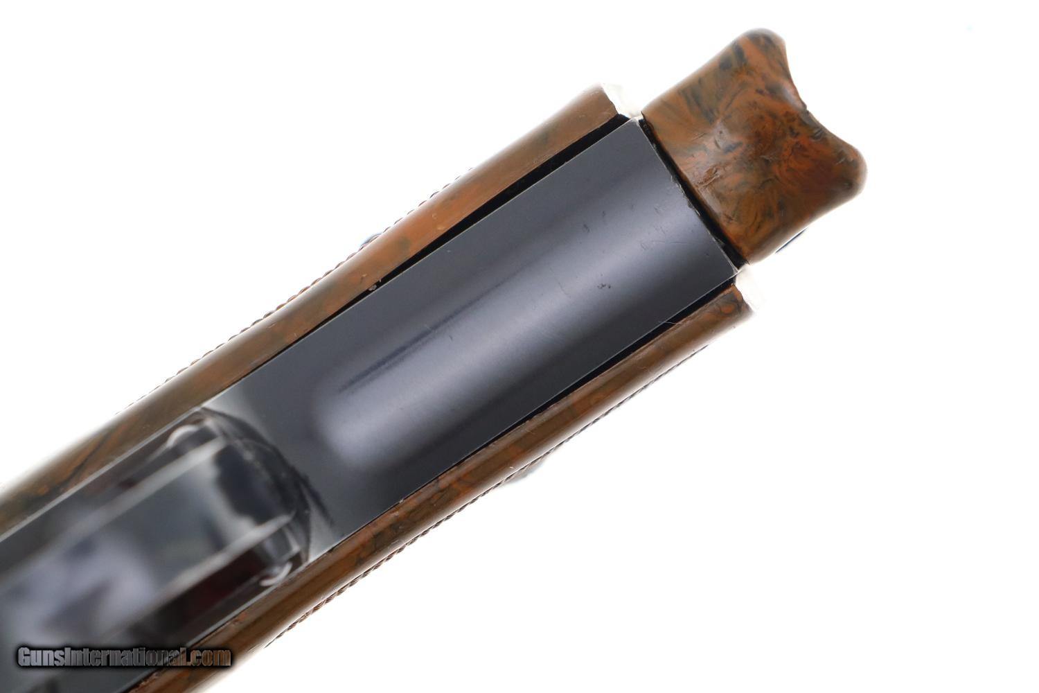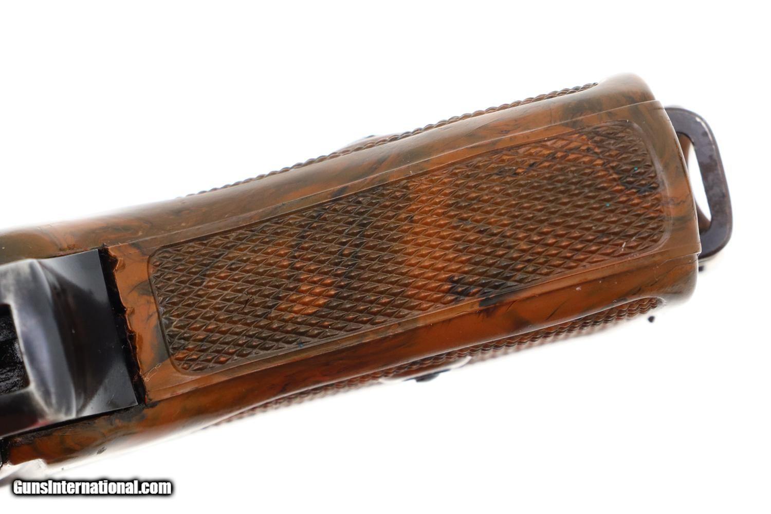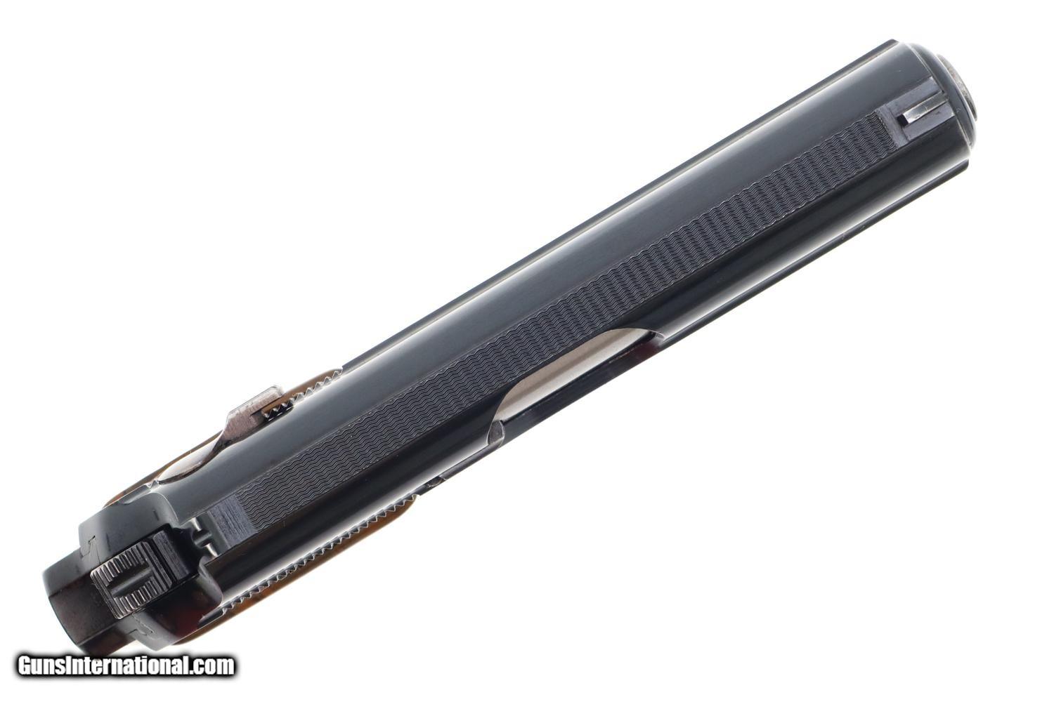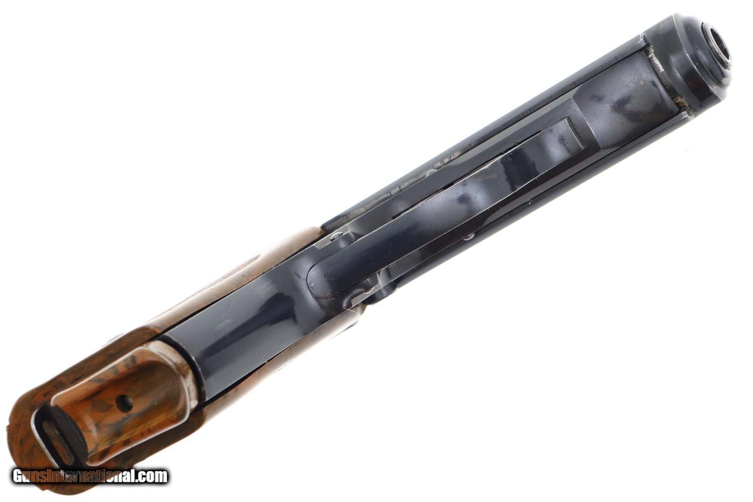 Description: Synopsis: A high original condition pre-WWII Walther PPK with matching slide, cal. 7.65mm (.32 ACP), with high polish finish, fixed sights, two magazines and a military-style leather holster. A compelling example for collectors and enthusiasts of German firearms. Description: Pre WWII Walther PPK, cal 7.65mm (.32 ACP), with high polish blue, fixed front and rear sights, no loaded indicator. Two line Walther address on left side of slide that underscores the manufacturer, model and caliber. Crown/N proofs on exposed barrel boss and right side of slide. Full serial number on the right side of the frame with the last three digits coarsely inscribed inside the slide. Single piece multicolor Walther banner grip. Two correct magazines, one with matte body and flat floorplate whose left side is marked with the Walther banner/PPK 7.65mm, the other with just the Walther banner and a finger extension floorplate. Complete with military style leather holster marked D.R.G.M. under closure strap, inked ownership details under the main flap. Condition: Bright 97% original blue with sharp edge wear. Exposed barrel boss/chamber area lightly cleaned. Comparable condition grips with minimal warpage, no discernible cracks, and only a few handling marks. G/VG magazines. Mirror bore. Correct manual mechanics, though insertion/removal difficult with finger extension magazine. Near EXC holster except as related to ownership markings under flap. A very nice, original, pre-war Walther PPK that could be equally at home in the range or in your collection. Manufacturer: Walther Model: PPK Serial Number: 183196K Caliber Info: 7.65mm Condition: EXC Price: $2,895.00 Contact Seller |