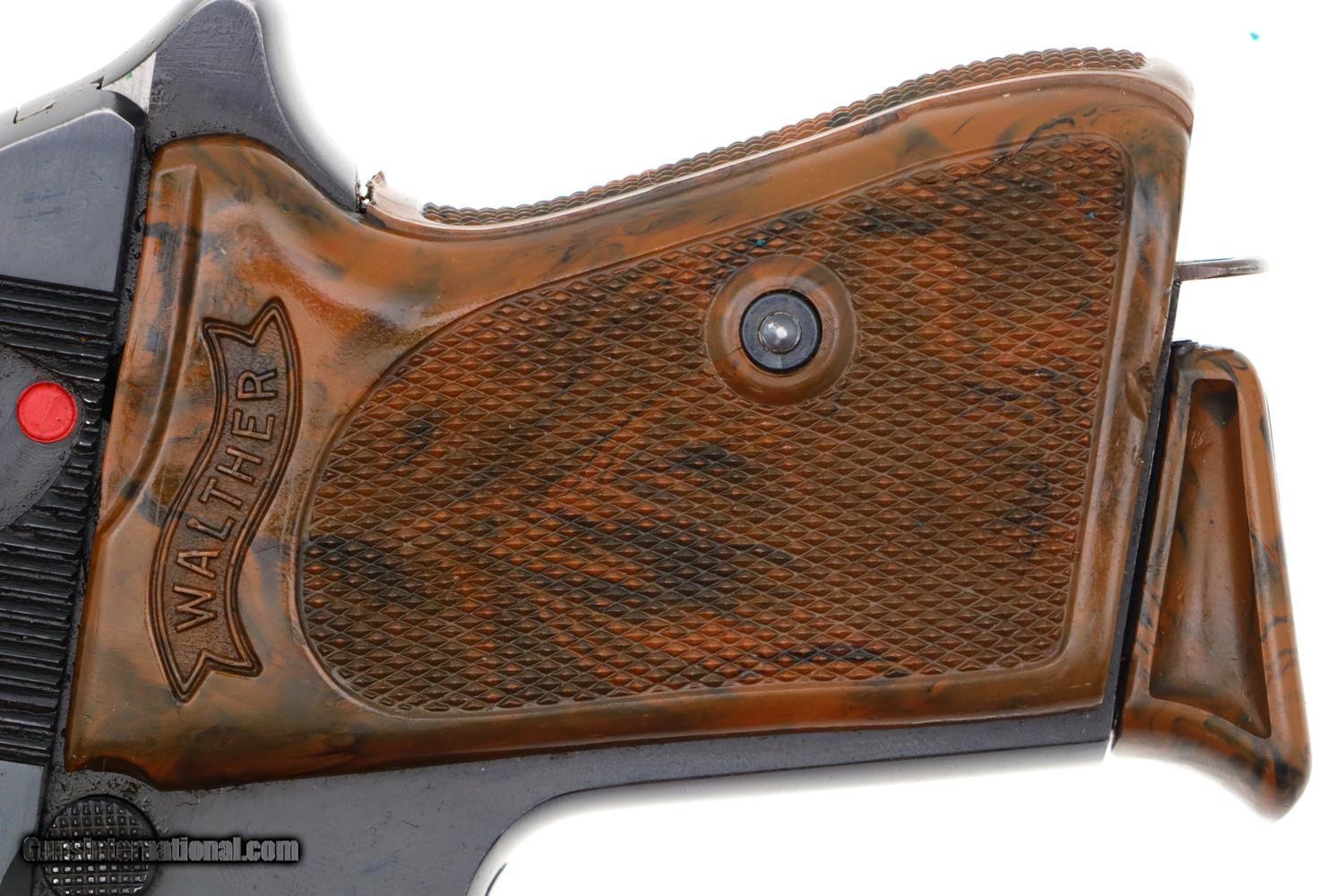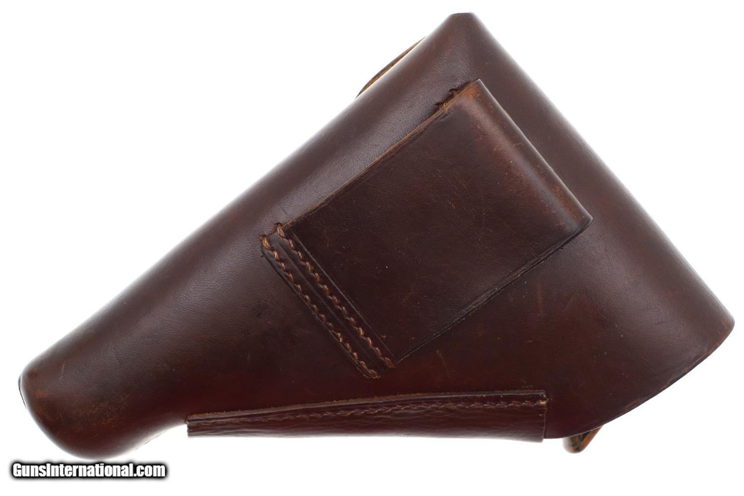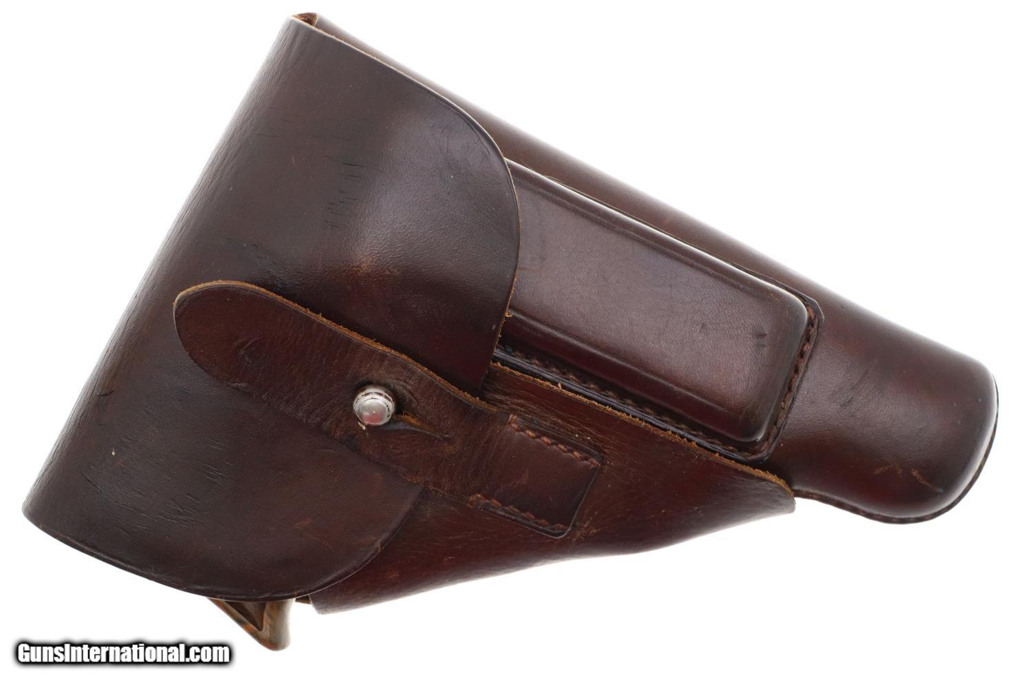 Bright 97% original blue with sharp edge wear. Exposed barrel boss/chamber area lightly cleaned. Comparable condition grips with minimal warpage, no discernible cracks, and only a few handling marks. G/VG magazines. Mirror bore. Correct manual mechanics, though insertion/removal difficult with finger extension magazine. Near EXC holster except as related to ownership markings under flap. A very nice, original, pre-war Walther PPK that could be equally at home in the range or in your collection.