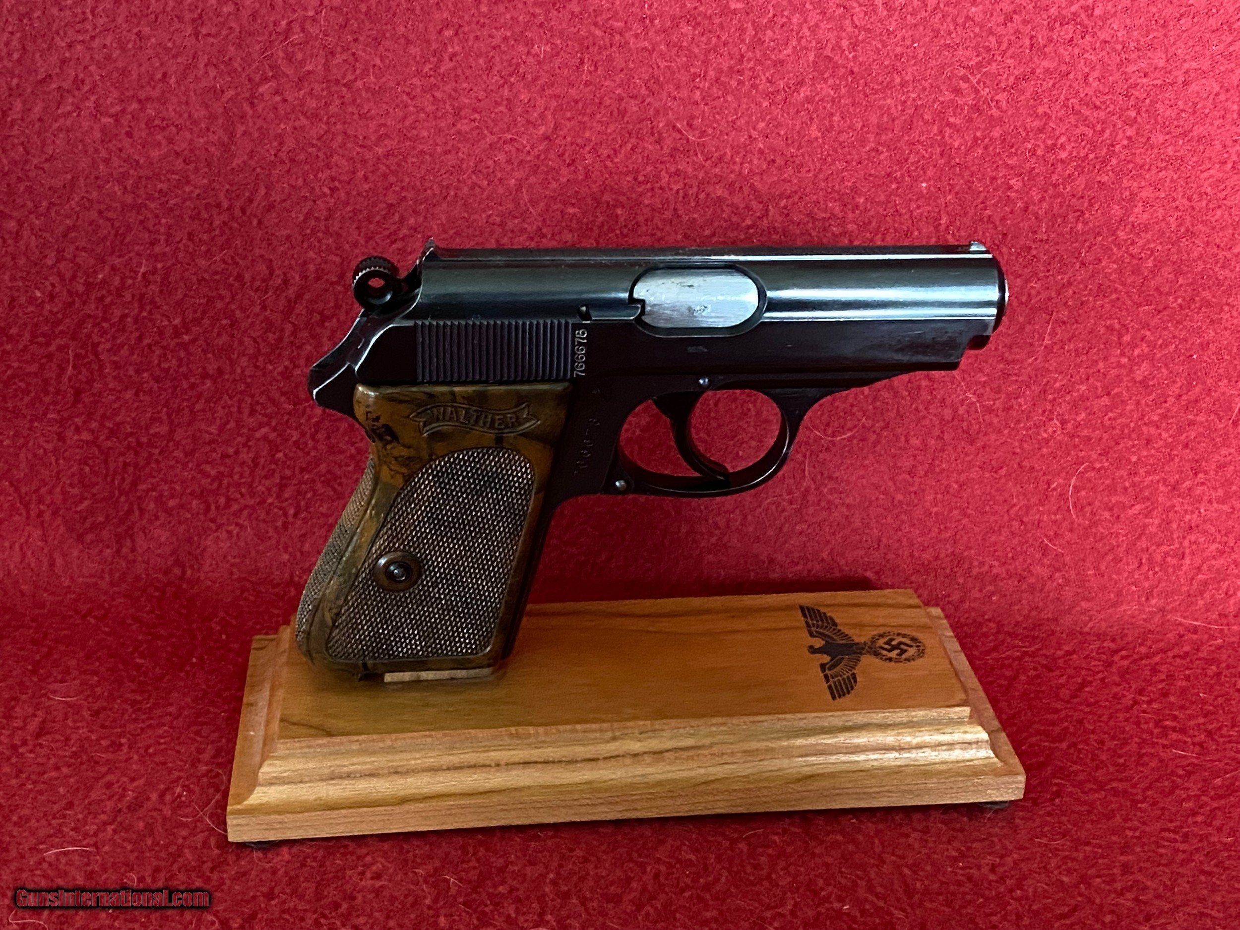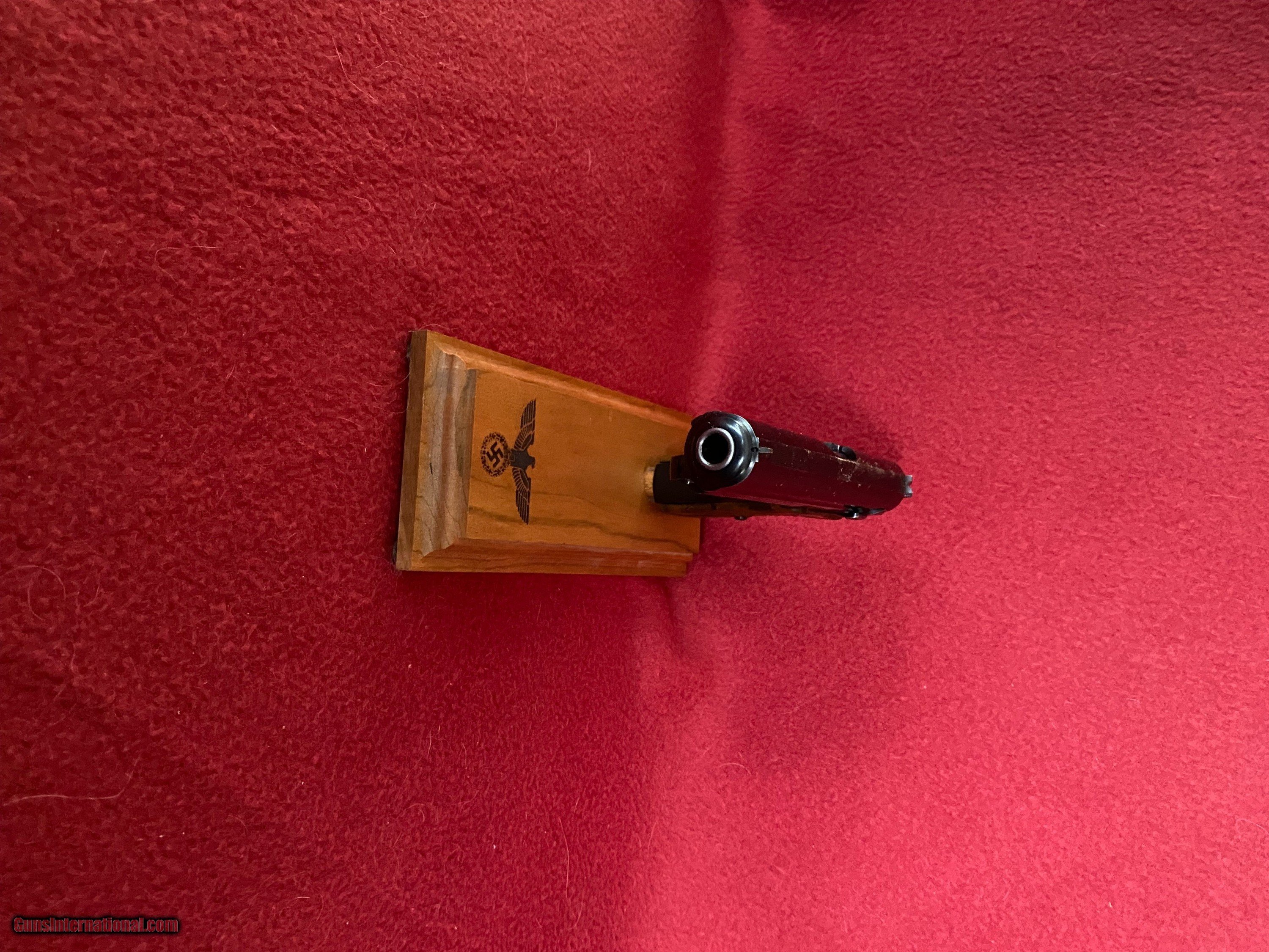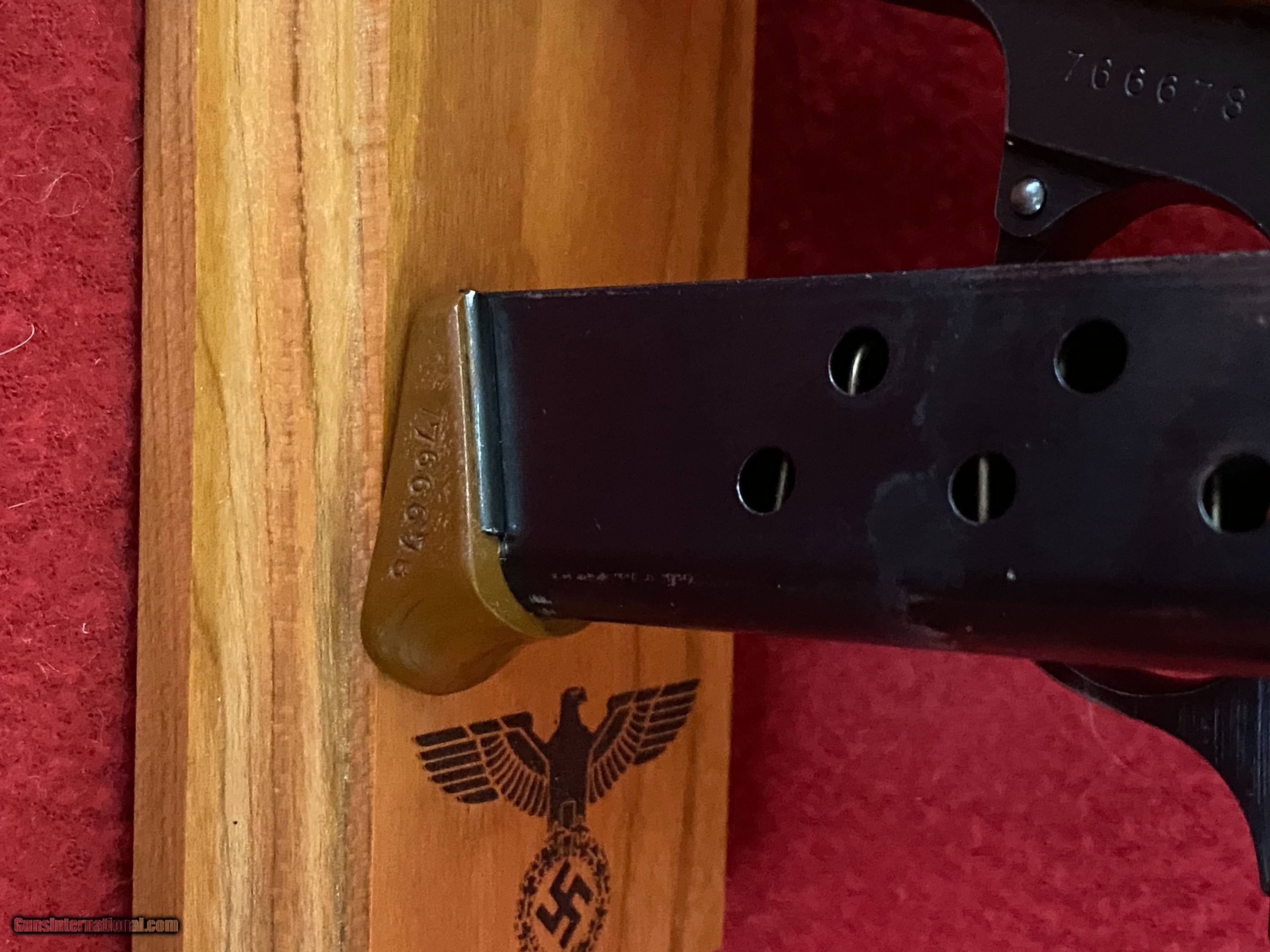 The Reichsbank PPK is one of the rarest and most sought after variants, they were usually carried by plainclothes bank agents in shoulder holsters. I guess this is what they used to guard all the Nazi Gold that they had stashed away. This is a real find with the matching mag and will not last but a few hours. SOLD Curio/Relic: Yes Handgun Caliber: .32 ACP (7.65x17mm Browning SR) Manufacturer: Walther Model: PPK Condition: Great Metal Condition: 97+ |