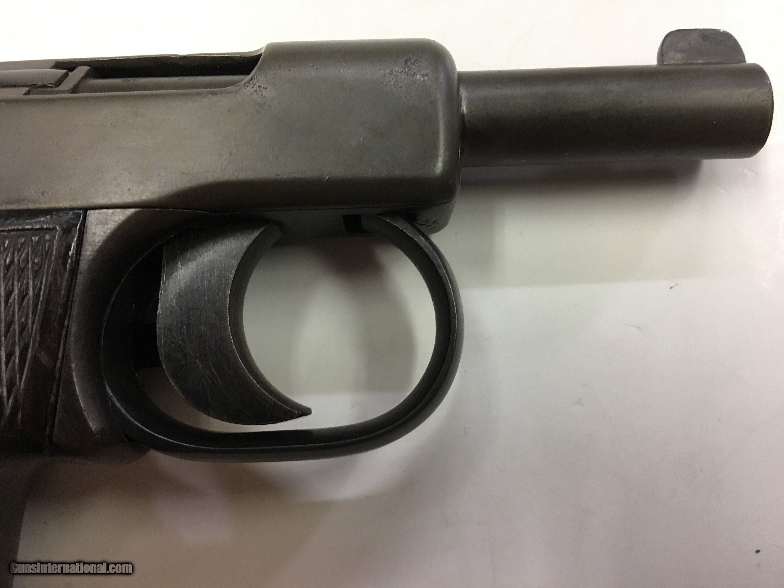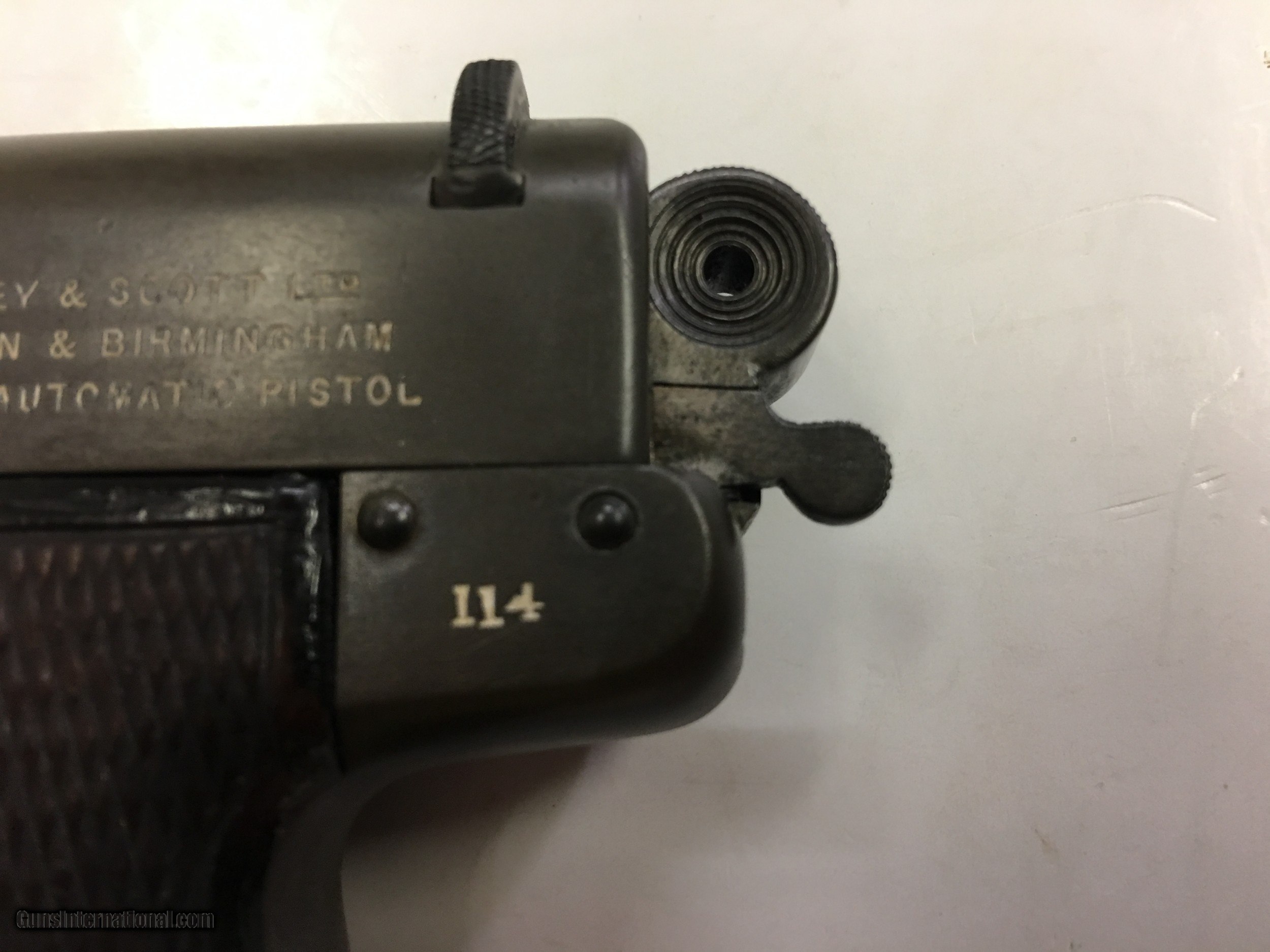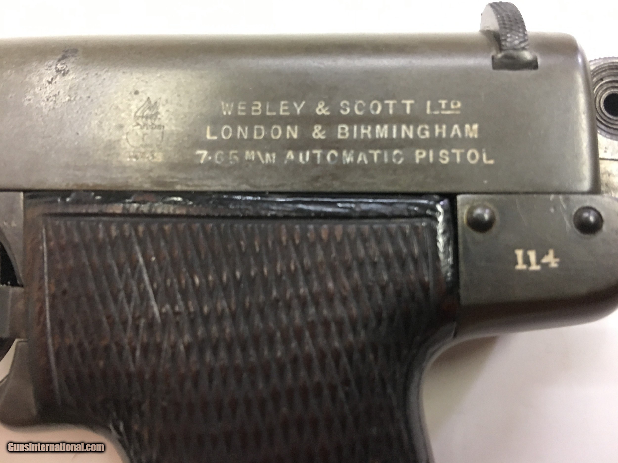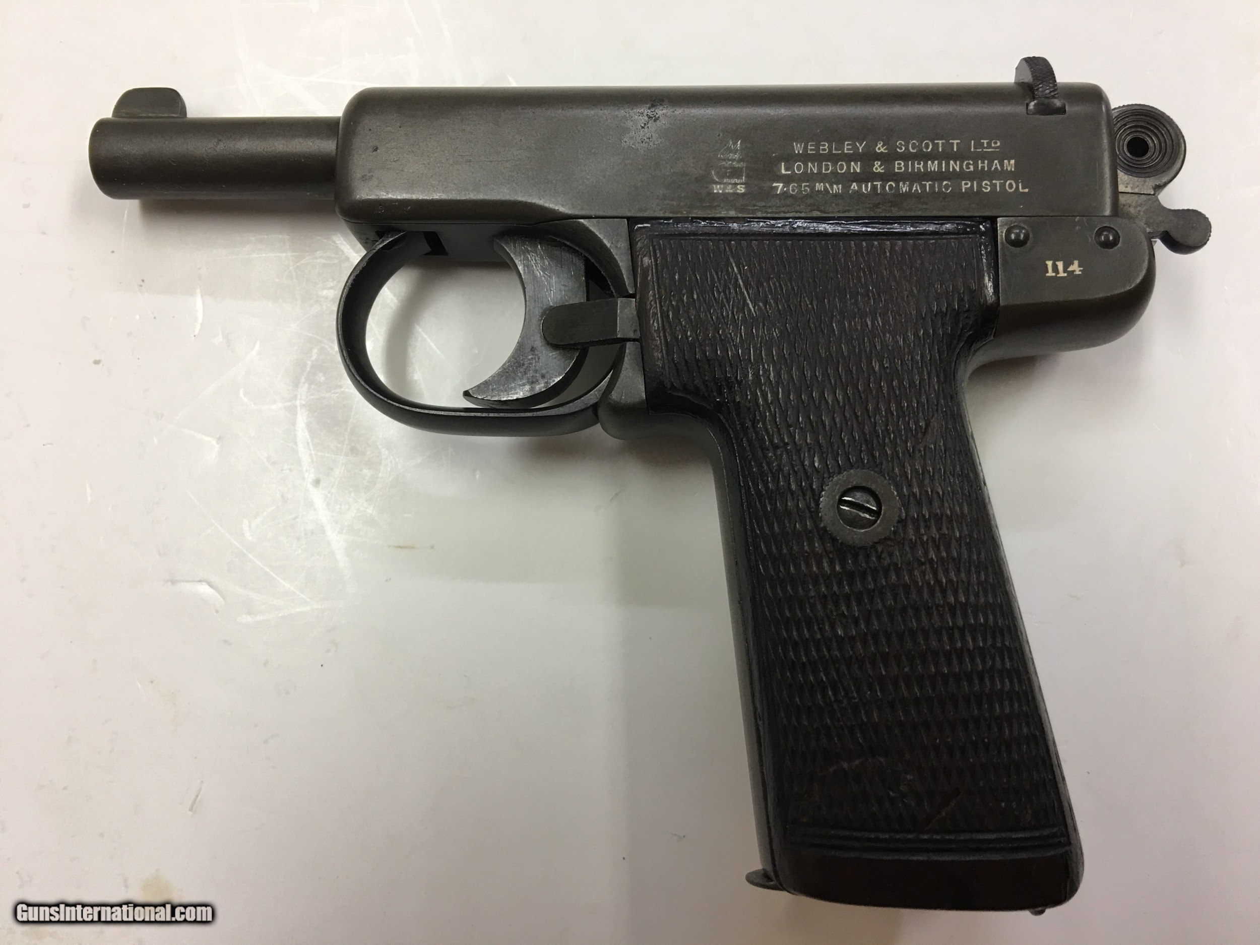 Description: Webley & Scott Model 1905 .32 ACP, pistol has very early Webley & Scott markings on slide. Has hammer safety. Indications are pistol has never been blued. Has even brown patina and test fired only. Note the style of checkering on the grips. This my have been a test of the early W&S markings on the slide. This pistol can be traced back to having been in the Webley and Scott factory collection. SOLD Manufacturer: Webley & Scott Model: 1905 Serial Number: 1XX Caliber Info: .32 ACP |