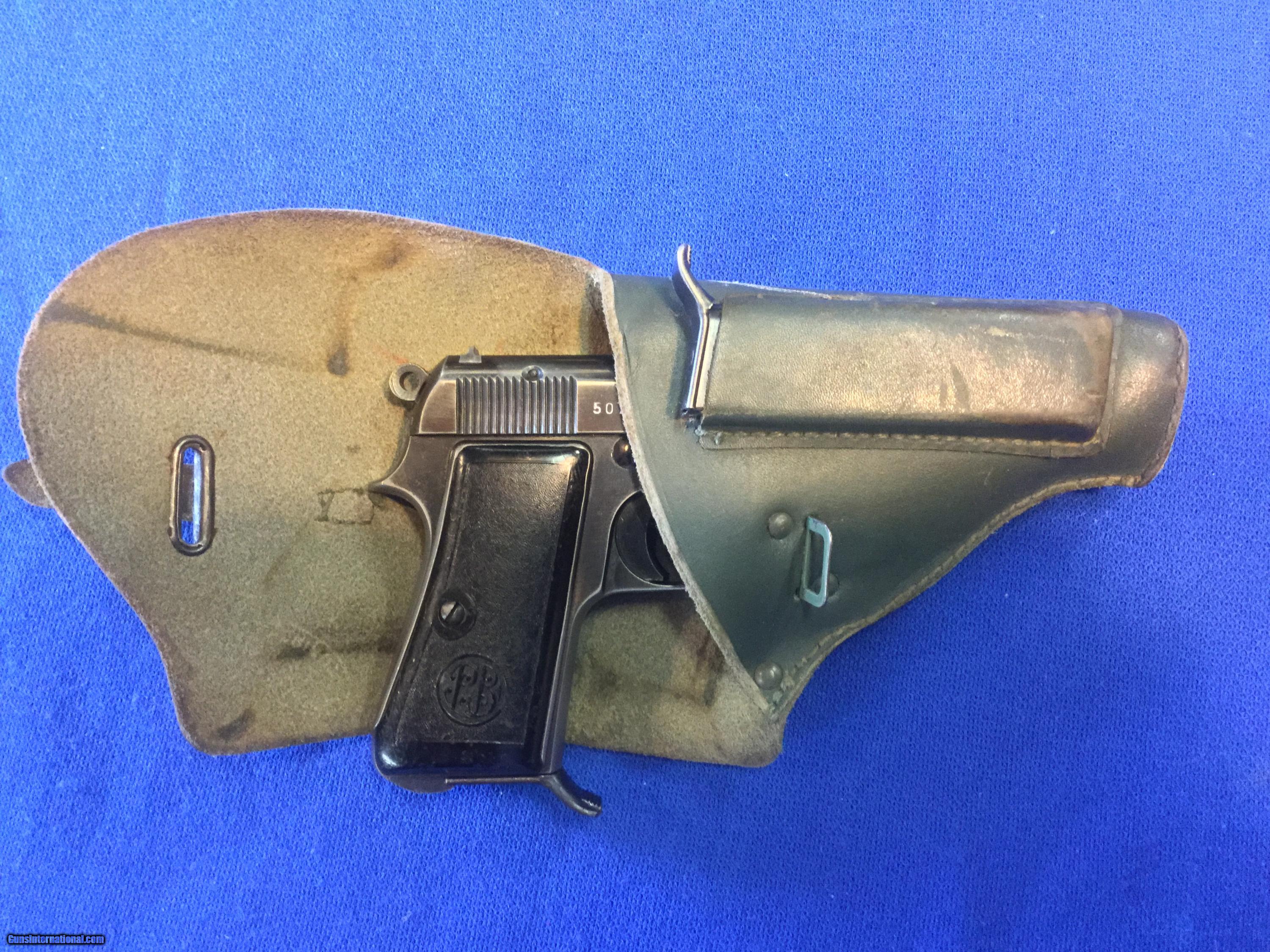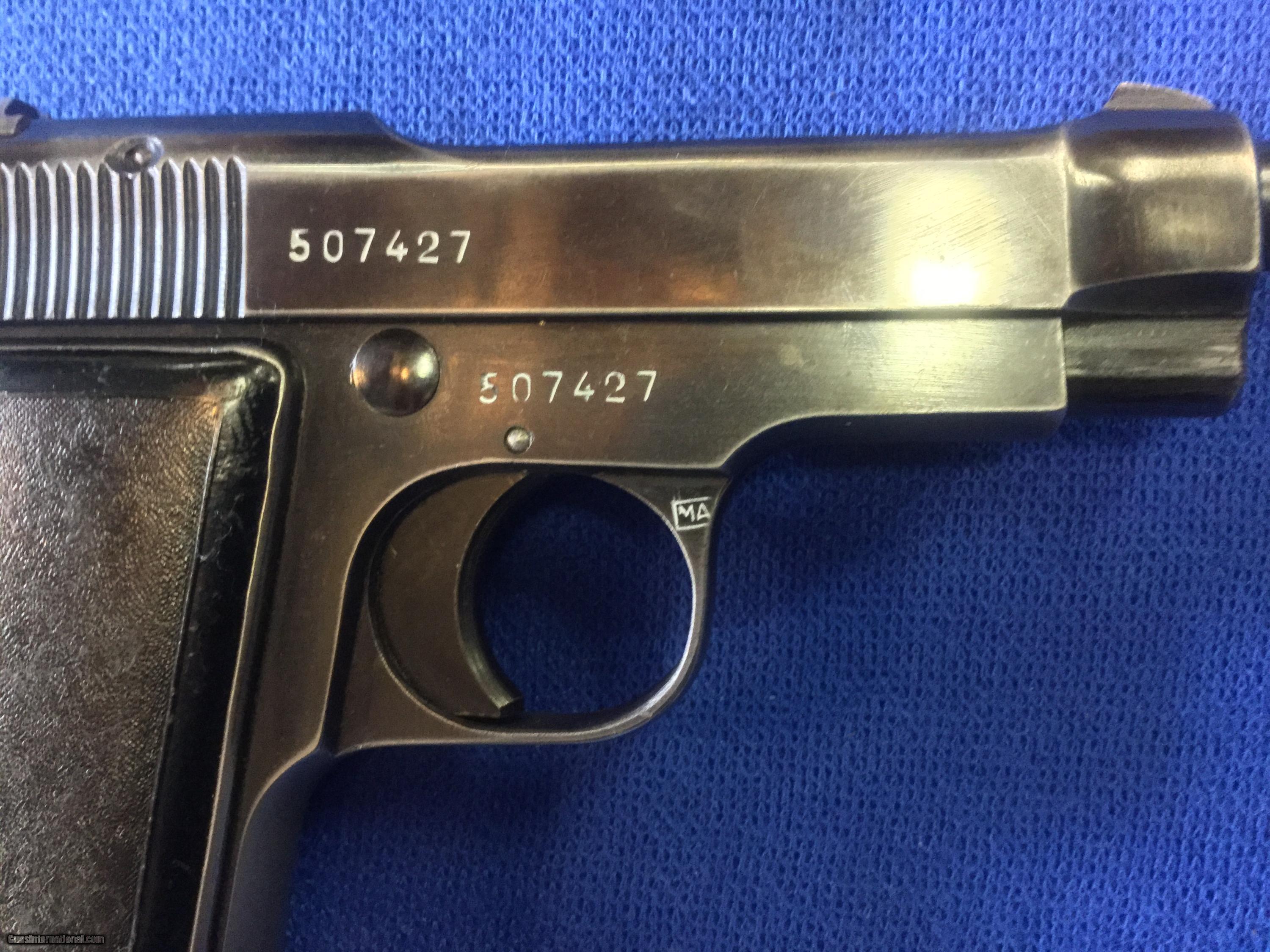 Description: Up for sale today is a WWII Beretta Model 1935 serial no. 507427 (1944) chambered in caliber .32 Auto. This excellent late-production Beretta shows nearly mint finish and is marked with the crown eagle marking indicative of issue to the Italian Air Force. The pistol shows mint grips, a mint bore and comes with an issue green/grey leather holster and two original magazines. An outstanding example of a late-production Air Force Beretta and an excellent addition to any collection. All Pennsylvania residents please add 6% sales tax. SOLD Curio/Relic: Yes Manufacturer: Beretta Model: 1935 Serial Number: 507427 Caliber Info: .32 Auto Condition: Mint Metal Condition: Mint Bore Condition: Mint |
