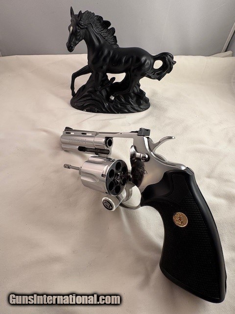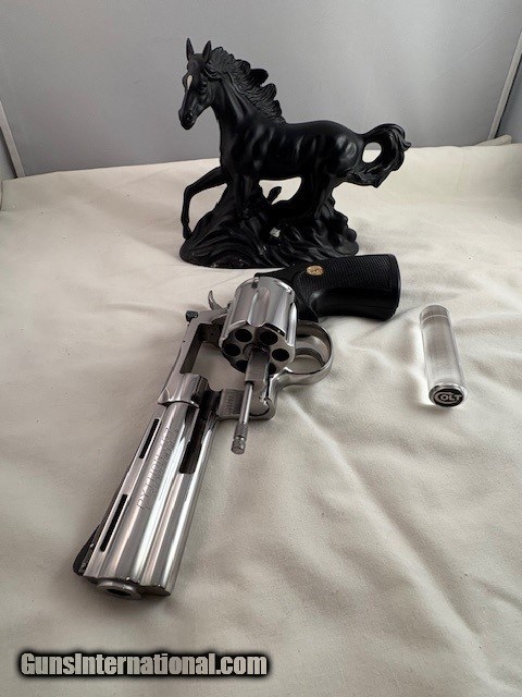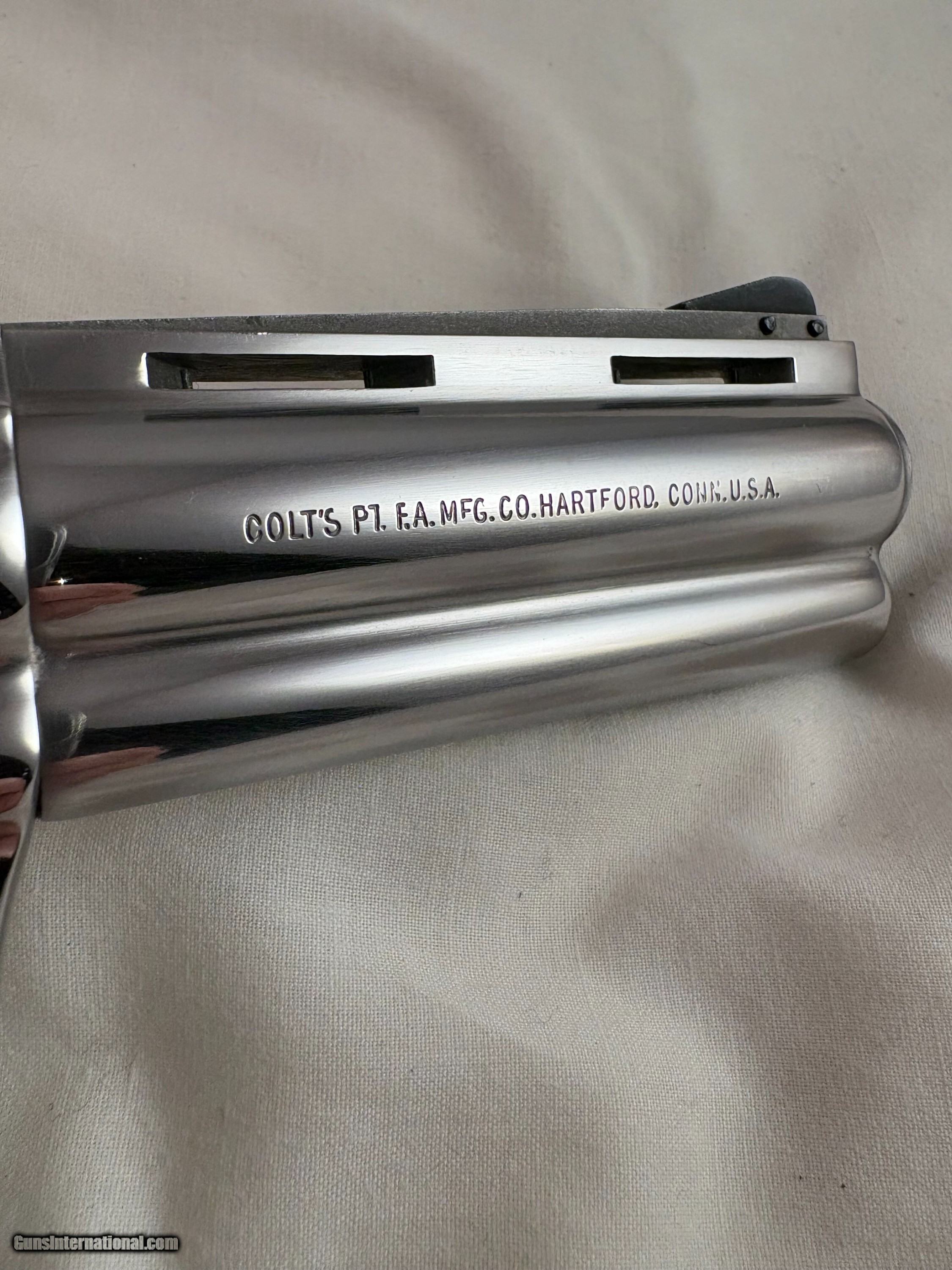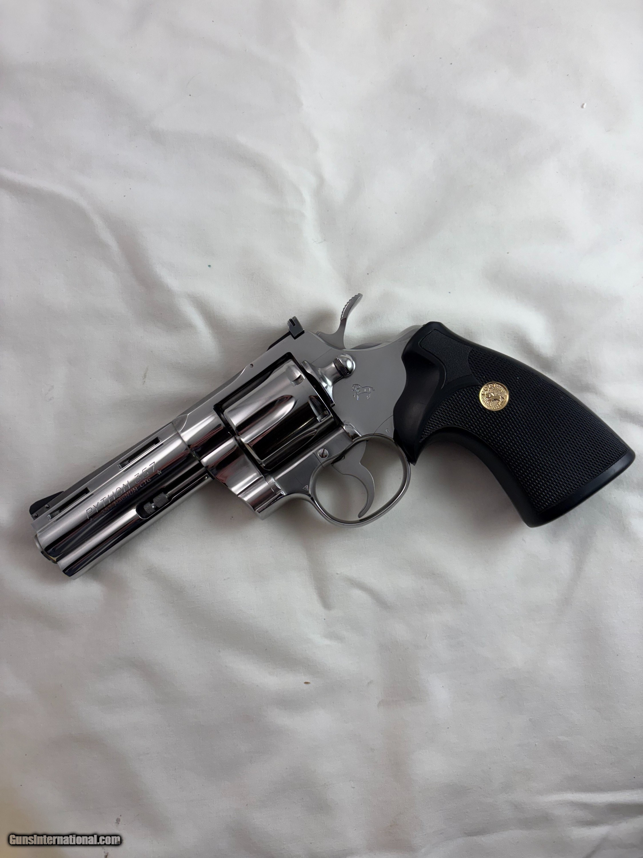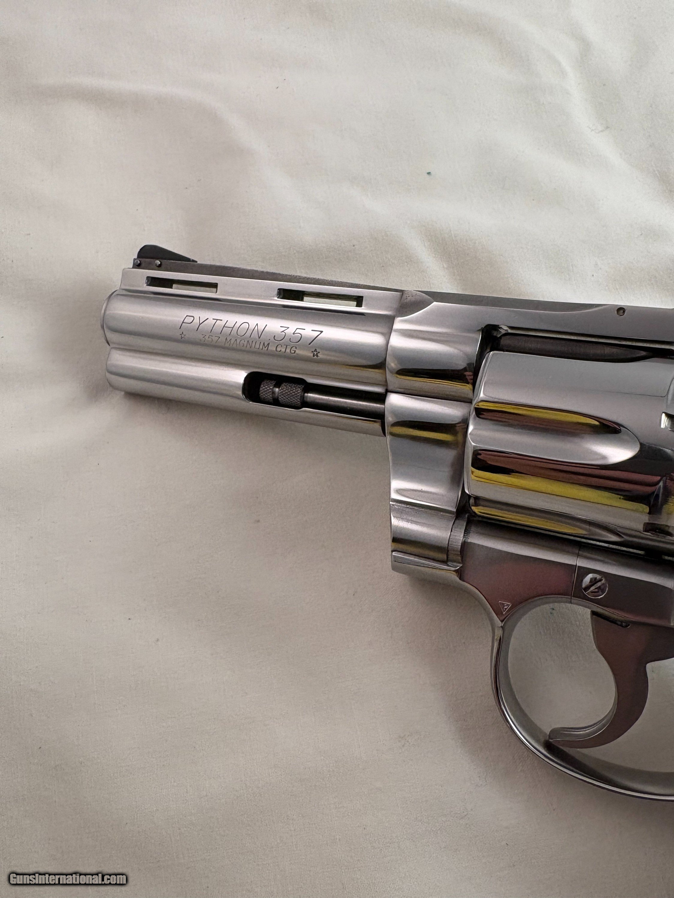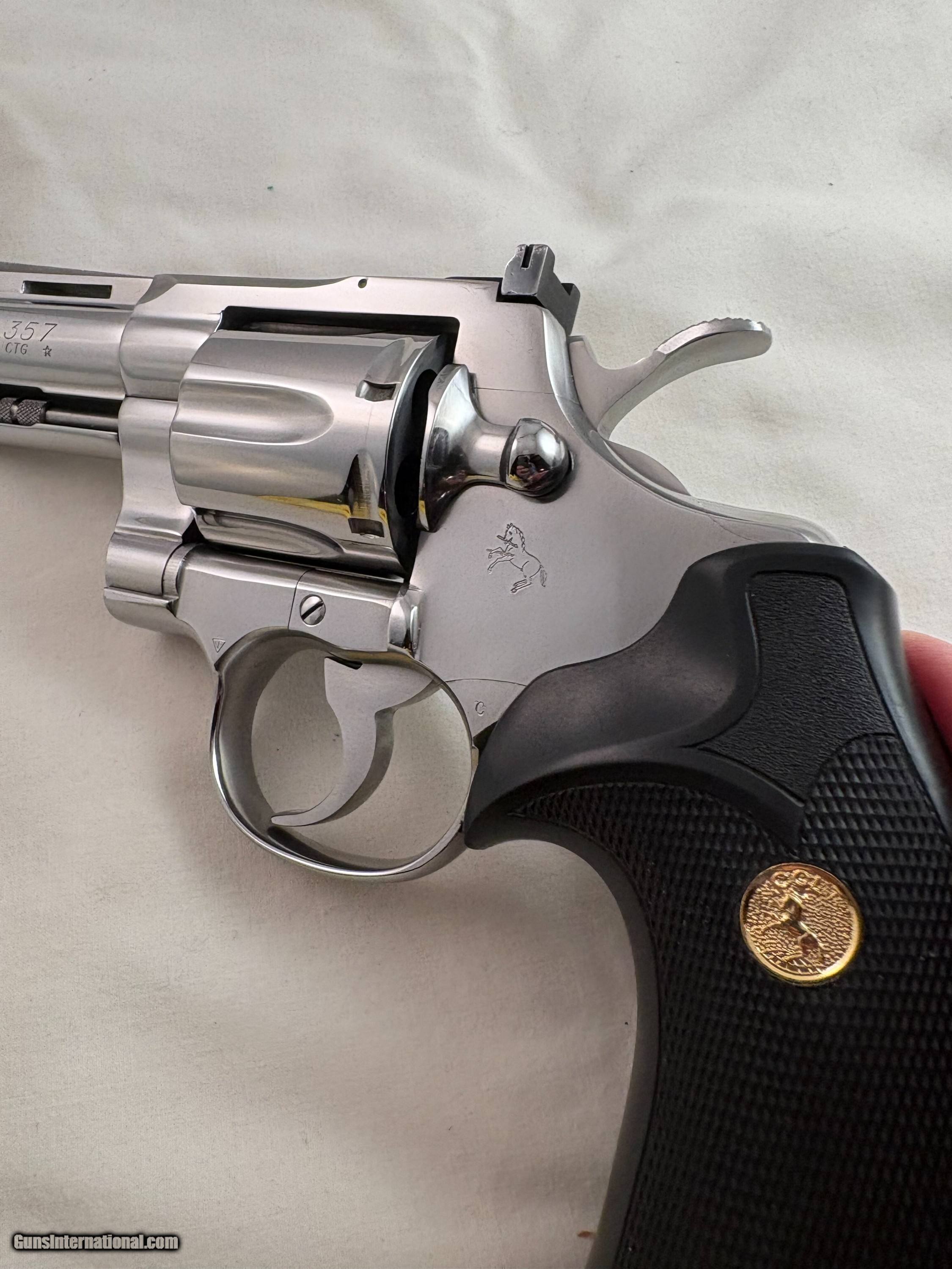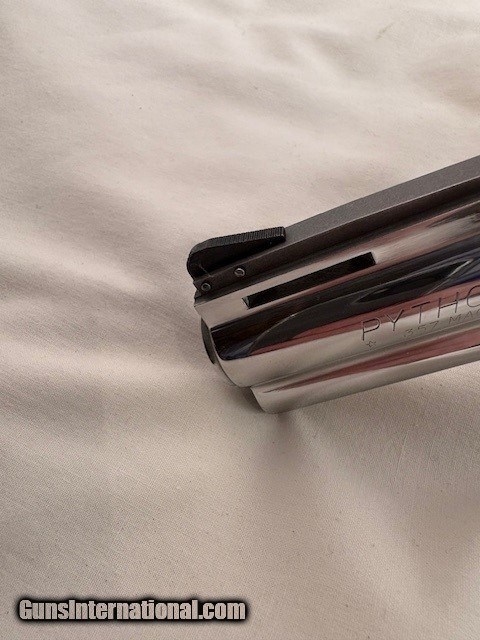 Description: From my private collection I am offering a great little 1983 Colt Python with 4 inch barrel, a hand polished Stainless finish, and Colt Presentation grips with gold Colt medallions. This is the 1st year Colt offered the stainless finish so it made this one a little more special. This one does not have the Colt box any longer (delapidated) but I do have some of the paperwork. This is really nice condition with a very faint turn line leading me to believe it wasn't fired much. Under reading lights I do see a light hairline scratch above the cylinder release that could be sanded and polished out if it bothers you but overall the gun looks great. It is hard to get perfect photos of a shiny finish to show the light scratch but feel free to call me if you have questions. Look at the photos and you can tell this one has been babied for the past 42 years! No heavy carbon on the face of the cylinder and firing cone areas.There are a few very small "handling or storage" marks like on the top strap "sand blasted finish" area. The grips look like new. Priced to sell and this would be a perfect classic Python to be able to shoot and easy to clean so it stays nice looking. Lowball offers will be ignored but I thank you for looking. I will split the UPS shipping costs if paid in full during October 2025. Any FFL fees will be the sole responsibility of the Buyer to pay. Ships to your FFL in a nice gun rug for storage. As with any used gun sale,there is no warranty or guarantees offered by the seller. It is suggested with any gun stored for years without firing, you have a gunsmith look it over before shooting. I don't shoot any of my collection. If during inspection in front of your FFL dealer you feel it wans't represented accurately and think you may want to return it, you should call me and not accept the gun from the FFL. If you accept the gun and leave the FFL's presence as your witness, I cannot accept a return because there is no way to know what has been done to my gun. The gun must stay in the condition as received without multiple dry firing rounds possibly causing a deeper turn line on the cylinder reducing the value. If returned in the exact condition as shipped, sales price only will be refunded (shipping fees and any FFL fees charged to buyer and/or seller will not be reimbursed. I have over 500 perfect reviews/feedbacks on a Georgia gun forum and also around 200 perfect reviews/feedbacks on GB for references if needed. Handgun Caliber: .357 Magnum Manufacturer: COLT Model: PYTHON Condition: EXCELLENT Metal Condition: EXCELLENT Manufacture Date: 1983 Grips: Factory Colt Price: $2,300.00 Buy Now Contact Seller |
