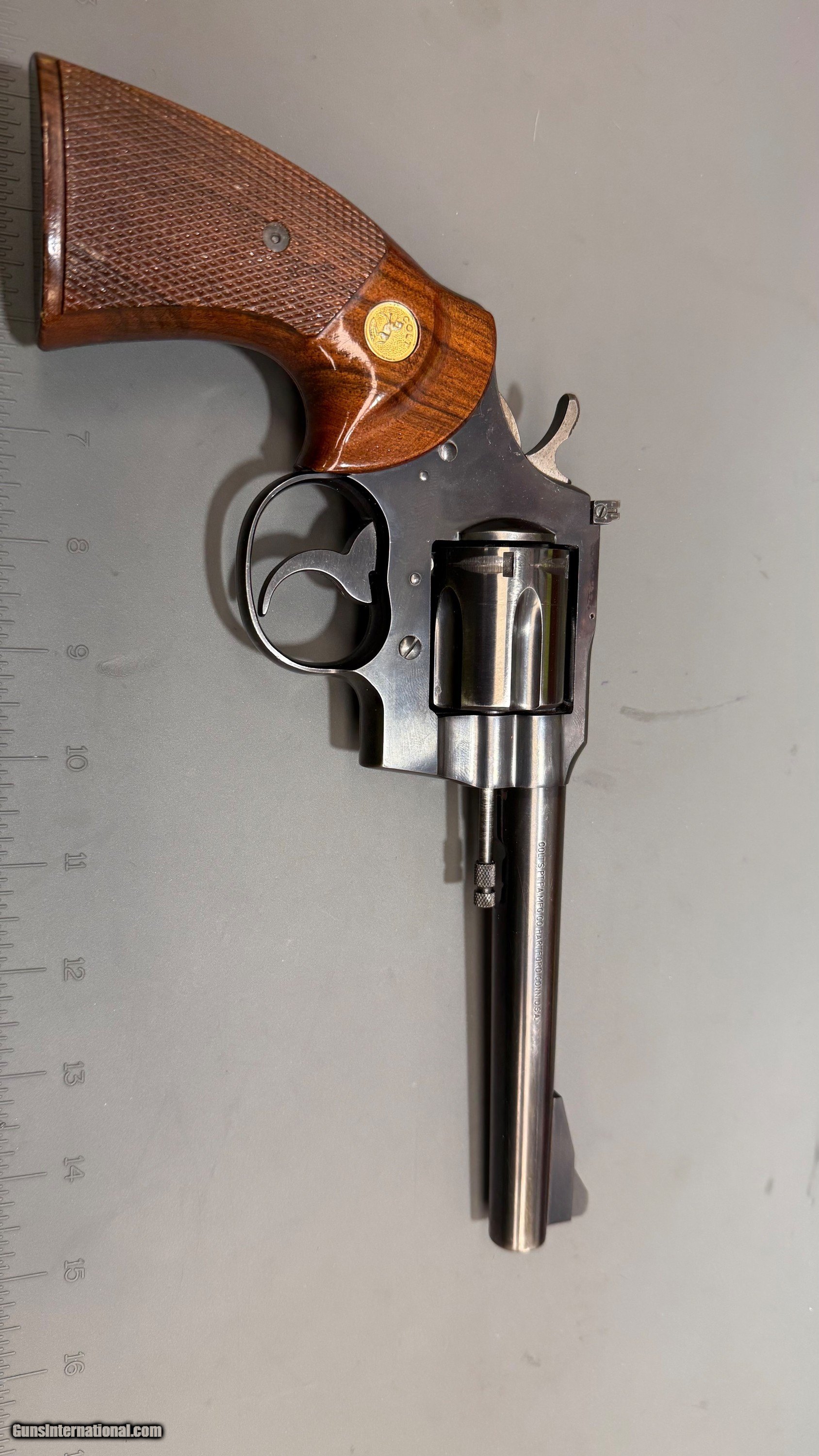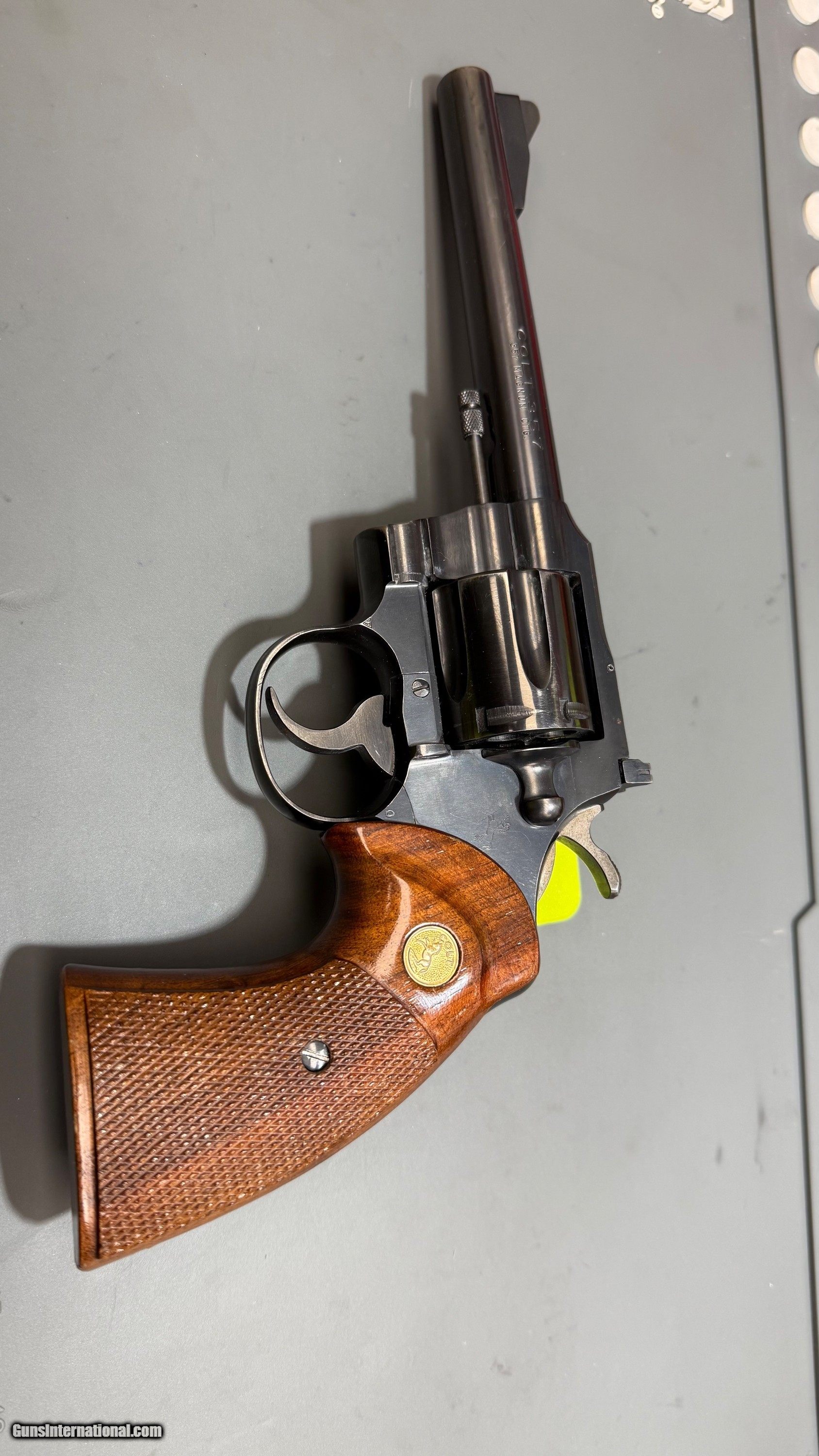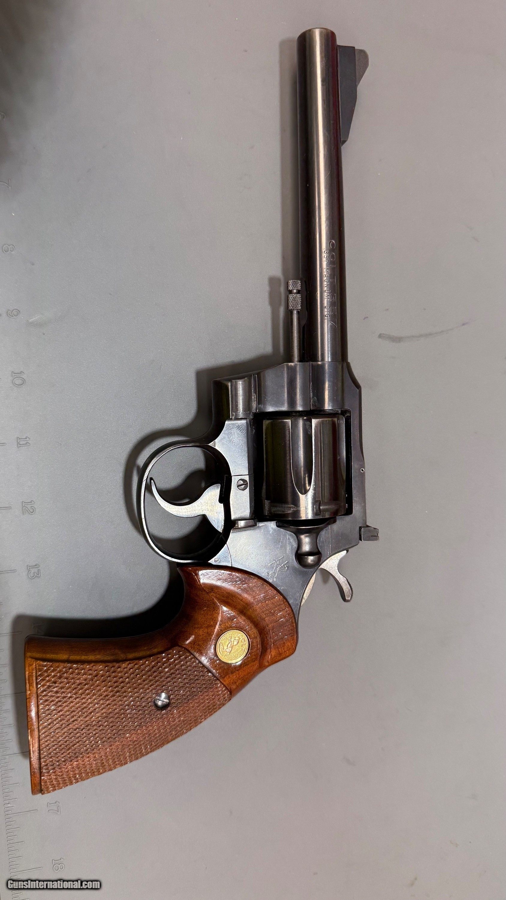 Description: The 357 model outwardly had a close resemblance to the new Trooper models, since they used the same frame size and action. The new 357 and Trooper were virtually indistinguishable without a close inspection. While the Trooper was to be a lower-cost model, the new 357 was to be Colt's premium model holster revolver with a more carefully fitted and tuned action and a better external finish. The idea was that law enforcement and civilian buyers wanting a less expensive adjustable sight revolver would buy the Trooper, buyers wanting the .357 Magnum cartridge or wanting a higher quality gun would buy the 357. Things got confused in 1955 when Colt introduced the "Super Premium" Colt Python. Buyers wanting a cheaper gun continued to buy the Trooper, but those wanting a better gun were buying the new Python. This left the 357 as odd man out, and in 1961, Colt discontinued the 357 model after about 15,000 had been produced. Handgun Caliber: .357 Magnum Serial Number: 262490 Barrel Length: 6 Price: $1,700.00 Buy Now Contact Seller |