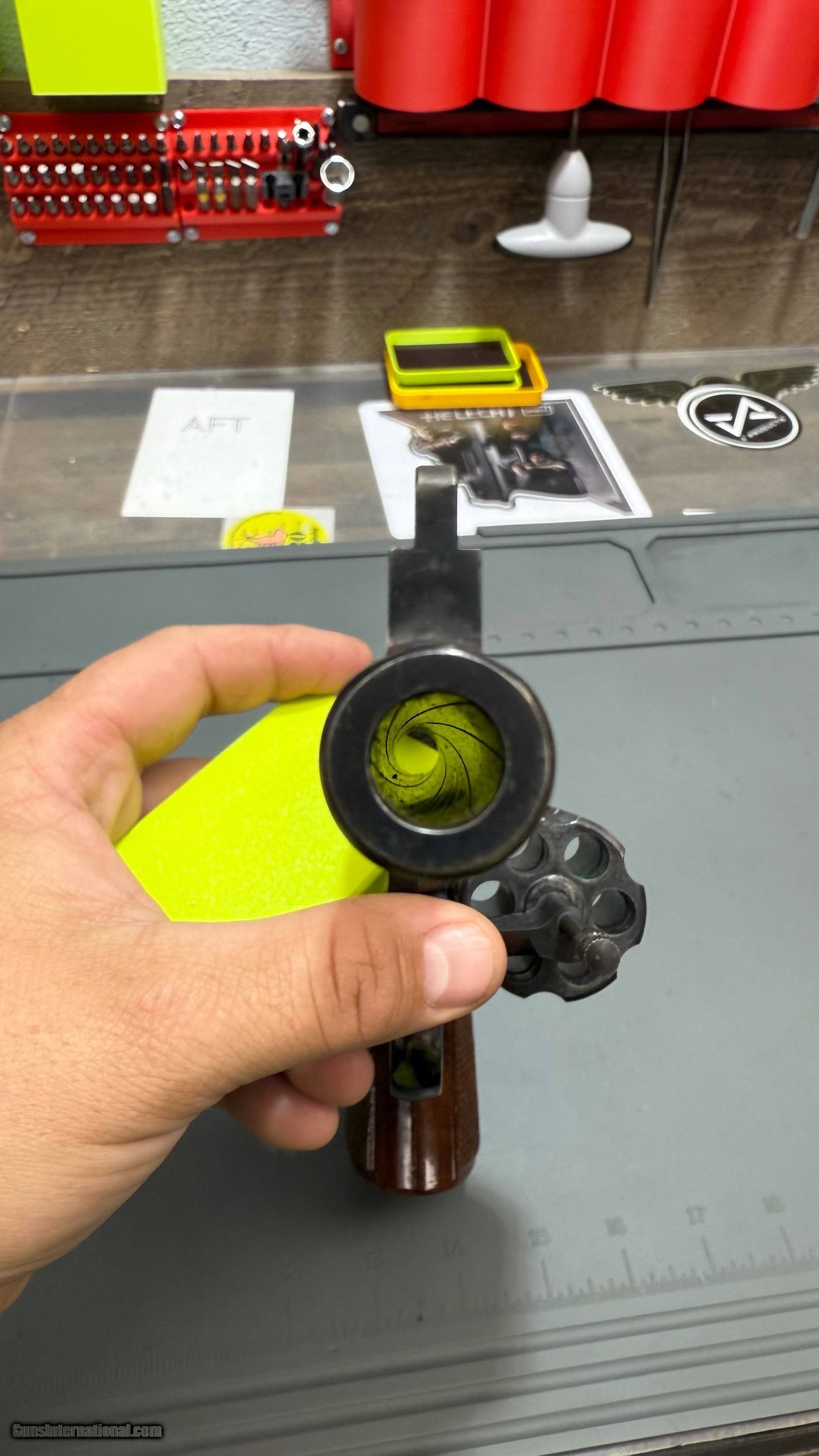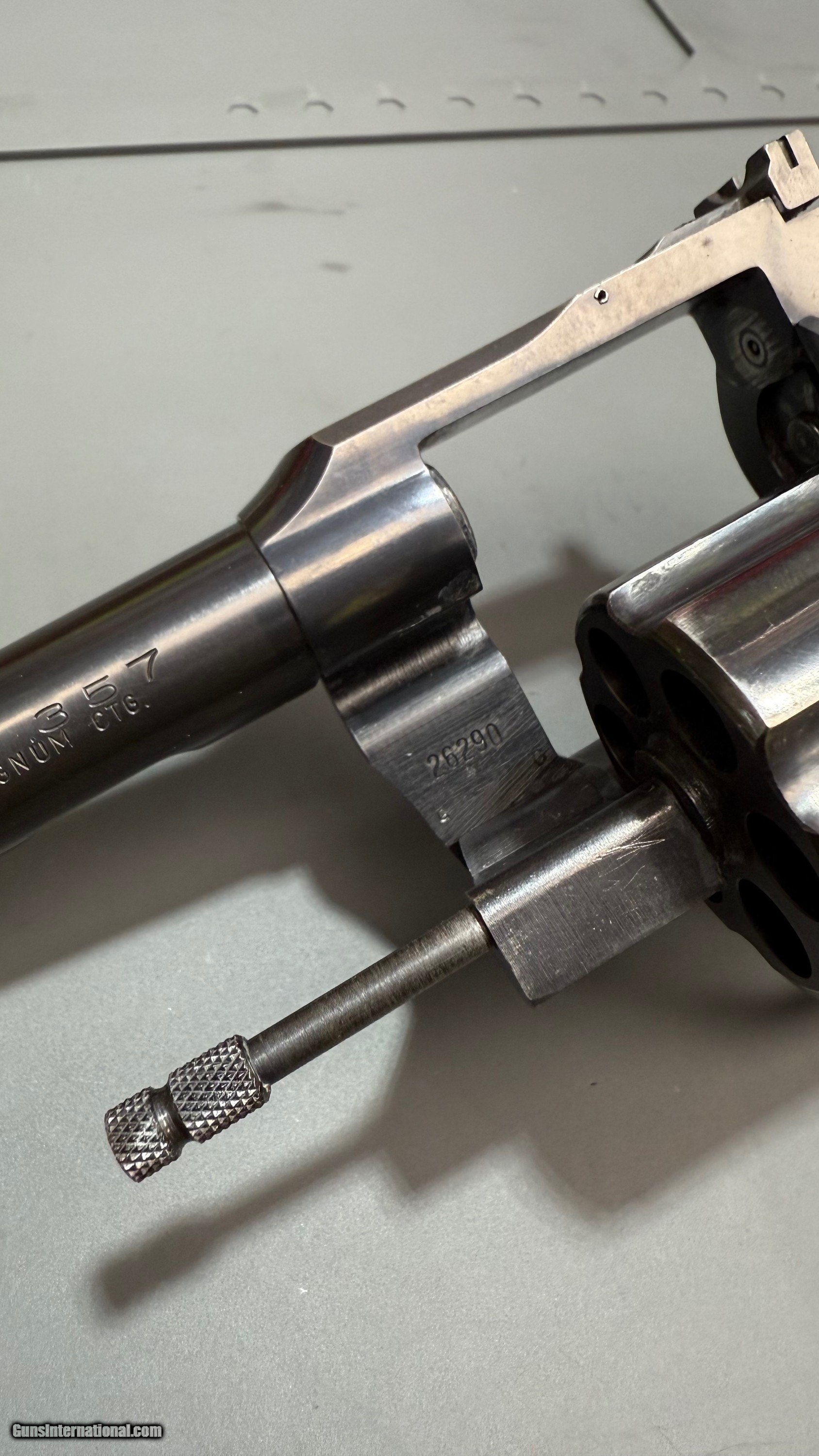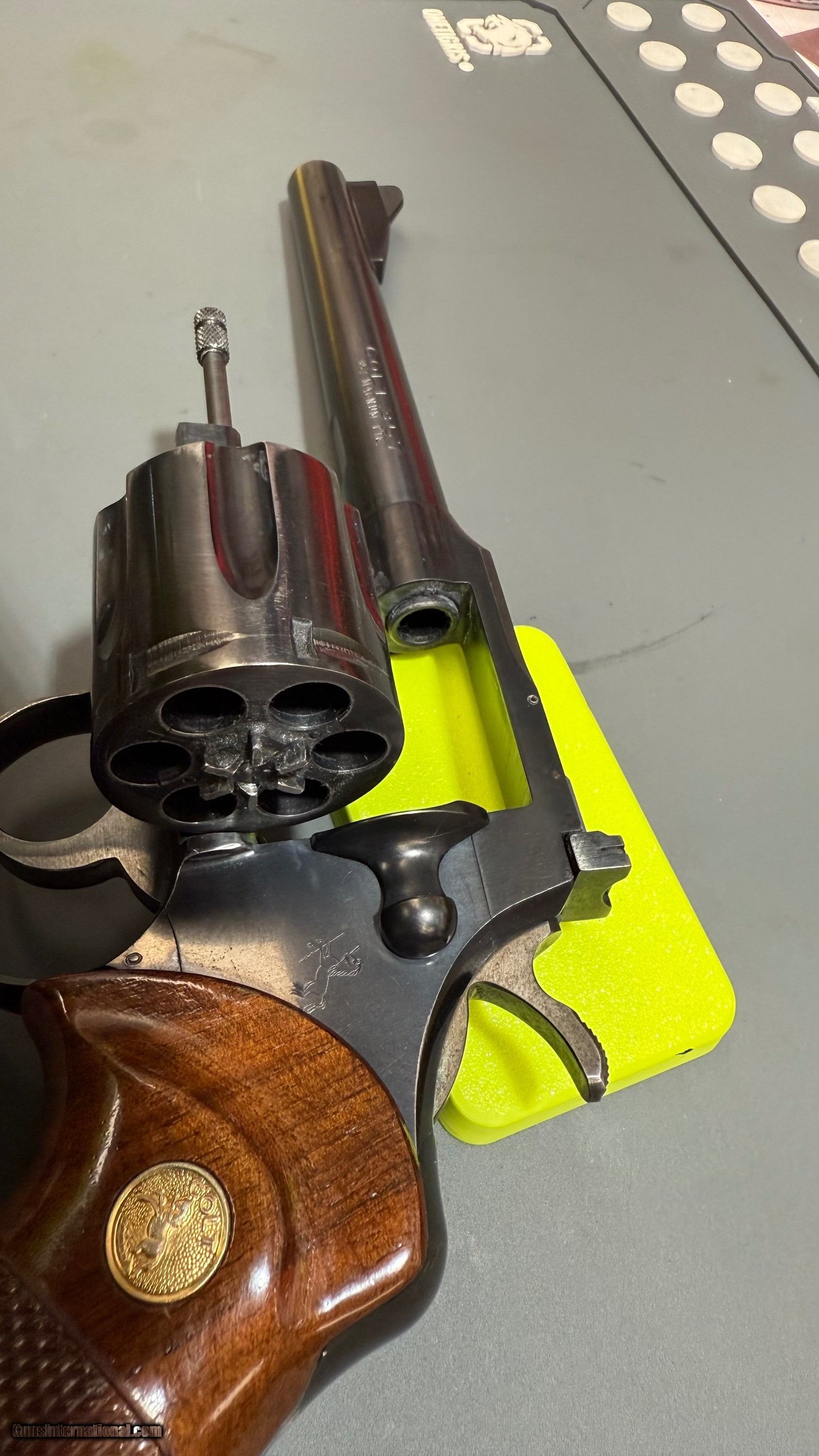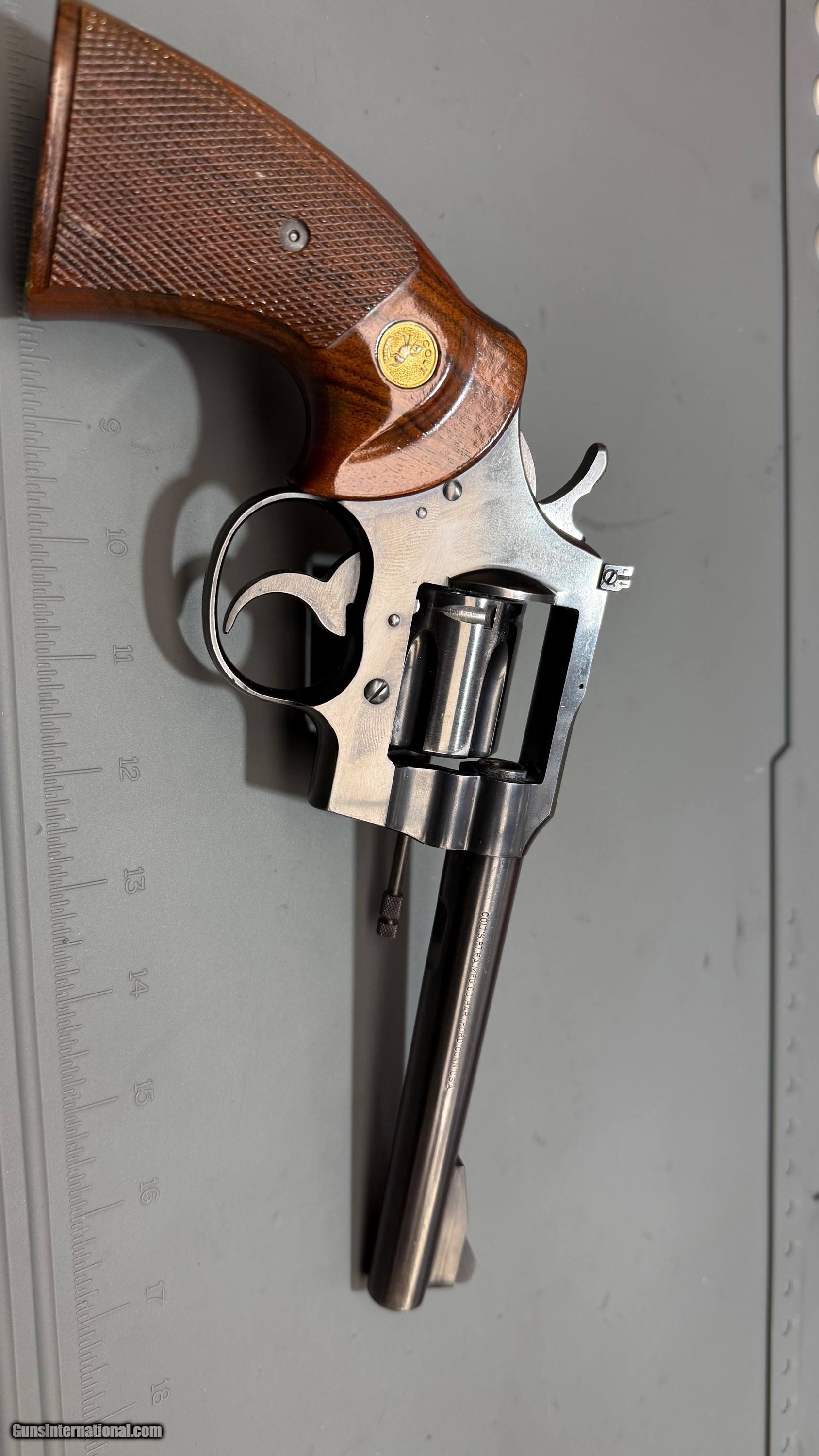 Description: The 357 model outwardly had a close resemblance to the new Trooper models, since they used the same frame size and action. The new 357 and Trooper were virtually indistinguishable without a close inspection. While the Trooper was to be a lower-cost model, the new 357 was to be Colt's premium model holster revolver with a more carefully fitted and tuned action and a better external finish. The idea was that law enforcement and civilian buyers wanting a less expensive adjustable sight revolver would buy the Trooper, buyers wanting the .357 Magnum cartridge or wanting a higher quality gun would buy the 357. Things got confused in 1955 when Colt introduced the "Super Premium" Colt Python. Buyers wanting a cheaper gun continued to buy the Trooper, but those wanting a better gun were buying the new Python. This left the 357 as odd man out, and in 1961, Colt discontinued the 357 model after about 15,000 had been produced. Handgun Caliber: .357 Magnum Serial Number: 262490 Barrel Length: 6 Price: $1,700.00 Buy Now Contact Seller |
