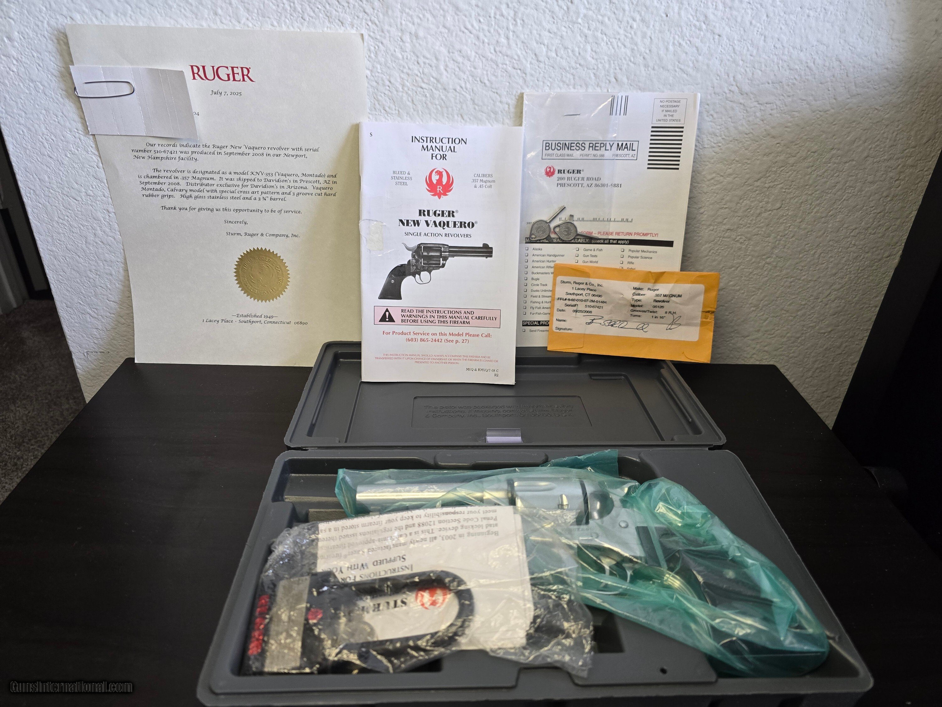 Description: Ruger Vaquero Montado - Davidson's Exclusive (2009) UNFIRED - Complete Factory Package - Investment Grade This discontinued Davidson's Special Order Exclusive Ruger Vaquero Montado remains in pristine, factory-new condition. Still wrapped in original protective packaging—never fired, never holstered. Chambering: .357 Magnum (6-shot capacity) Finish: Hi-Gloss Stainless Steel Barrel: 3-3/4" (optimized for cowboy mounted shooting) Included - Complete As-Shipped Package: