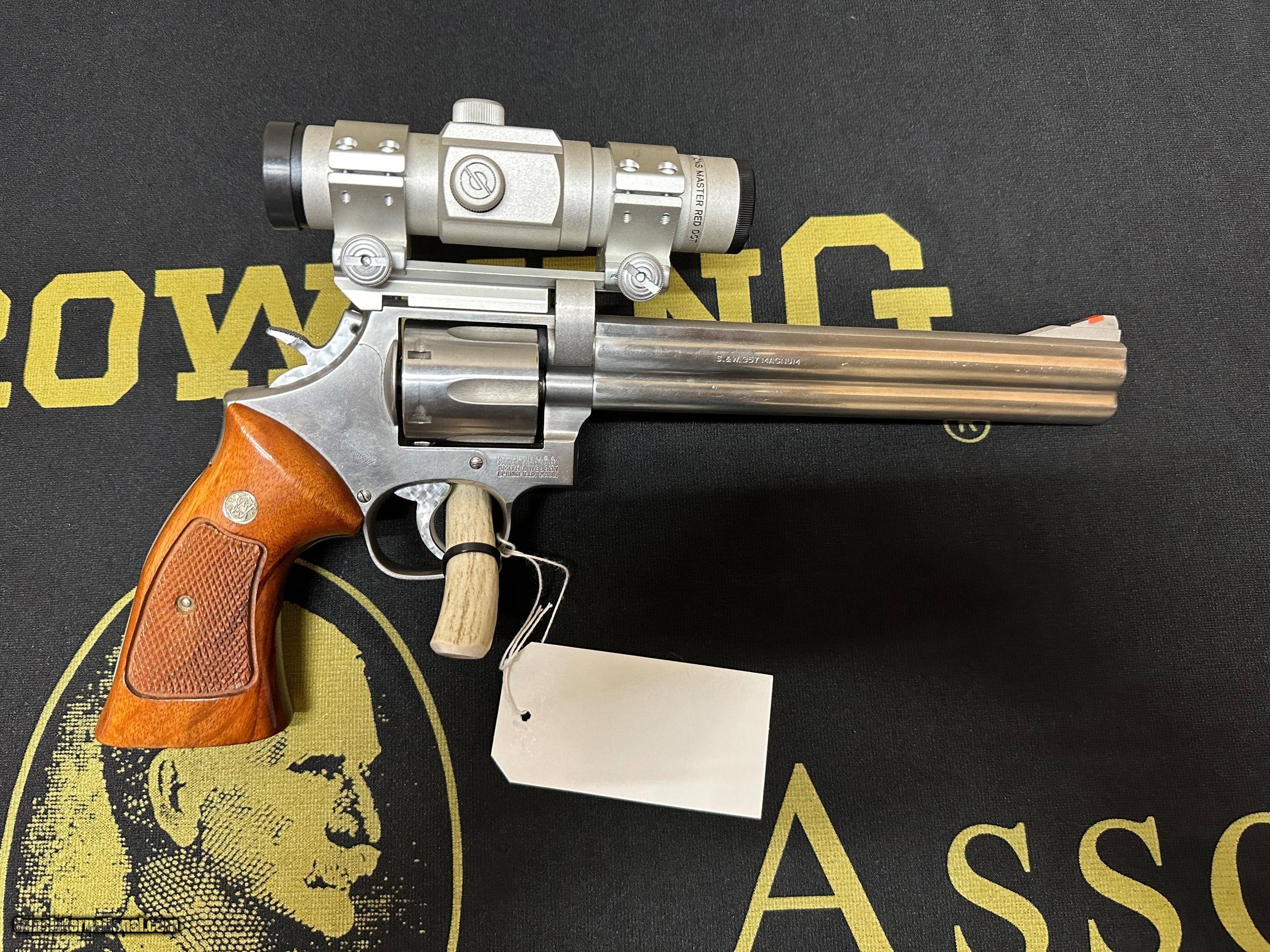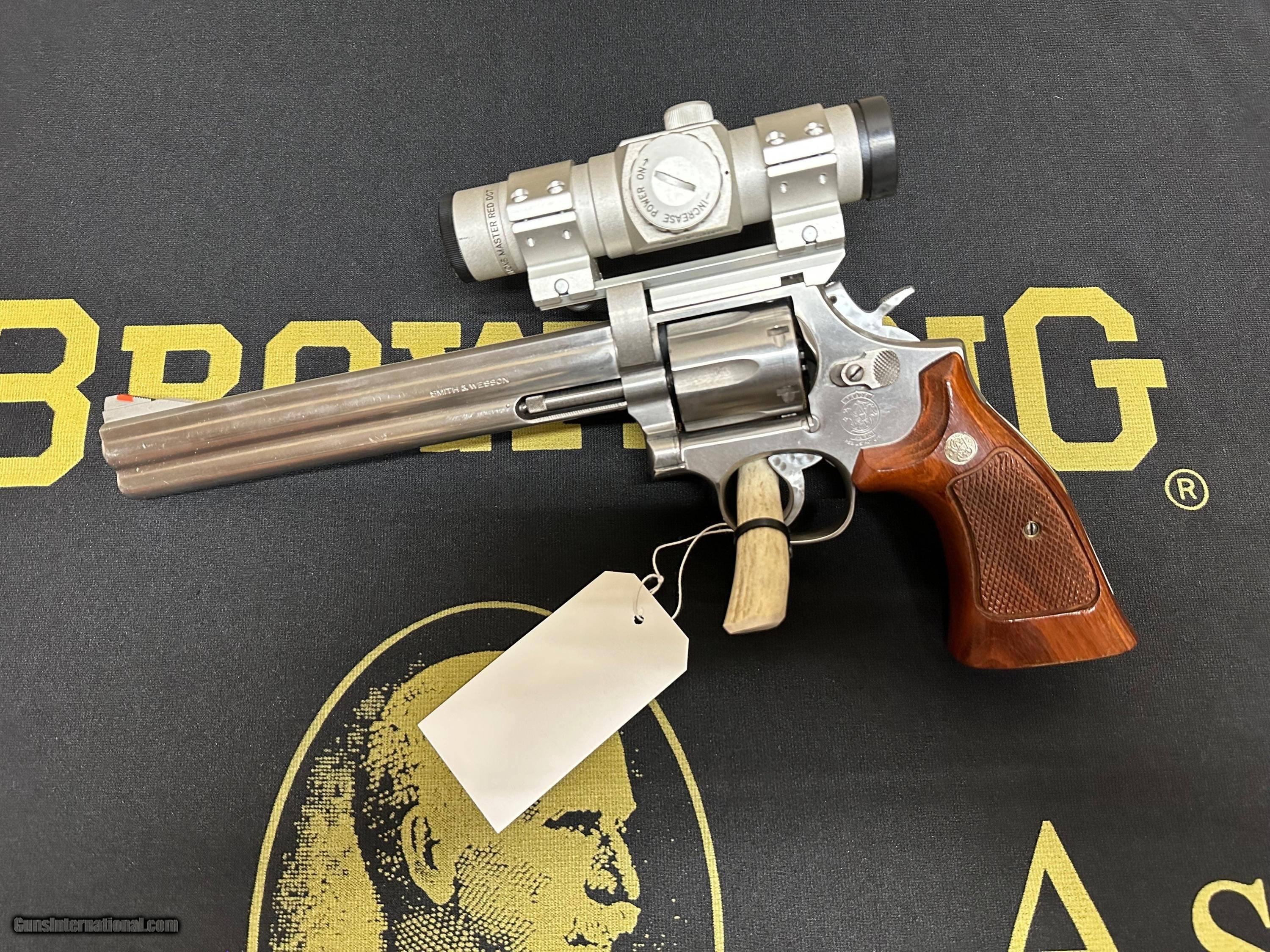 Description: Smith & wesson 686-1. 8 3/8" barrel. Chambered in .357 magnum. Original wood grips. Includes a Simmons master red dot. For more information about this revolver or for purchasing it ((( PLEASE GIVE US A CALL AT ))) 1-(479)-968-4106. PRICE - $1,200 + Shipping SOLD Handgun Caliber: .357 Magnum Manufacturer: Smith & Wesson Model: 686-1 Serial Number: AU U 1786 C1 54218 Barrel Length: 8 3/8” Action: Double Sights: Simmons Red Dot Item Location: Arkansas |