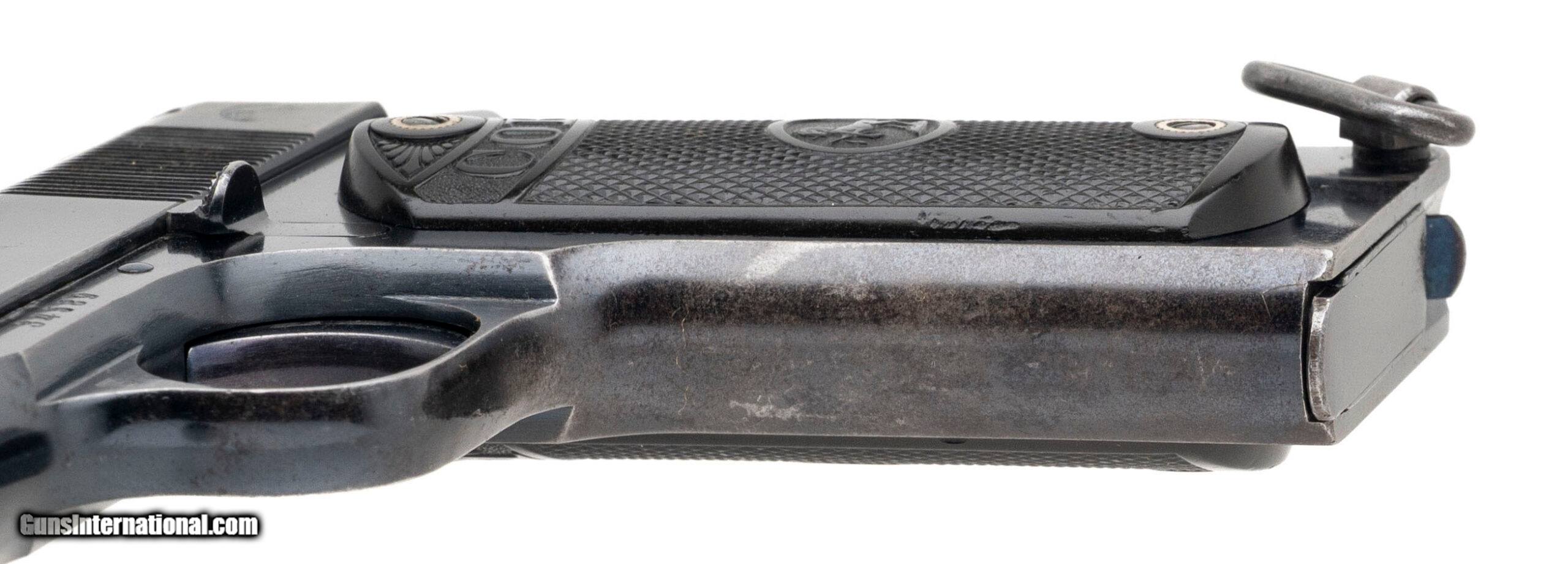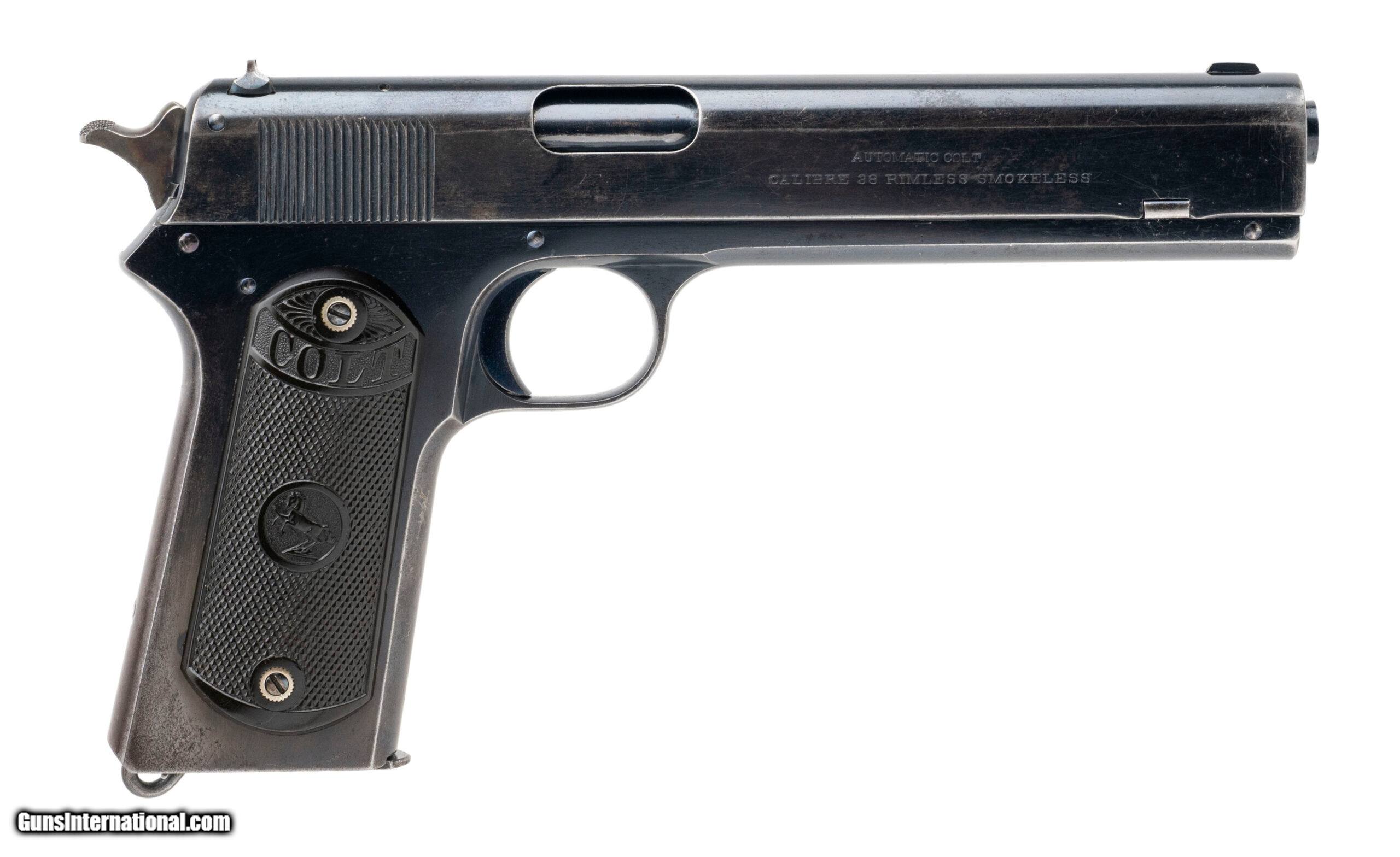 Description: "Serial number 34589. Made in 1912. 38 Rimless Colt caliber with a 6" barrel. This gun is in excellent condition with 90% of the original blue on the slide and 70% of the original blue on the frame with the back strap being the area that has turned to a brown patina. The grips are excellent. This gun comes in an original military style holster along with abelt and pouch with an extra magazine. The grips are excellent. Curio/Relic: Yes Price: $3,995.00 Contact Seller |