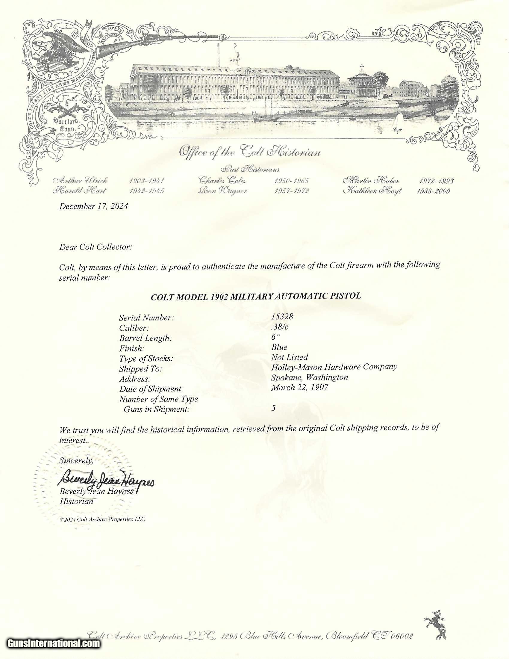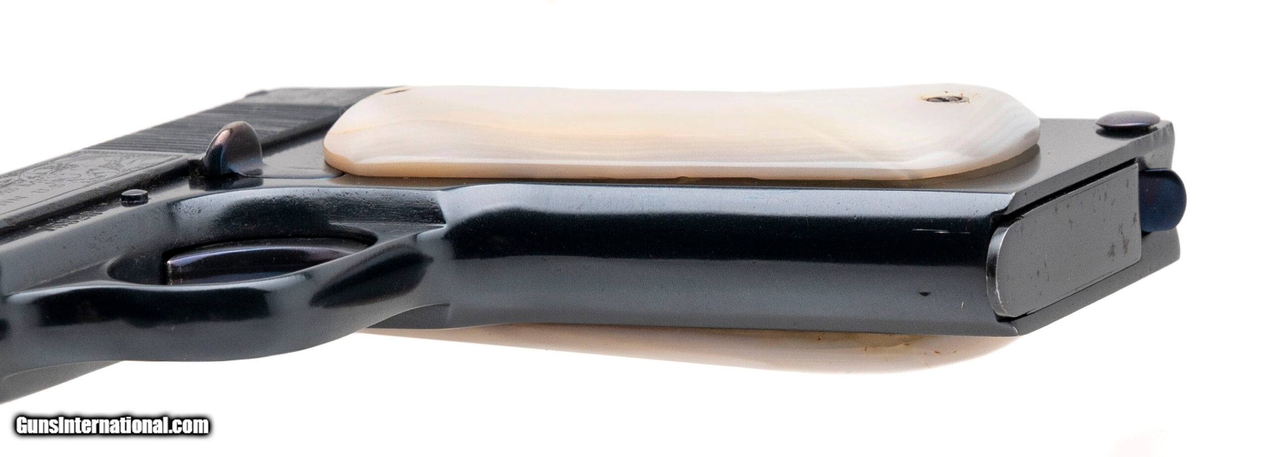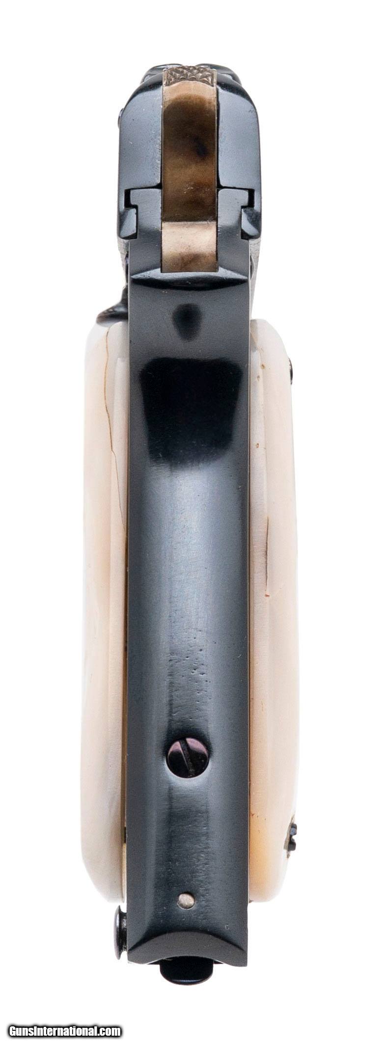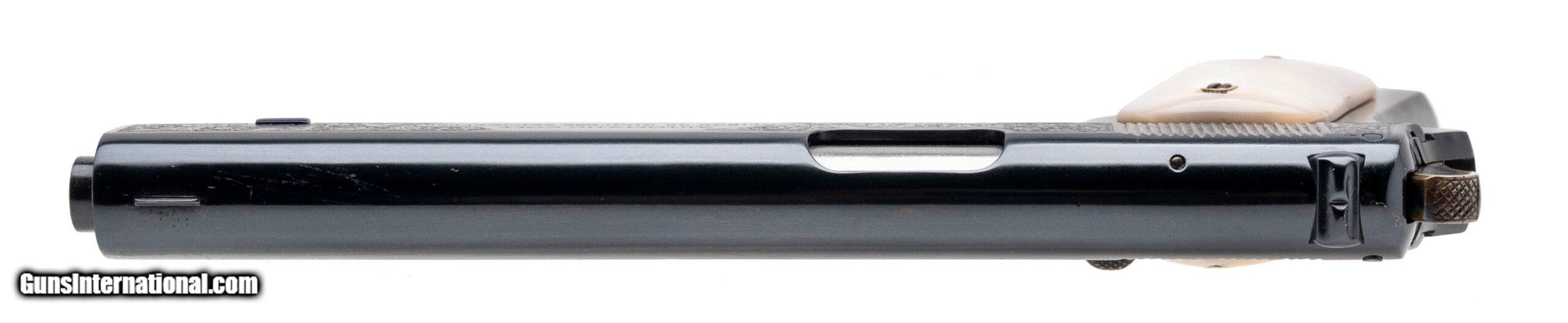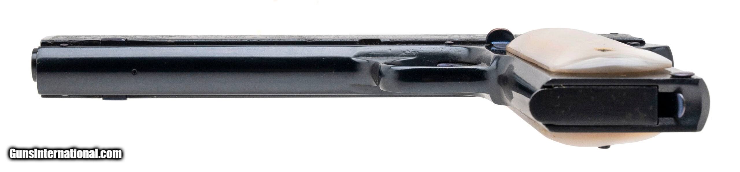 Description: "Serial number 15328. Made in 1907. 38 Colt Automatic caliber with a 6" barrel. This gun is in as new condition as custom engraved and finished The slide is engraved while the frame is not. The engraving is of good quality. The finish is fantastic with excellent polish work and rich dark high luster blue. The grips are excellent Mother of pearl. This gun comes with a factory letter. It was shipped to Holley – Mason Hardware in Spokane, Washington. Holley – Mason Hardware had the first reinforced concrete building in the state of Washington built in 1905. The building still stands to this day. Price: $4,995.00 Contact Seller |
