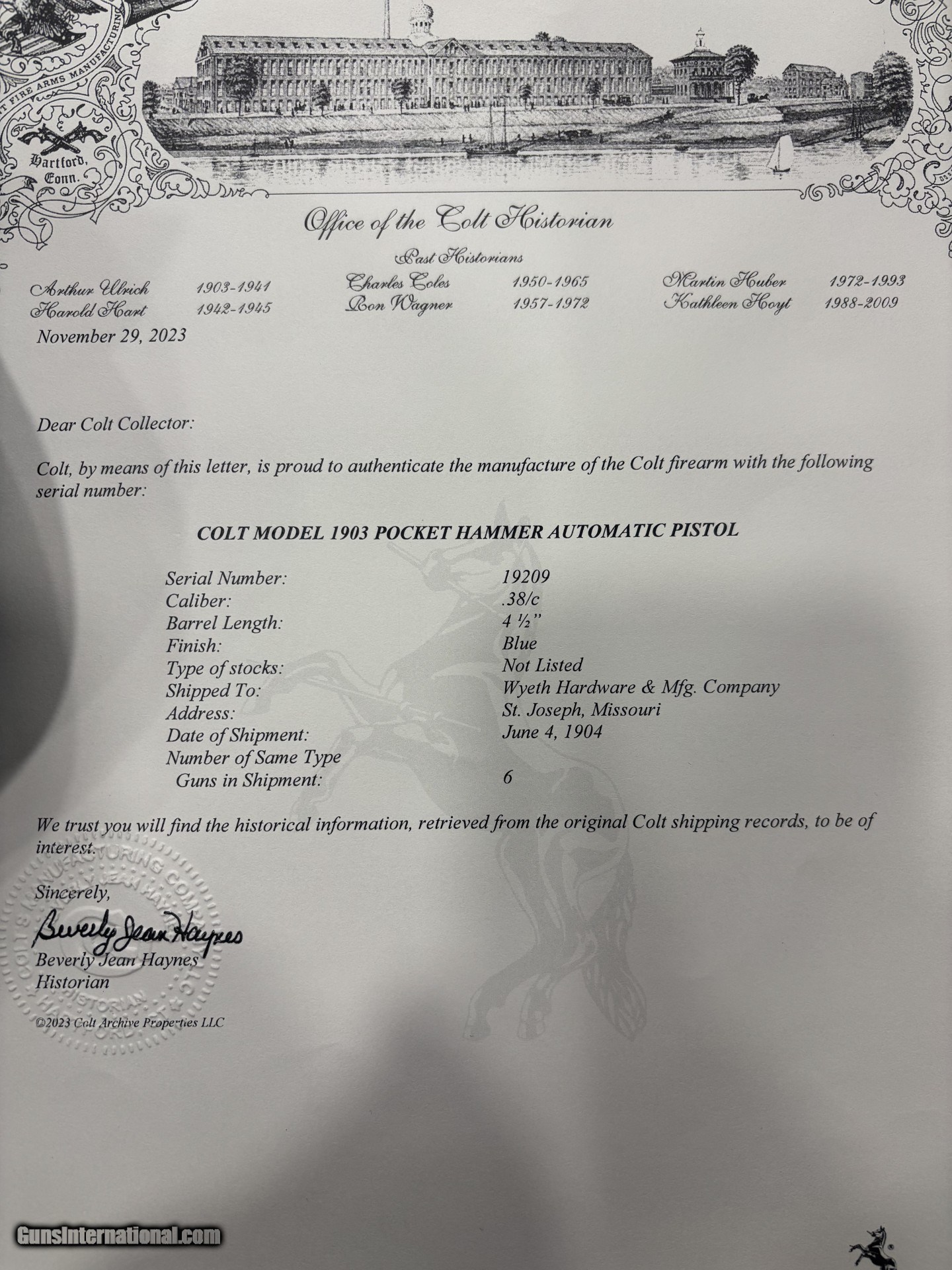 COLT 1903 POCKET HAMMER AUTOMATIC PISTOL .38 ACP