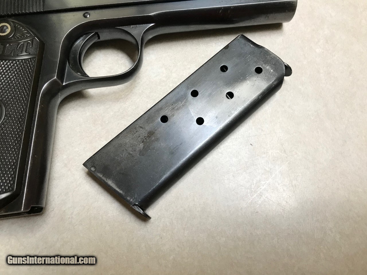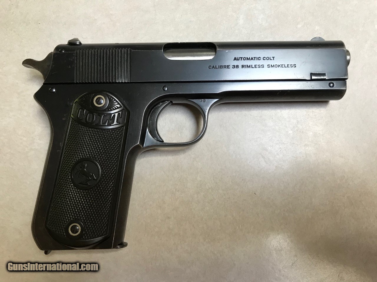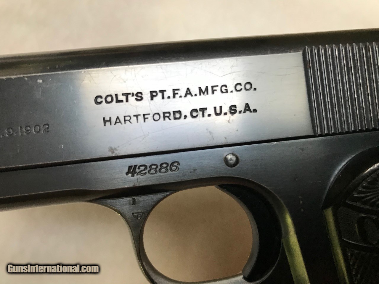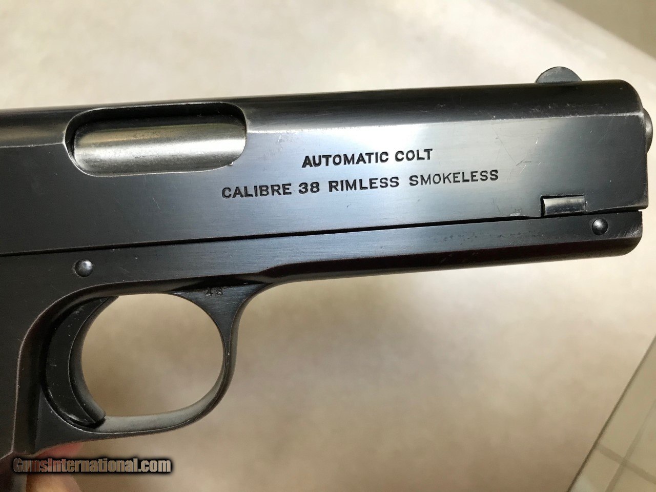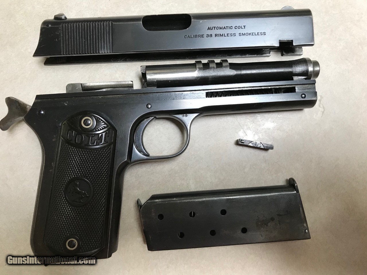 Description: Colt 1903 Pocket Hammer 38ACP cal. SER# 42886 MFG in 1920 Original blue finish . All original parts and very nice grips. Excellent Bore, mechanically perfect. correct polished in the white end of the barrel and polished hood of barrel. the Cross pin up front is minty . nice trigger pull. grips in great shape grip screws are very nice, magazine has the correct words on the bottom. the finish on the sides of the mag have thinning blue finish. I have shot this piece with Factory 38 acp ammo and it functioned perfect and at 20 yards will put a grouping of 25 rounds that you can cover with your fist. Very accurate shooter. All in all still a nice piece in very nice condition.The front and rear strap have a blue brown patina. You can see these gangster guns in many old movies. Call with any questions any time. Tom 612 859 5673 FFL or C+R needed Cashiers ck or Postal money orders please. ( SALE PENDING ) SOLD SOLD Curio/Relic: Yes Handgun Caliber: .38 Auto (.38 ACP) |