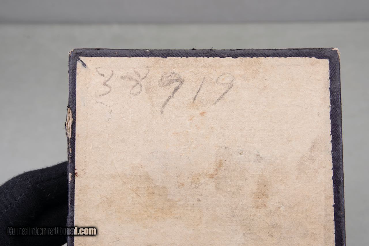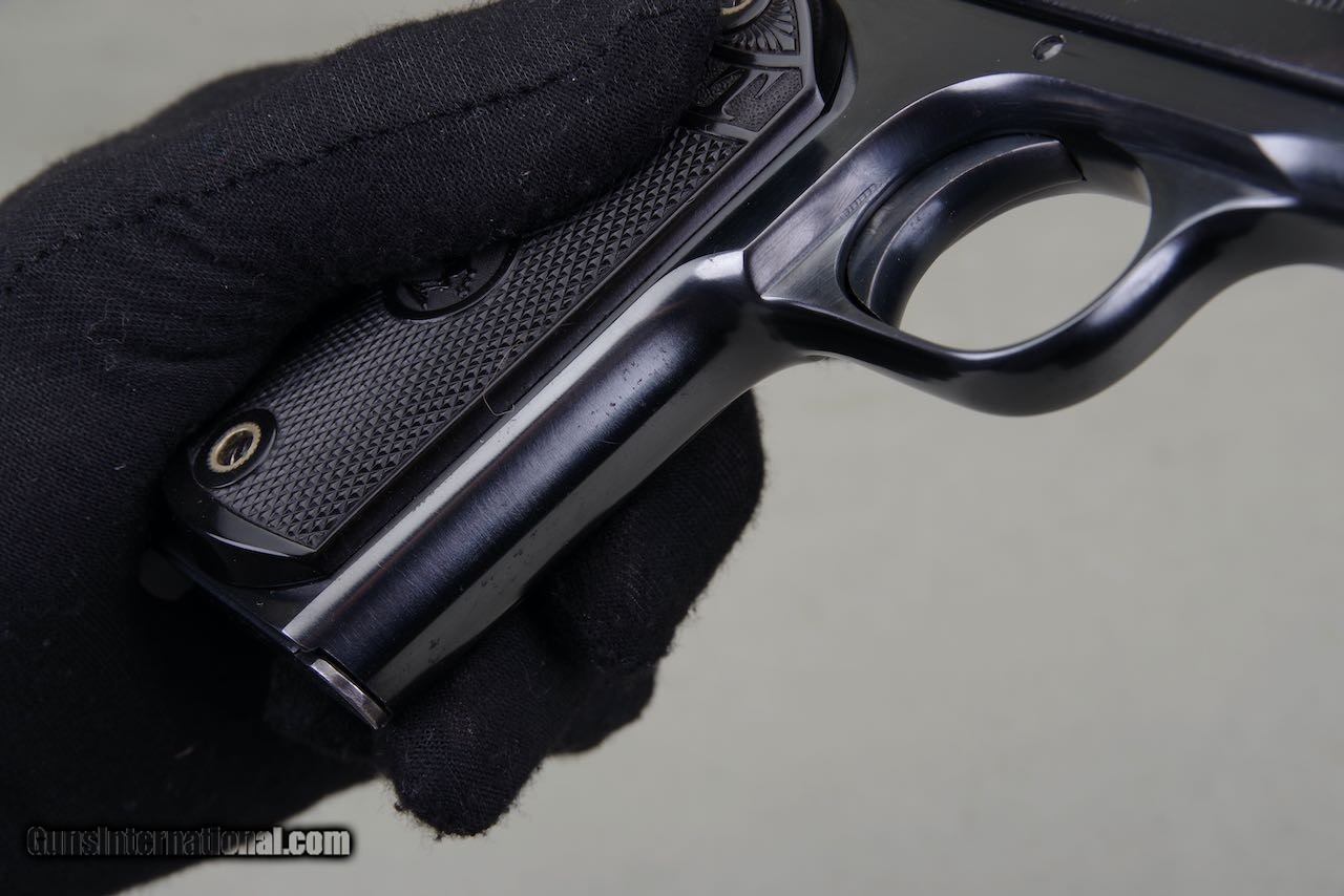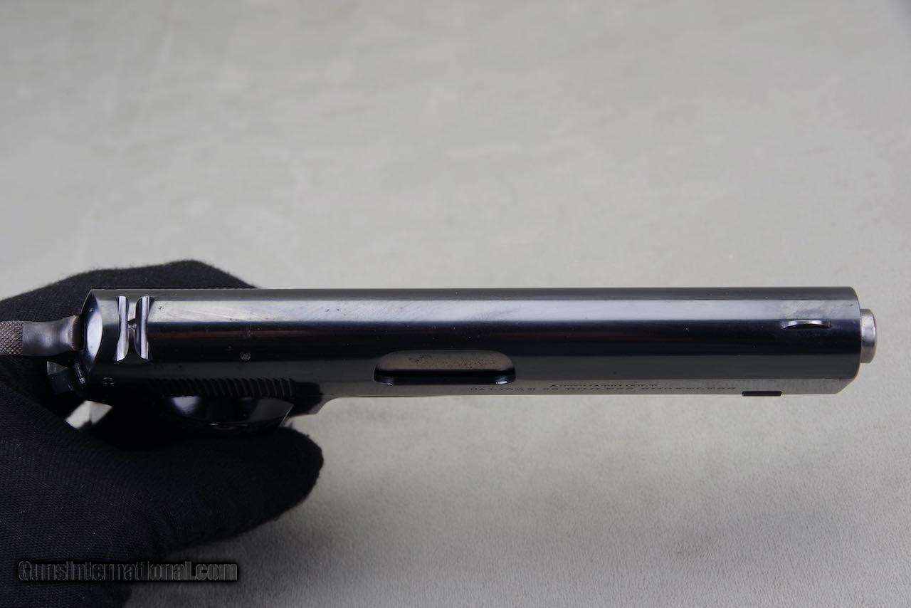 Description: 1917 Colt Model 1903 Pocket Hammer chambered in 38 ACP with a 4.5 inch barrel and factory original oven blue finish. Also included is the original box numbered to the gun with the paperwork shown. This is a high condition all original survivor. Almost all of the finish still retains a deep dark shine throughout. Outside of a trace of silvering at the upper part of the muzzle the leading edges are sharp. The grip straps are exceptional. As seen in the photos there are a few areas of pin prick peppering and light and scattered handling. Overall the finish rates 97%. The boare is bright and shiny with strong lands and grooves. The chamber area is very clean. The slide to frame fit is tight. The factory grips are exceptional with sharp checkers throughout. This is a very nice and complete 107 year old package. SOLD Curio/Relic: Yes Handgun Caliber: .38 Auto (.38 ACP) Manufacturer: Colt Model: 1903 Pocket Hammer Serial Number: 38919 |
