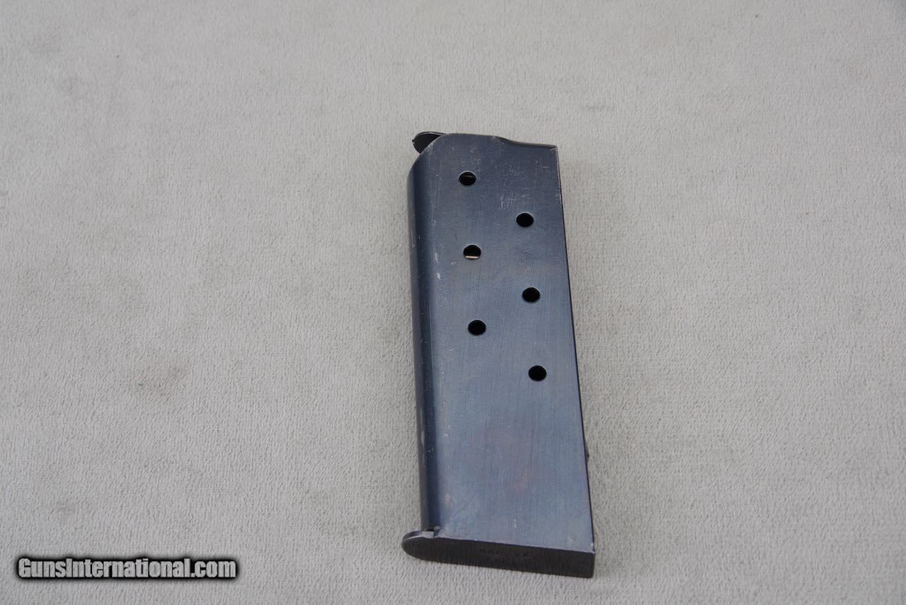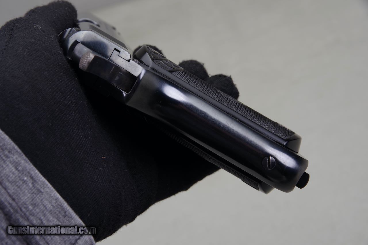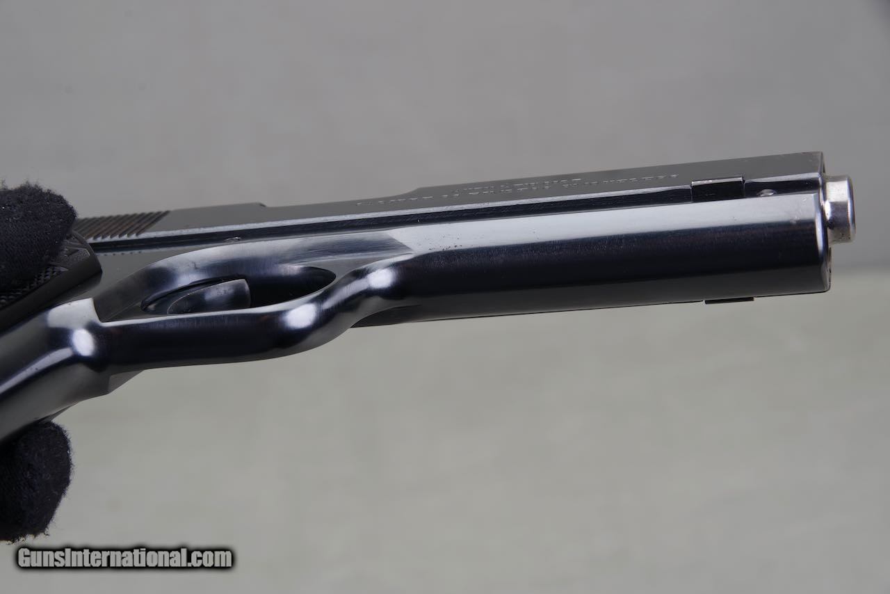 Description: 1917 Colt Model 1903 Pocket Hammer chambered in 38 ACP with a 4.5 inch barrel and factory original oven blue finish. Also included is the original box numbered to the gun with the paperwork shown. This is a high condition all original survivor. Almost all of the finish still retains a deep dark shine throughout. Outside of a trace of silvering at the upper part of the muzzle the leading edges are sharp. The grip straps are exceptional. As seen in the photos there are a few areas of pin prick peppering and light and scattered handling. Overall the finish rates 97%. The boare is bright and shiny with strong lands and grooves. The chamber area is very clean. The slide to frame fit is tight. The factory grips are exceptional with sharp checkers throughout. This is a very nice and complete 107 year old package. SOLD Curio/Relic: Yes Handgun Caliber: .38 Auto (.38 ACP) Manufacturer: Colt Model: 1903 Pocket Hammer Serial Number: 38919 |