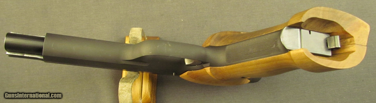 Description: Serial #P201440, .38 Special Wad-Cutter, 5 7/8” barrel with an excellent, bright bore. This rare precision target pistol exhibits the same unyieldingly high quality of workmanship and materials as its better known P-210 cousin and retains 99% of the original blue finish with only a few barely discernible specks of silvering along a handful of the high edges. The contoured walnut target grips have a dull, glare-free finish and virtually no handling marks or blemishes on either panel. The pistol is housed in a black plastic case with two magazines, original combo-tool, and manual. These pistols were only imported in very small numbers from the mid-'70s to the mid-'80s. This example is in excellent overall condition and would make a stellar addition to any collection. FFL SOLD Manufacturer: Sig Model: 240 Serial Number: P201440 Caliber Info: .38 Spl Gauge Info: .38 Spl |