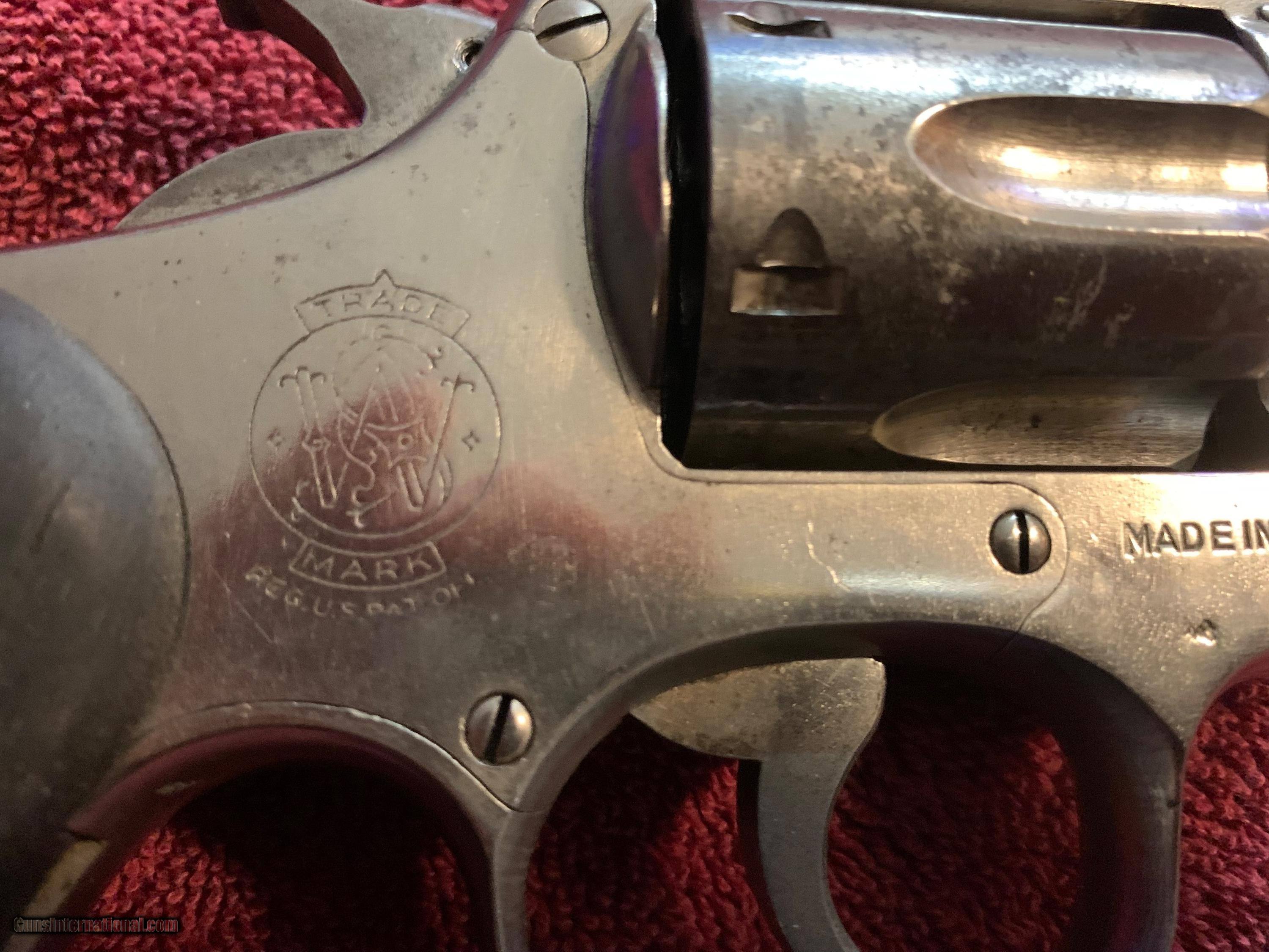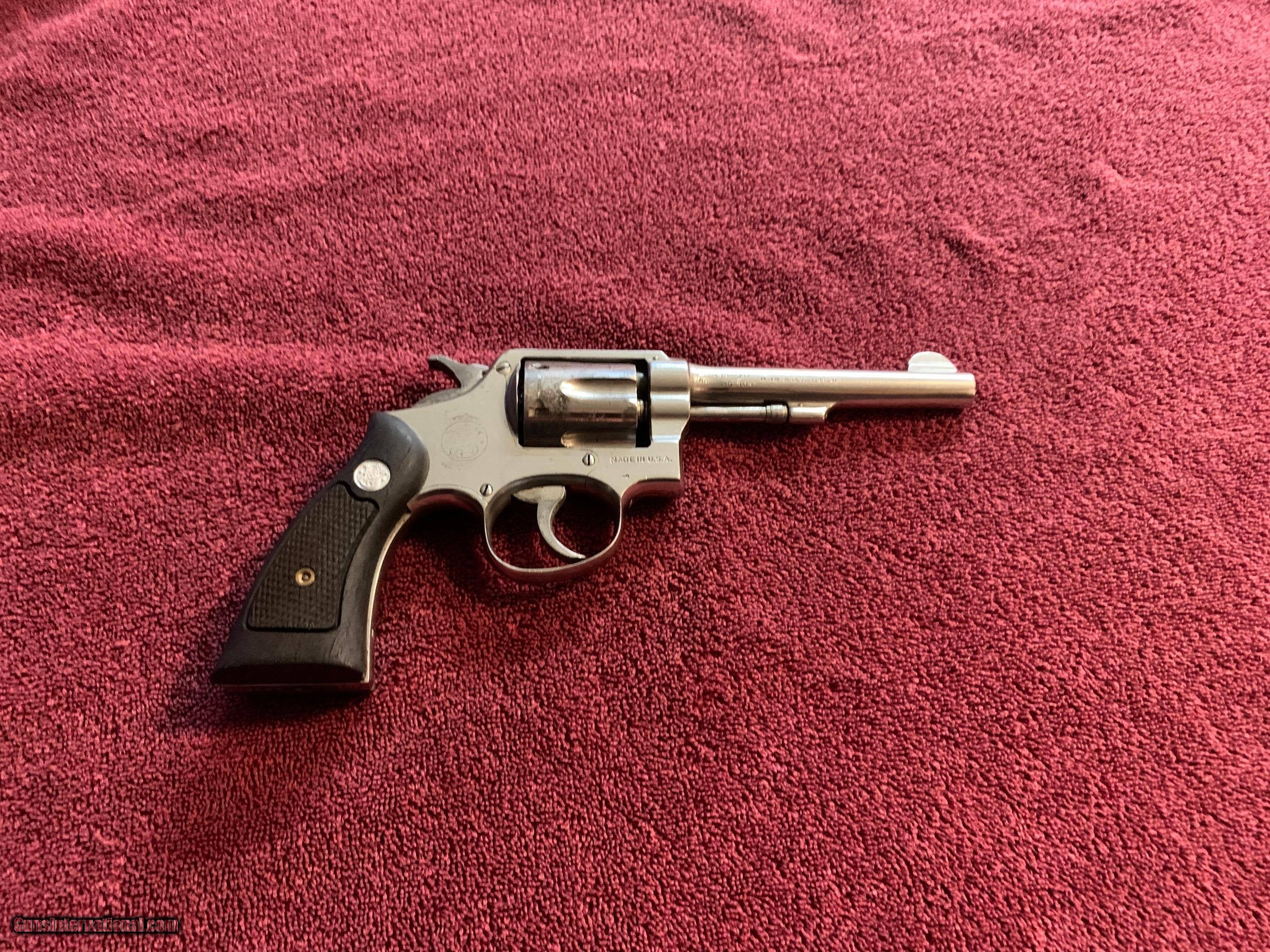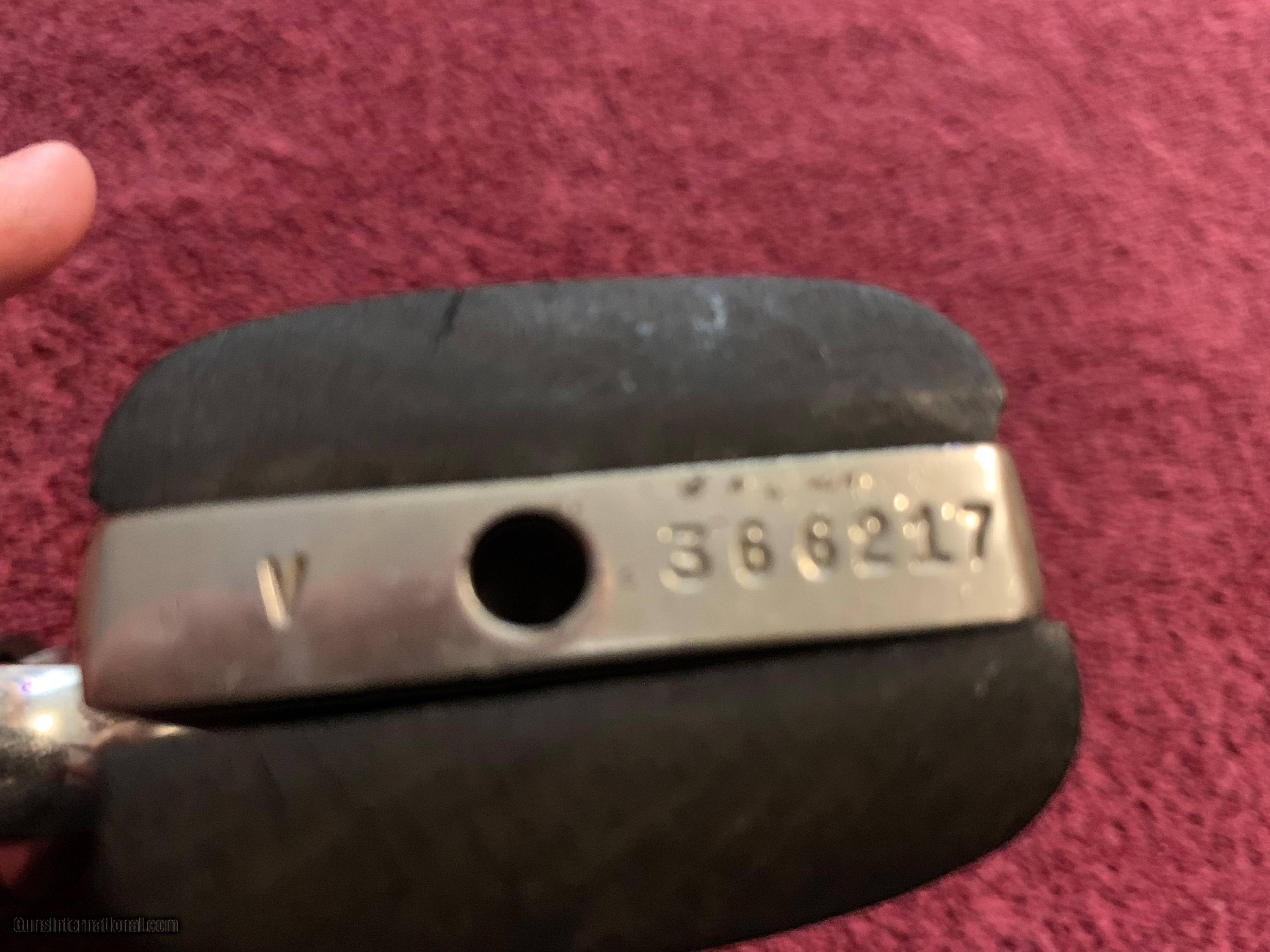 Description: Smith and Wesson 38 Victory from the Lend-Lease Program during WWII. Display only. Shoots, but bulges brass SOLD Handgun Caliber: .38 Special Manufacturer: Smith and Wesson Model: Victory Serial Number: 366217 Barrel Length: 5 inches Condition: fair Metal Condition: fair Wood Condition: poor |