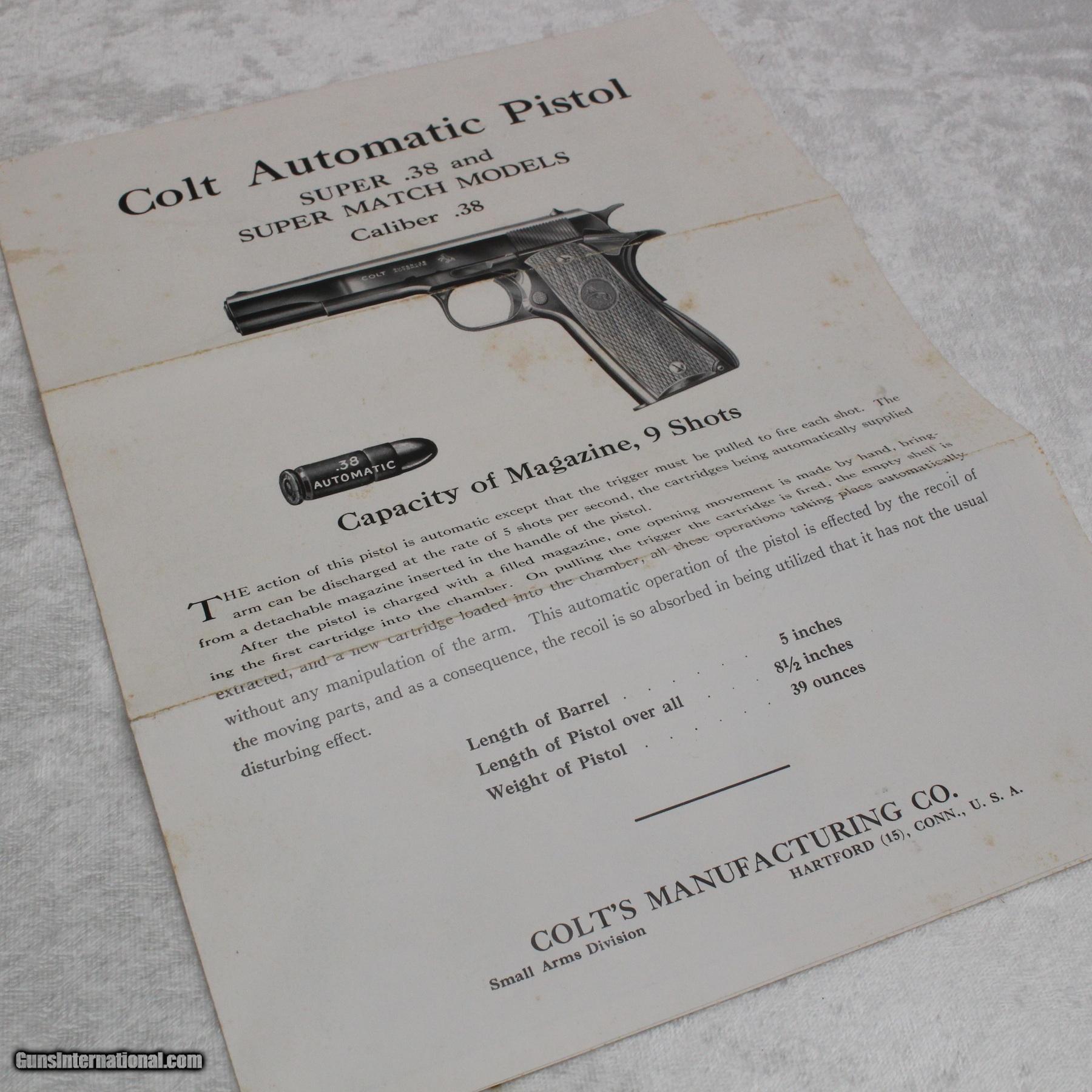 Description: 1949 Colt Pre War/Post War Super .38 Automatic Pistol with the desirable "fat barrel". These early post war 38 Supers utilized war time production parts including 45 slides so the outside diameter of the barrel was the same size as a 45. The slide and frame flats are still bright. The original finish is in excellent condition with a light disassembly mark and other very fine scattered handling marks. Overall the finish rates about 98%. The bore is clean and bright. The trigger has a crisp clean break, and the grips are beautiful with no shrinkage. Also included is a spare magazine and original flyer with sectional view, detailed description, and operation/disassembly instructions. SOLD Curio/Relic: Yes Manufacturer: Colt Model: Super .38 Automatic Pistol Caliber Info: .38 Super Condition: Excellent Manufacture Date: 1949 Item Location: Arizona |