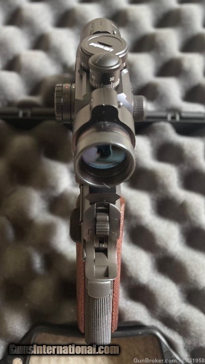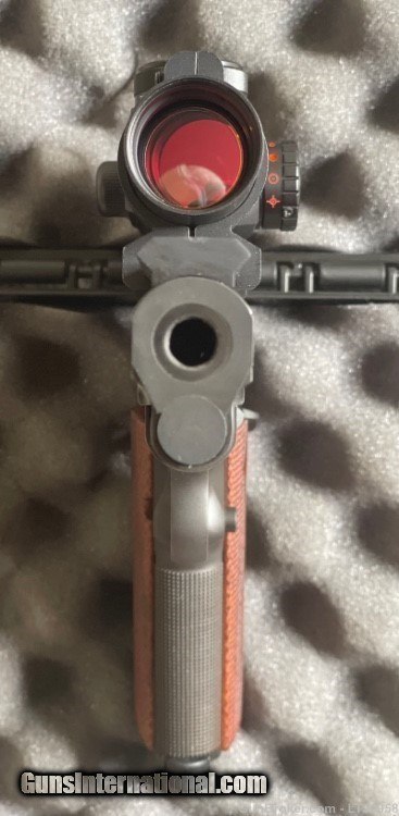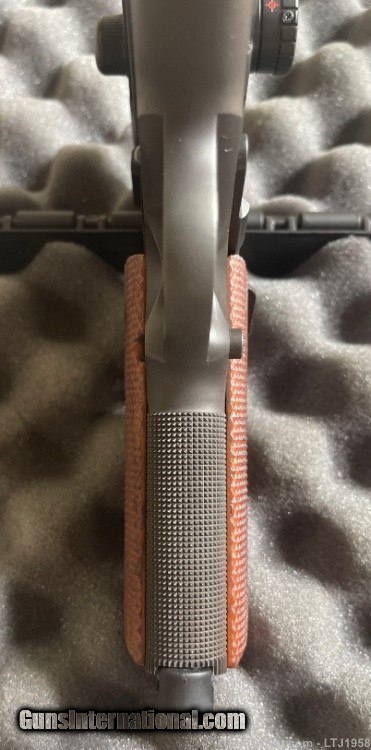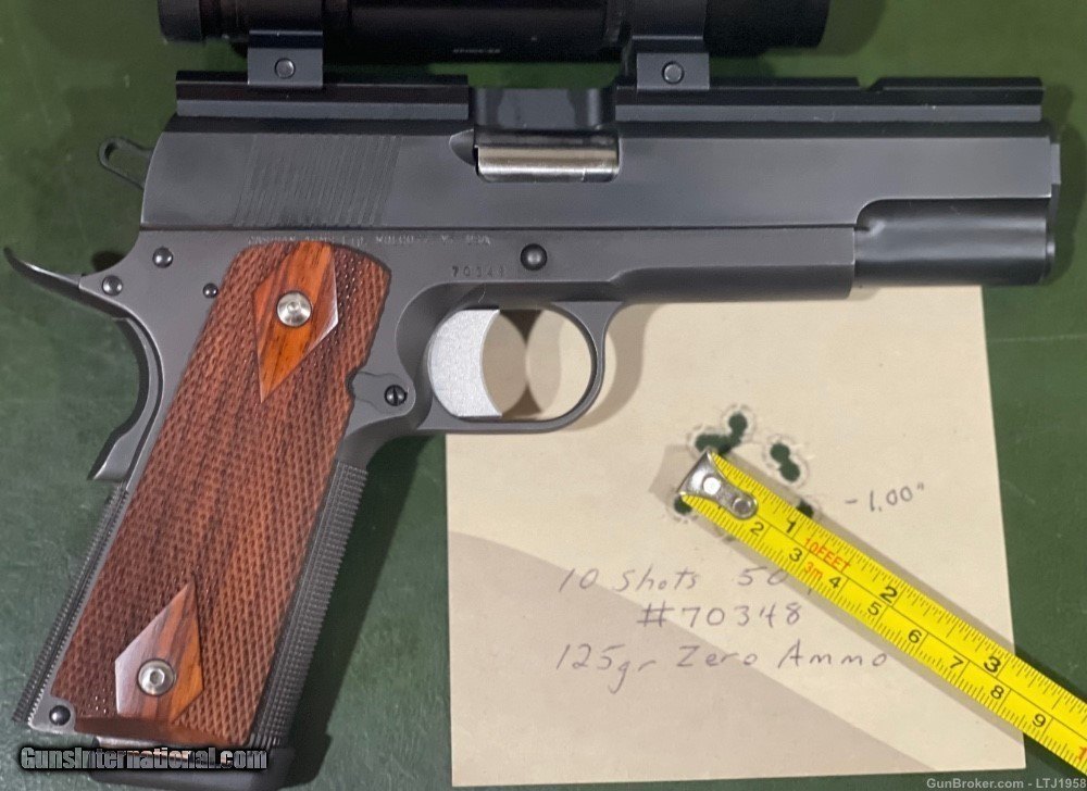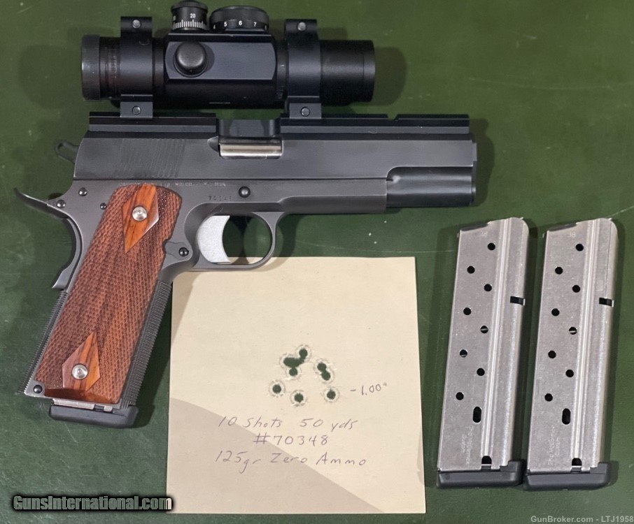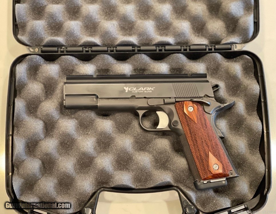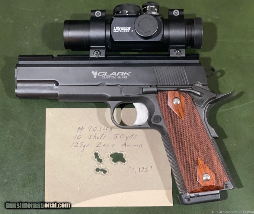 Description: New Clark Custom Premium Bullseye 38 Super pistol. A complete custom built by Clark in Princeton Louisiana in 2022. The pistol is built on a Caspian Frame with all custom parts, slide and fitting, Clark Match Crowned 5" Barrel with Custom Bullnose bushing, custom Clark Trigger 2.5#, custom adjustable rear sight and green fiber optic front sight. Low luster Custom Clark Charcoal finish, 25 line checkering on front and back strap, Custom Cocobolo Grips, Two Stainless 9 shot magazines, Clark custom picatinny full length rail. The Ultradot Matchdot ll sight comes with the pistol and is also new with the box and instructions. The accuracy is amazing with two targets supplied by Clark Customs, shot from their factory Ransom Rest, 10 shot groups of 1.00 inches and 1.125" at 50 yards! A custom build like this pistol will take a year to build, this is a great opportunity to own one of the very best Custom 1911 Match grade pistols made today. SOLD Handgun Caliber: .38 Super Auto Manufacturer: Clark Custom Model: 1911 Premium Bullseye Condition: New Metal Condition: New Wood Condition: New Bore Condition: New Finish: Charcoal bluing Sights: Adjustable |