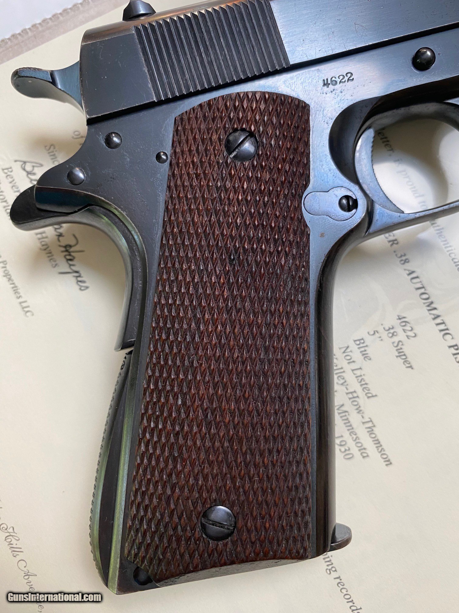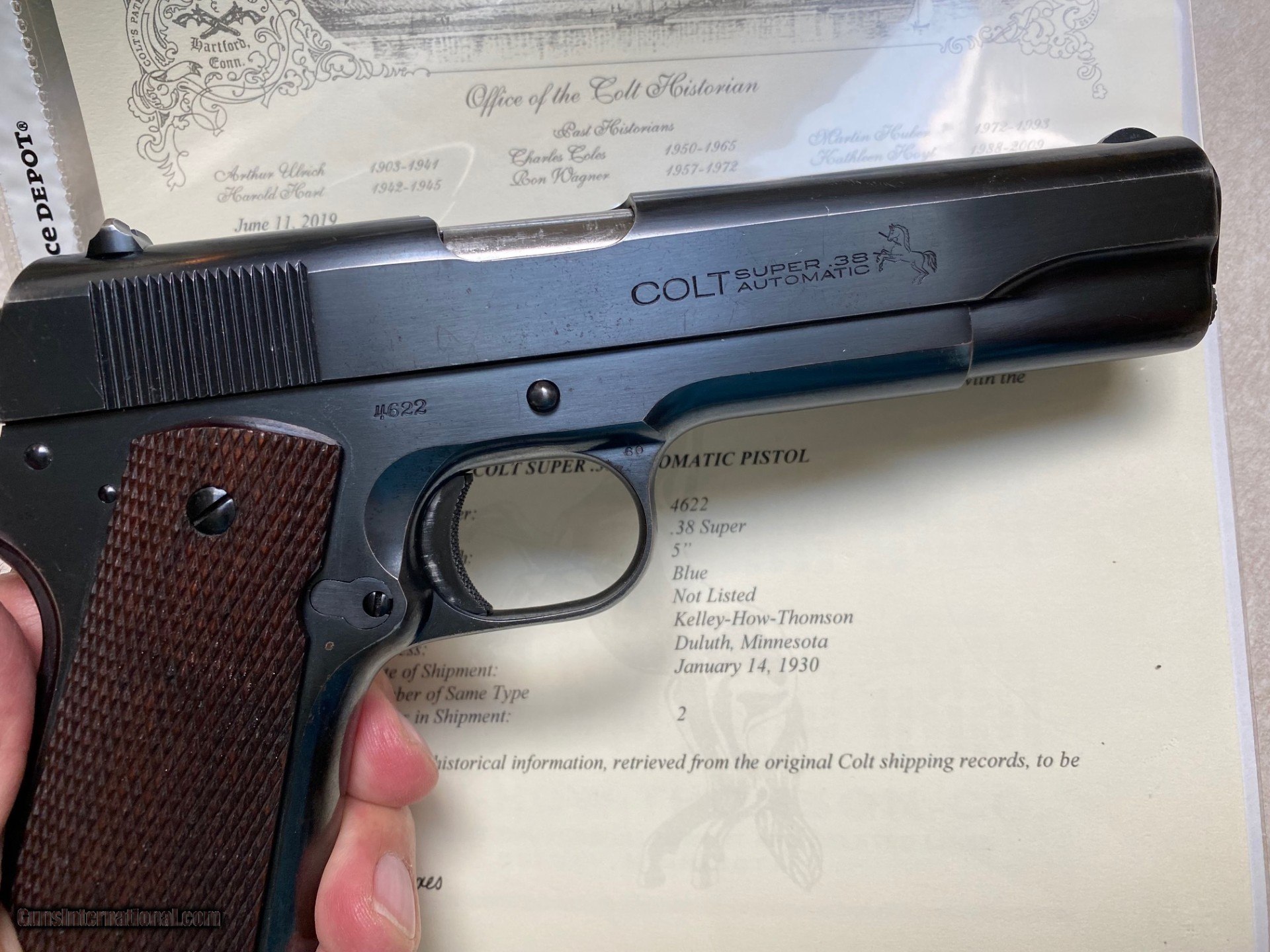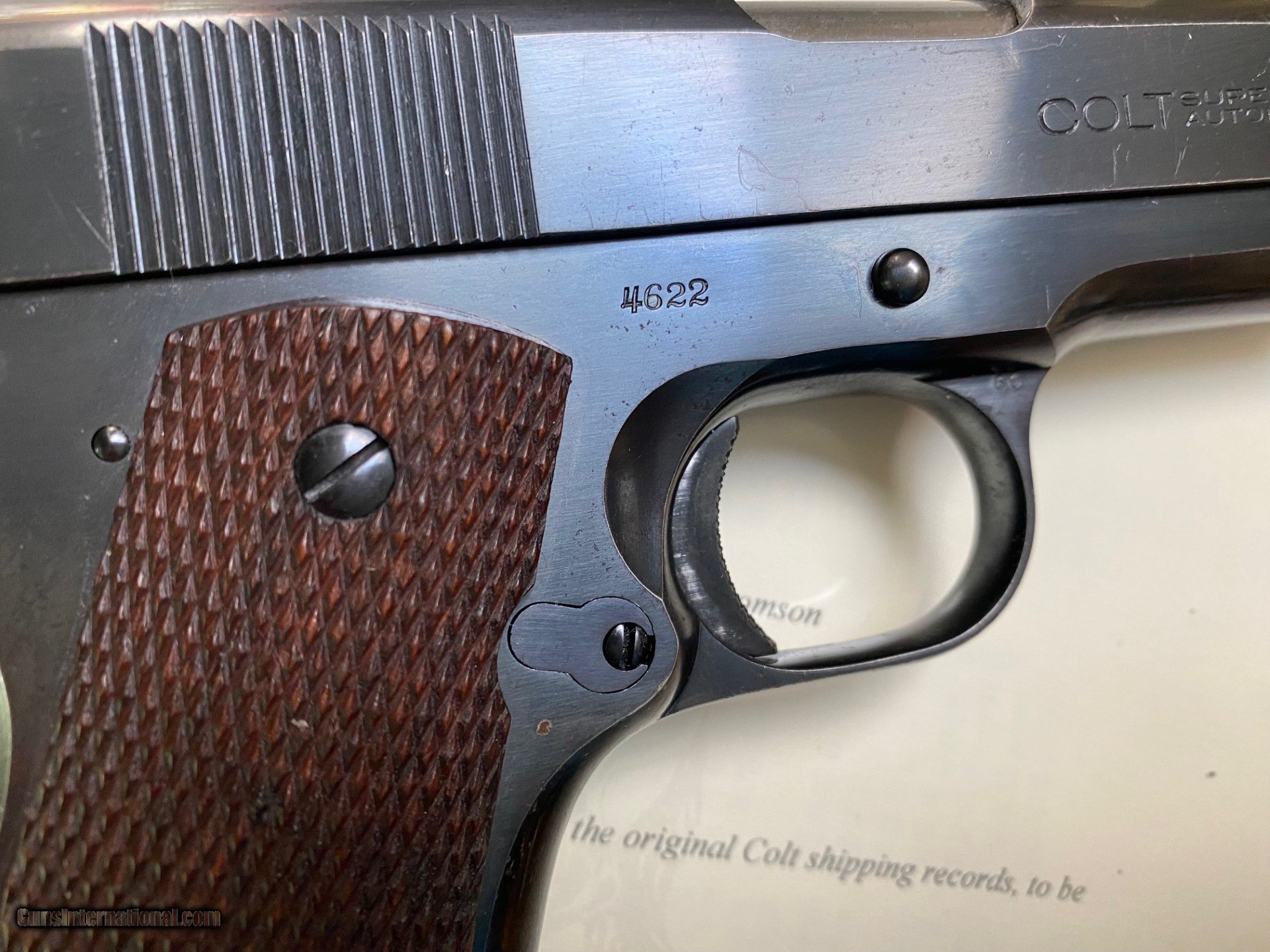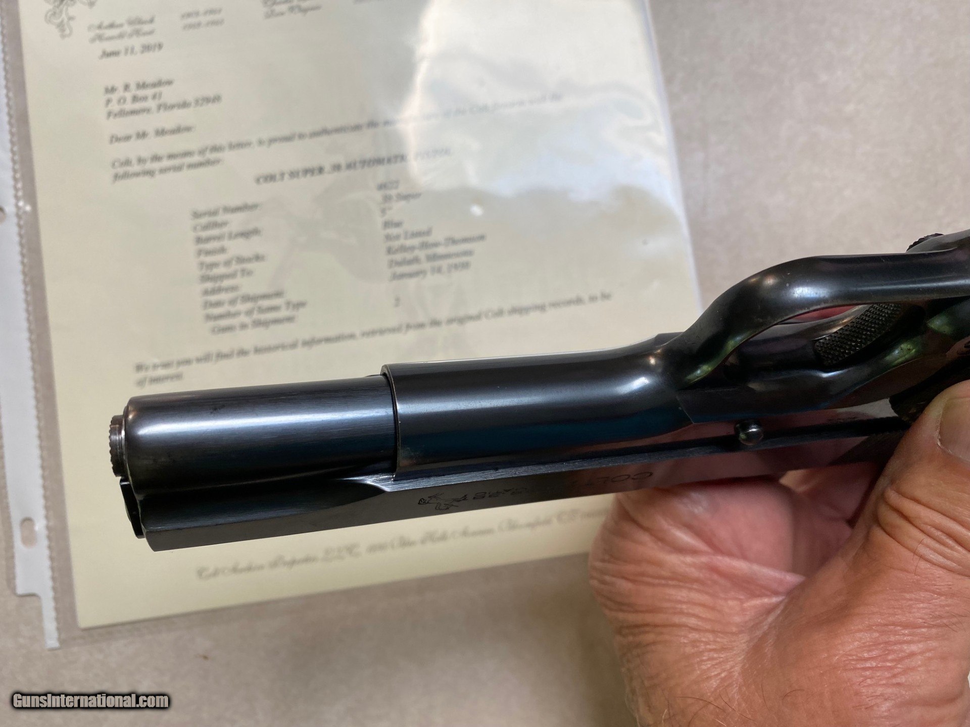 Description: Colt 38 super pre war. Made in 1929 the first year of production. Serial Number 4622 1929. A copy of the colt letter is included. . All original finish and all original parts. The Bore is minty, the mechanics are perfect and in perfect working order. It has very nice high polish finish.The finish is so much nicer and smoother than the pictures it has a polished nice finish not shown by the pictures. The magazine is correct for this piece. The grips are original and in excellent condition. A hard to come by 1929 in this shape. Its very tight and functions as it should and it is a tack driver as i have shot it a few times.It looks as though it hasent been shot much at all. The front strap has very minor wear marks. The barrel is un marked as its supposed to be. Its a totally correct 1929 super with a high percentage of original finish. A few small dummy marks but not very noticable. A nice piece of any collection. The receiver Kelly How Thompson in Duluth Minnesota is in the picture included in the discription. near the bridge. You will be pleased with this piece. Its very nice . Call with any Questions Tom 612 859 5673 I need a FFL or C+R to purchase. Price reduced but will only be for sale for a short time now. SOLD |