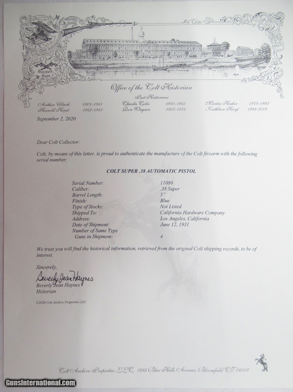 Description: FOR SALE AFTER JAN. 1..Colt Super .38 Automatic Pistol; Serial No. 11080; Per Included Factory Letter; .38 Super Caliber with 5” Barrel and Blue Finish; Shipped to California Hardware Company in Los Angeles, CA. on June 12, 1931 as Part of a 4 Gun Shipment; 100% Correct and Original; Nearly All Original Blue Finish Remains; Perfect Grips; Perfect Bore and Action; Original Magazine; Great 93 Year-Old Super .38; Hard to Improve On; See All Photos for Condition; No Texts; Call (254)541-5765 or Email Only; PERSONAL PROPERTY of Harold Wieser; NOTICE: We Do Not Do Any Consignments - All Items Listed are Owned by Us - NO SALES to New Jersey or New York City - Antiques Only to Massachusetts and California; NOTE: All Modern Firearms Must Go to FFL Dealer who will Accept From Individual with Texas Driver License; Price: $14,975 + $45 S&H Via USPS Priority Mail; Payment Address: Harold Wieser - 1466 U.S. Hwy 77 - Rosebud, TX 76570; SEND PAYMENTS VIA USPS PRIORITY MAIL; BEWARE of SCAMS!!! - DO NOT SEND MONEY or CORRESPONDENTS ELECTRONICALLY UNLESS YOU HAVE SPOKEN to HAROLD WIESER FIRST! (254)541-5765 SOLD Manufacturer: Colt Model: 38 Super Serial Number: 11080 |