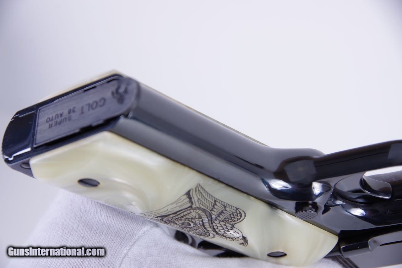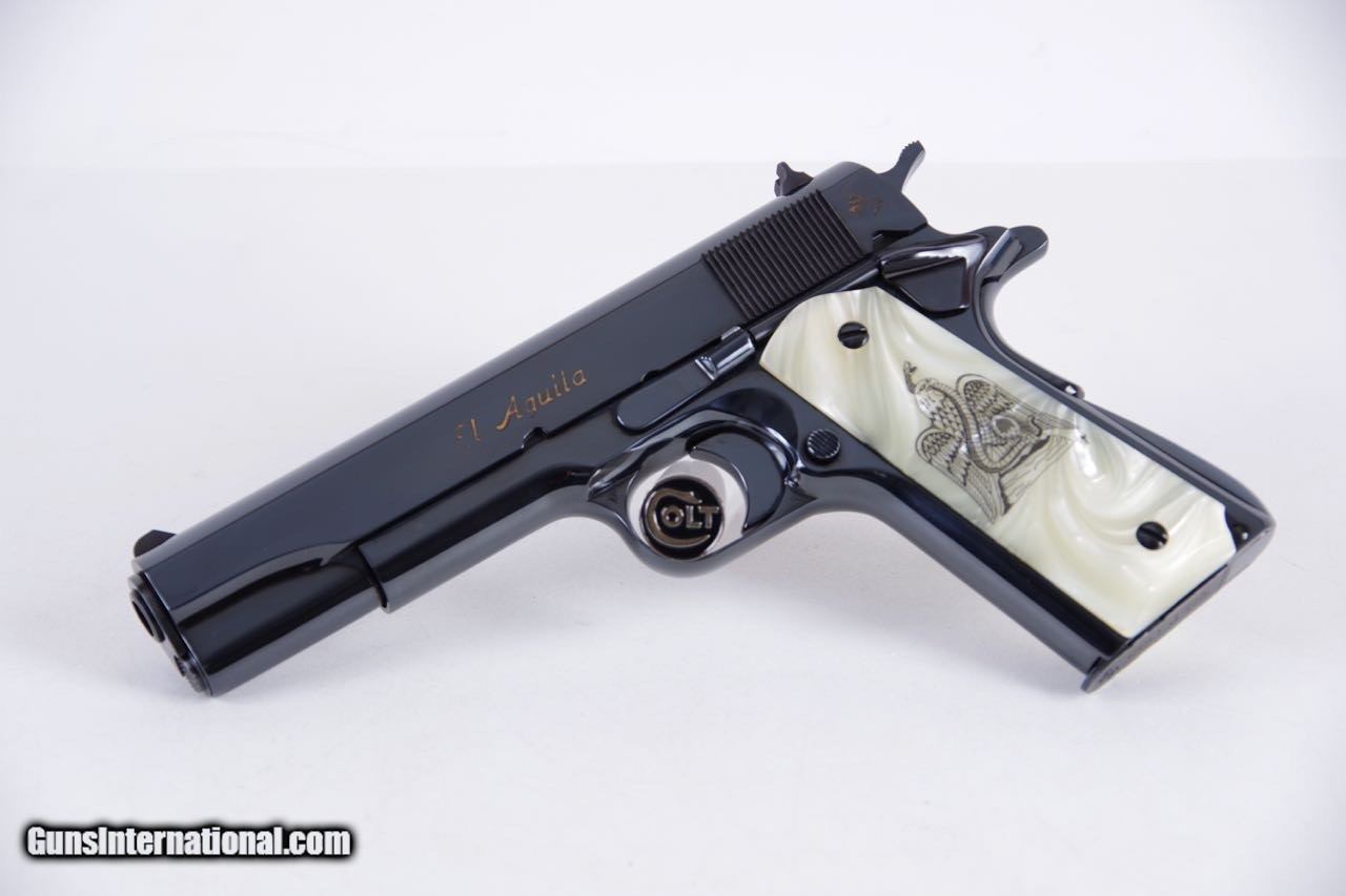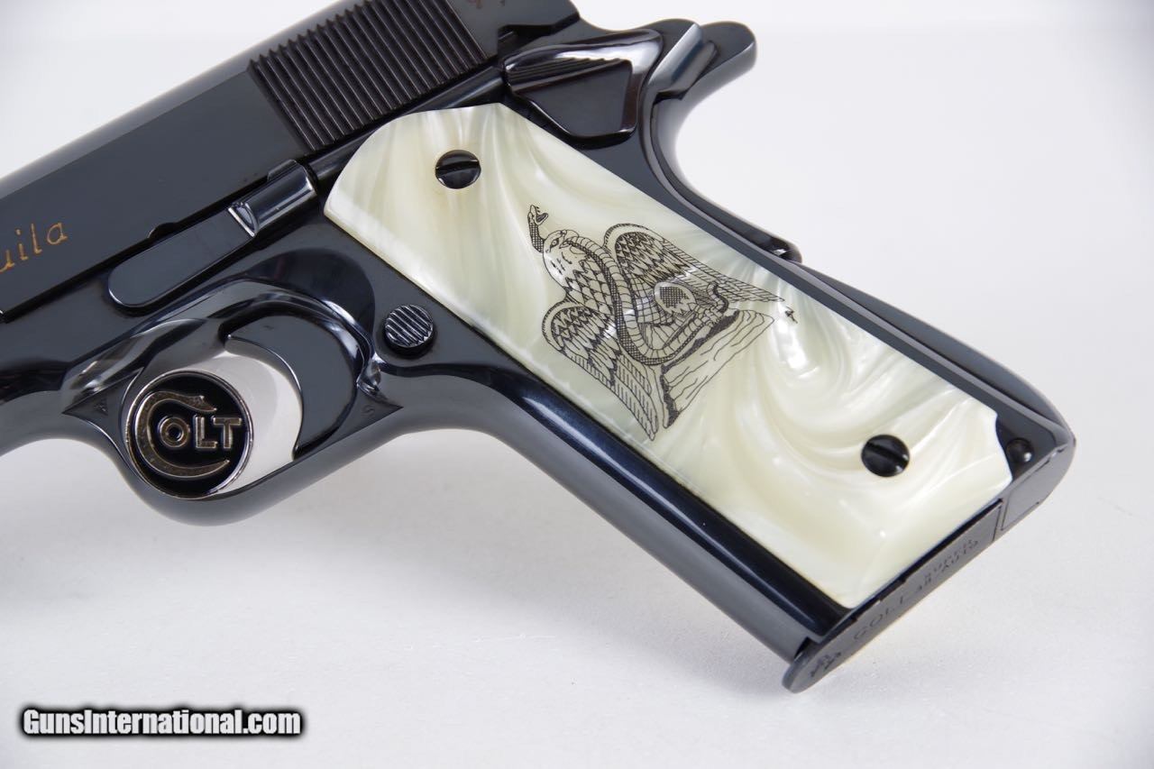 Description: Colt 38 Super El Aguila. This is a Lew Horton special edition that has a very low serial number of 3 out of only 350 made in 1999. We have several other #3s that have been together since new. These feature a full Royal Blue slide and frame with the Mexican Eagle scrimshawed into faux MOP grips. This pistol is new in the original box numbered to the gun with everything shown. The finish is exceptional throughout. You may see some light traces of oil on it as we only lightly wiped it down. Overall the finish rates 99%+. The factory grips are flawless. SOLD Manufacturer: Colt Model: Government Caliber Info: 38 Super |