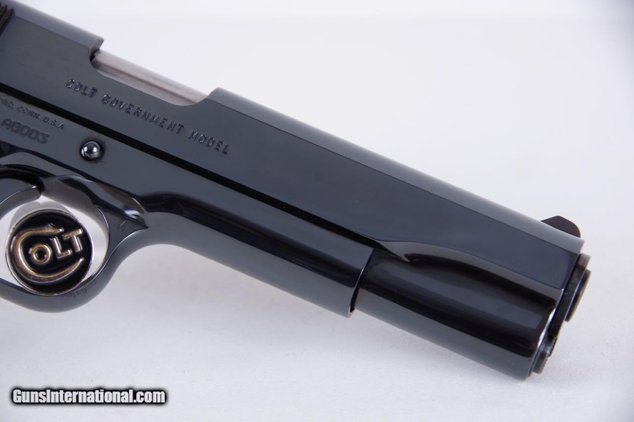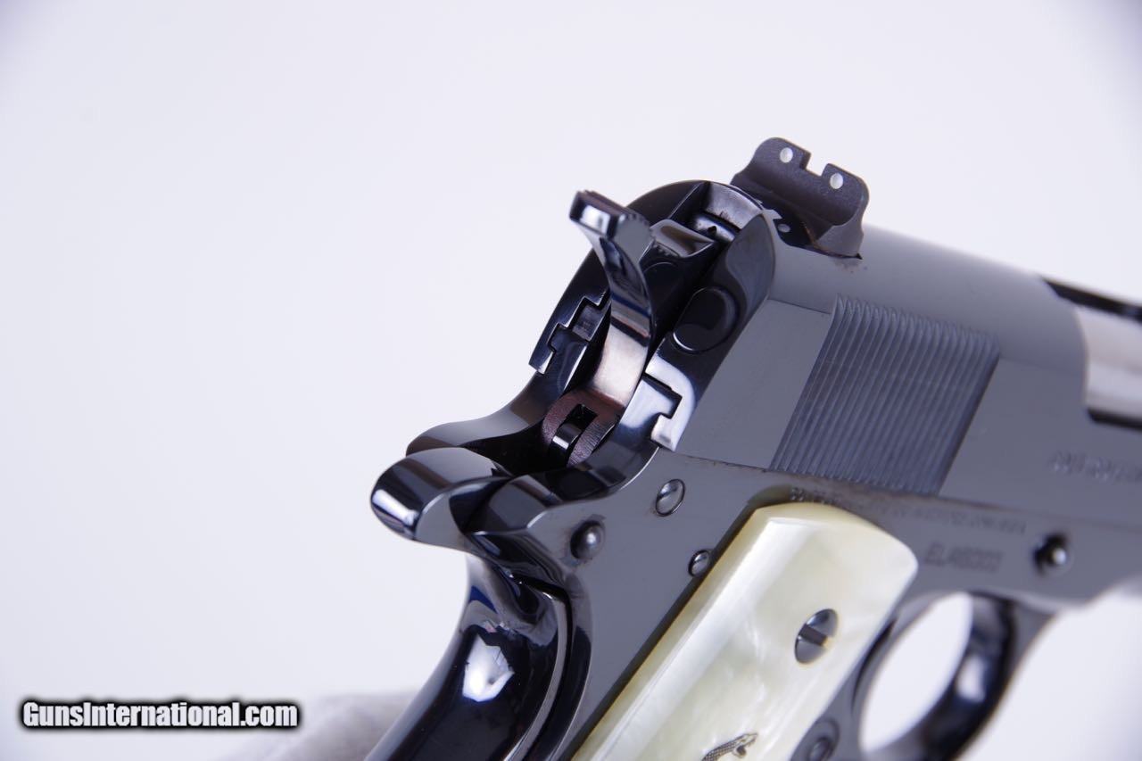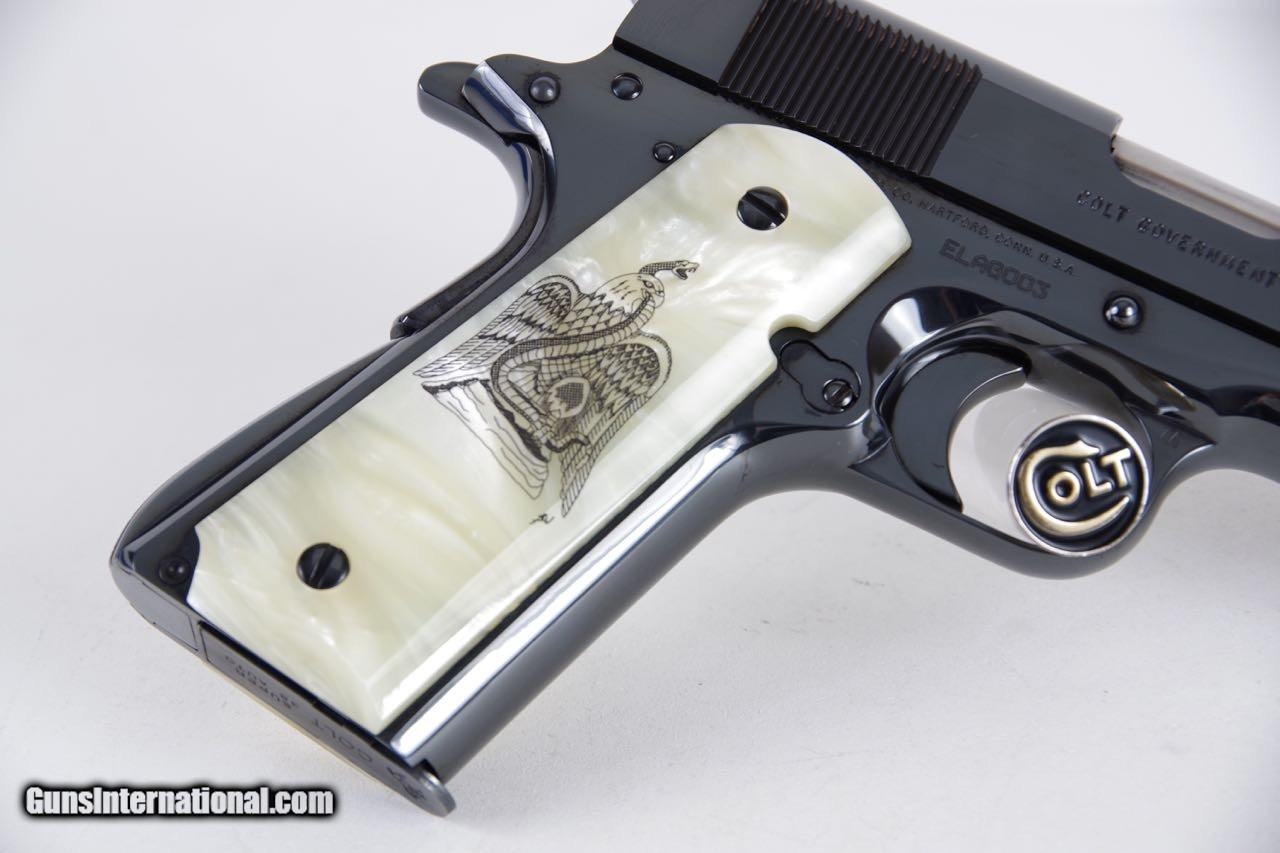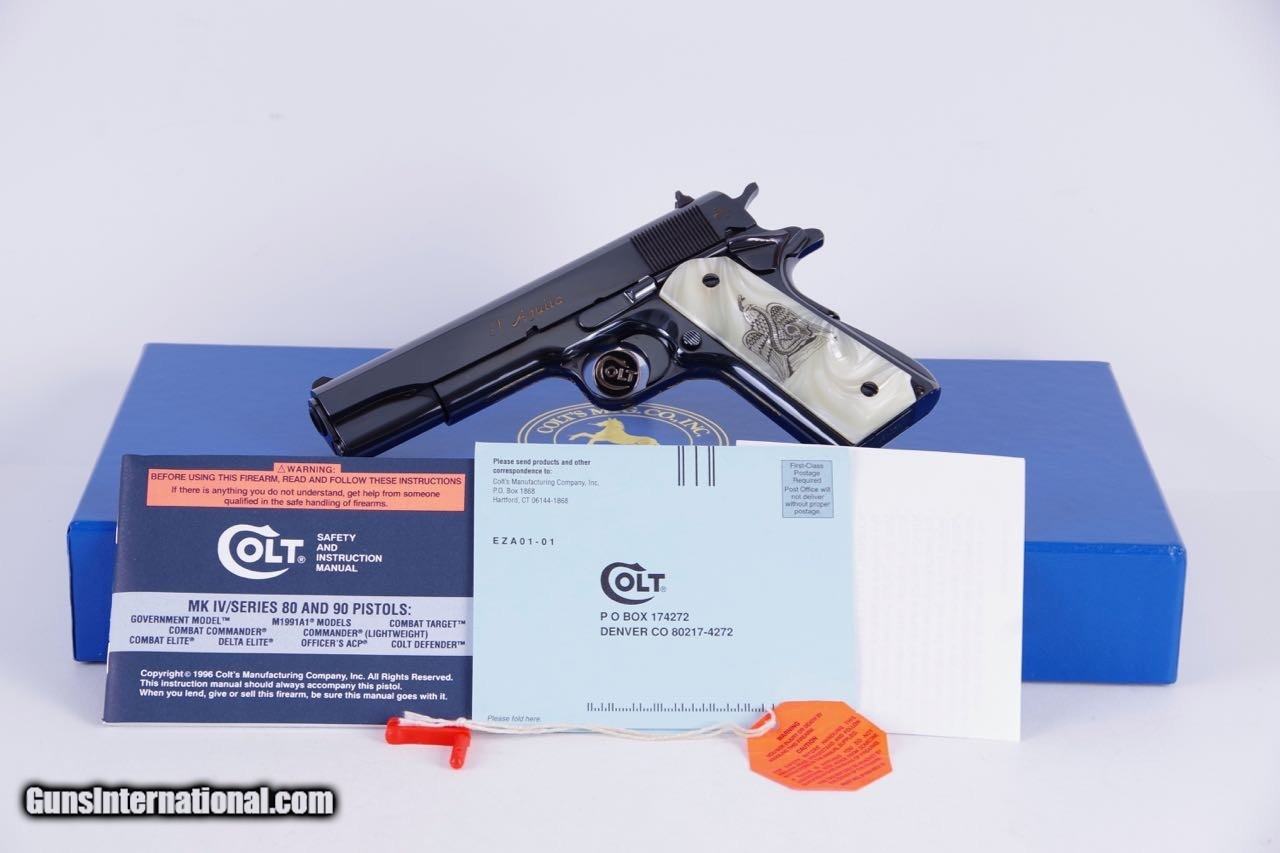 Description: Colt 38 Super El Aguila. This is a Lew Horton special edition that has a very low serial number of 3 out of only 350 made in 1999. We have several other #3s that have been together since new. These feature a full Royal Blue slide and frame with the Mexican Eagle scrimshawed into faux MOP grips. This pistol is new in the original box numbered to the gun with everything shown. The finish is exceptional throughout. You may see some light traces of oil on it as we only lightly wiped it down. Overall the finish rates 99%+. The factory grips are flawless. SOLD Manufacturer: Colt Model: Government Caliber Info: 38 Super |