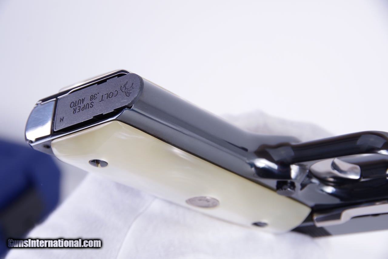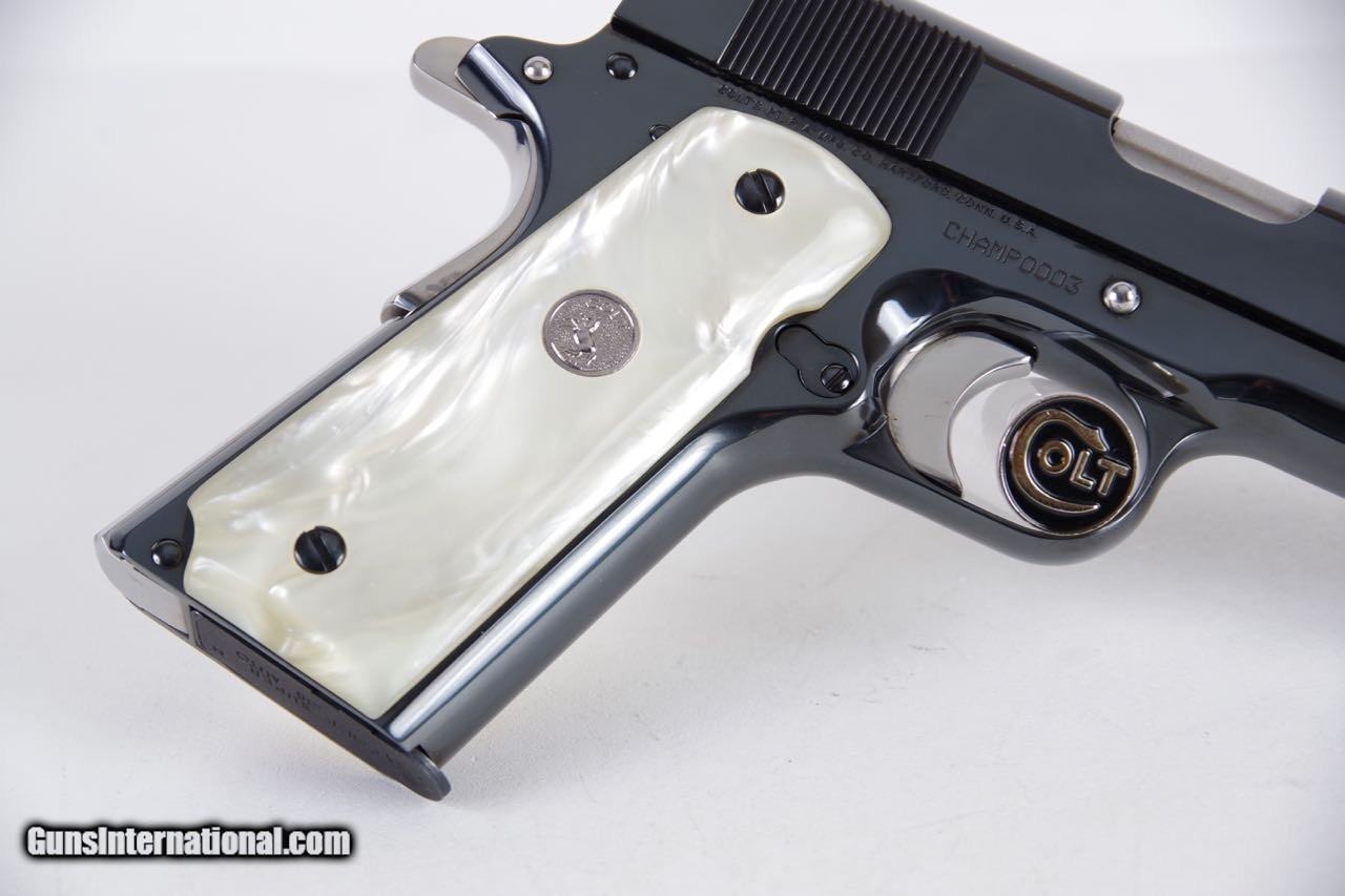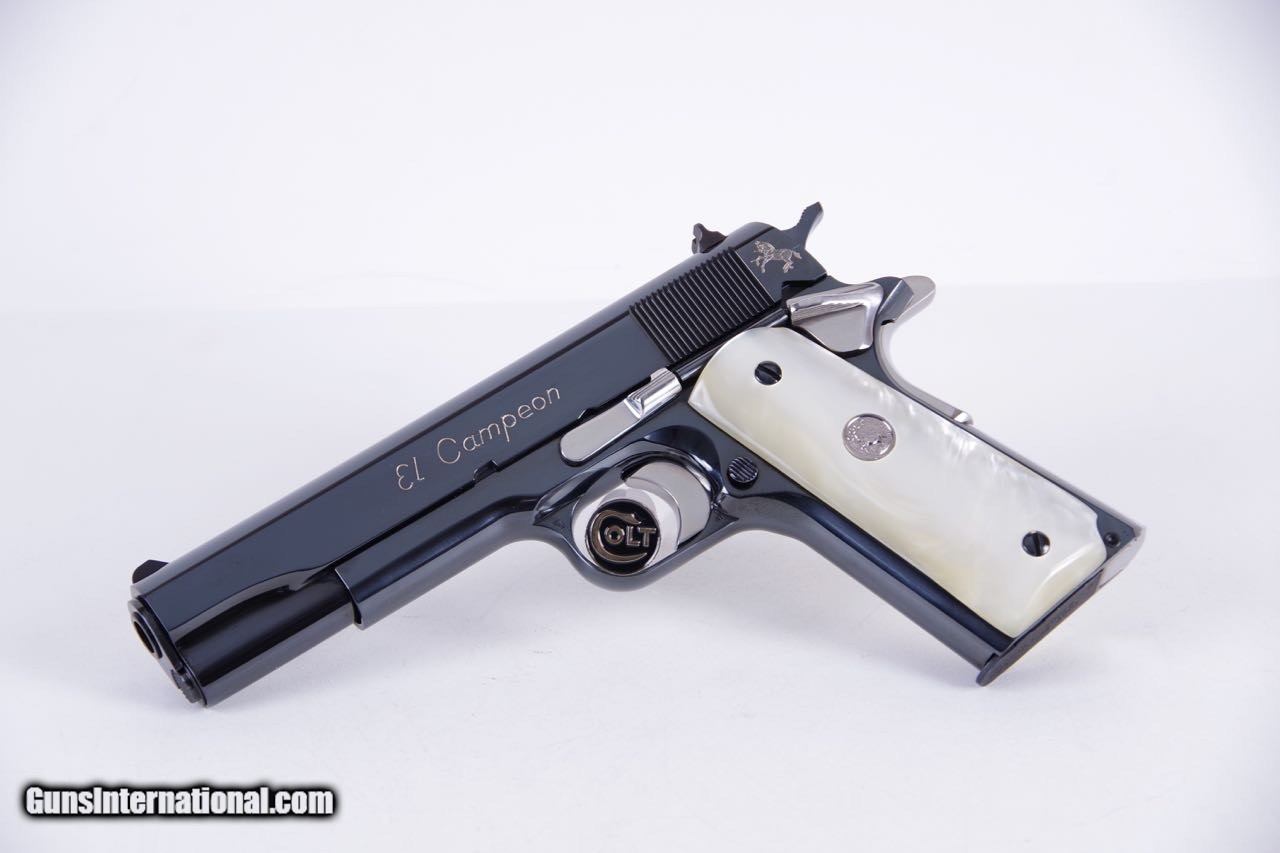 Description: Colt 38 Super El Campeon. This is a Lew Horton special edition with a very low serial number of 3 out of only 550 made in 1997. We have several other #3s that have been together since new. These feature a full Royal Blue slide and frame with a Rampant Colt at the left rear of the slide. The trigger, slide stop, thumb safety, grip safety, and mainspring housing are bright stainless. The grips are faux MOP. This pistol is new in the original box numbered to the gun with everything shown. The finish is exceptioal throughout. You may see a little oil in the photos as we only lightly wiped it down. Overall the finish rates 99%+. The factory grips are flawless. SOLD Manufacturer: colt Model: government Caliber Info: 38 Super |