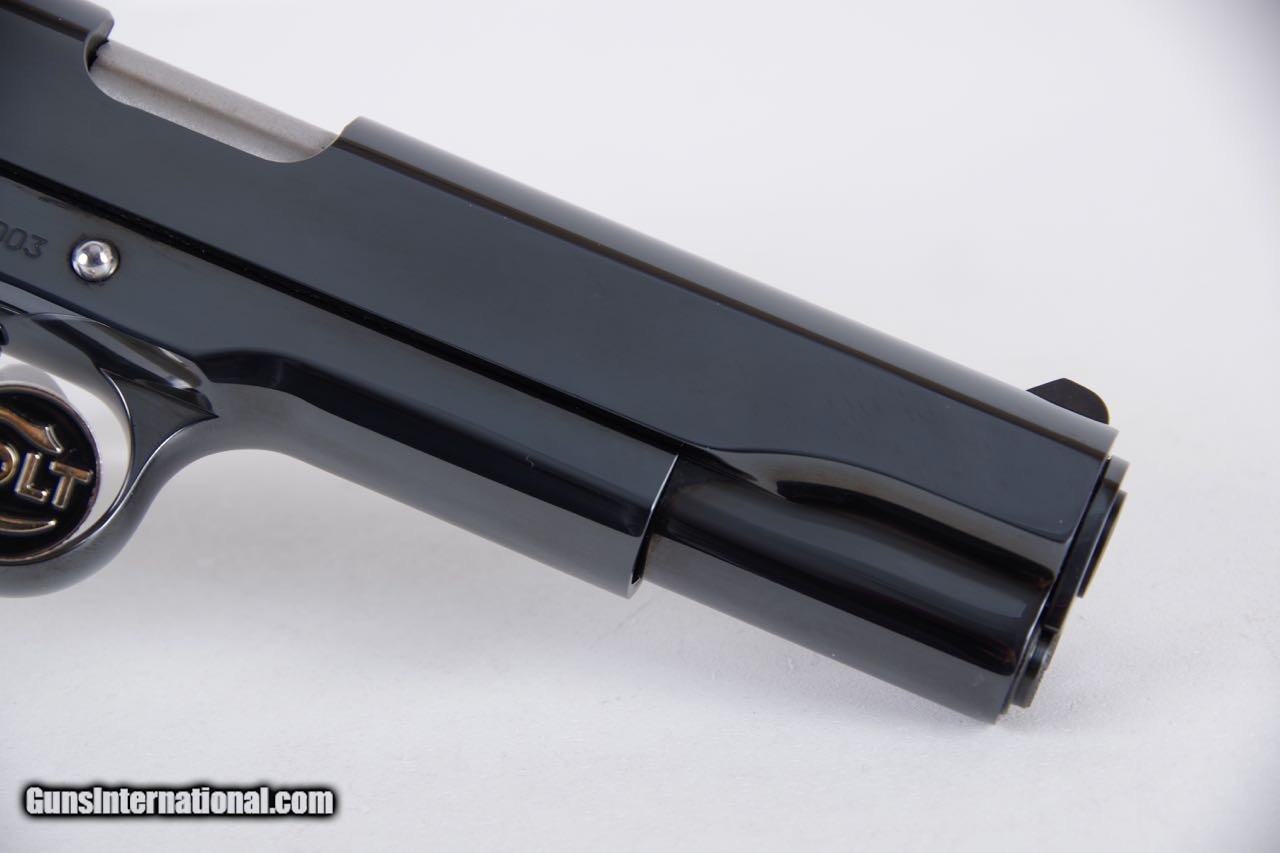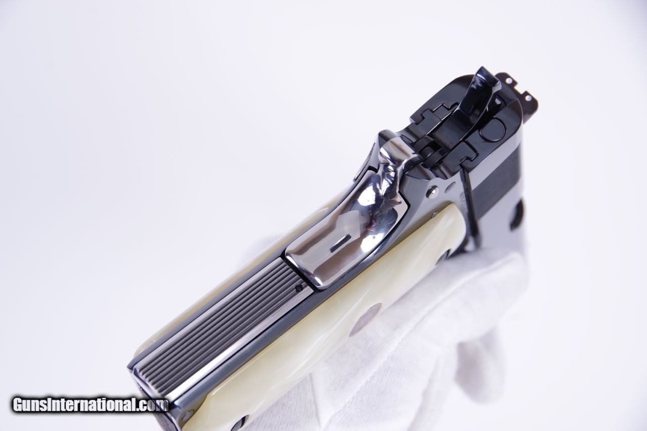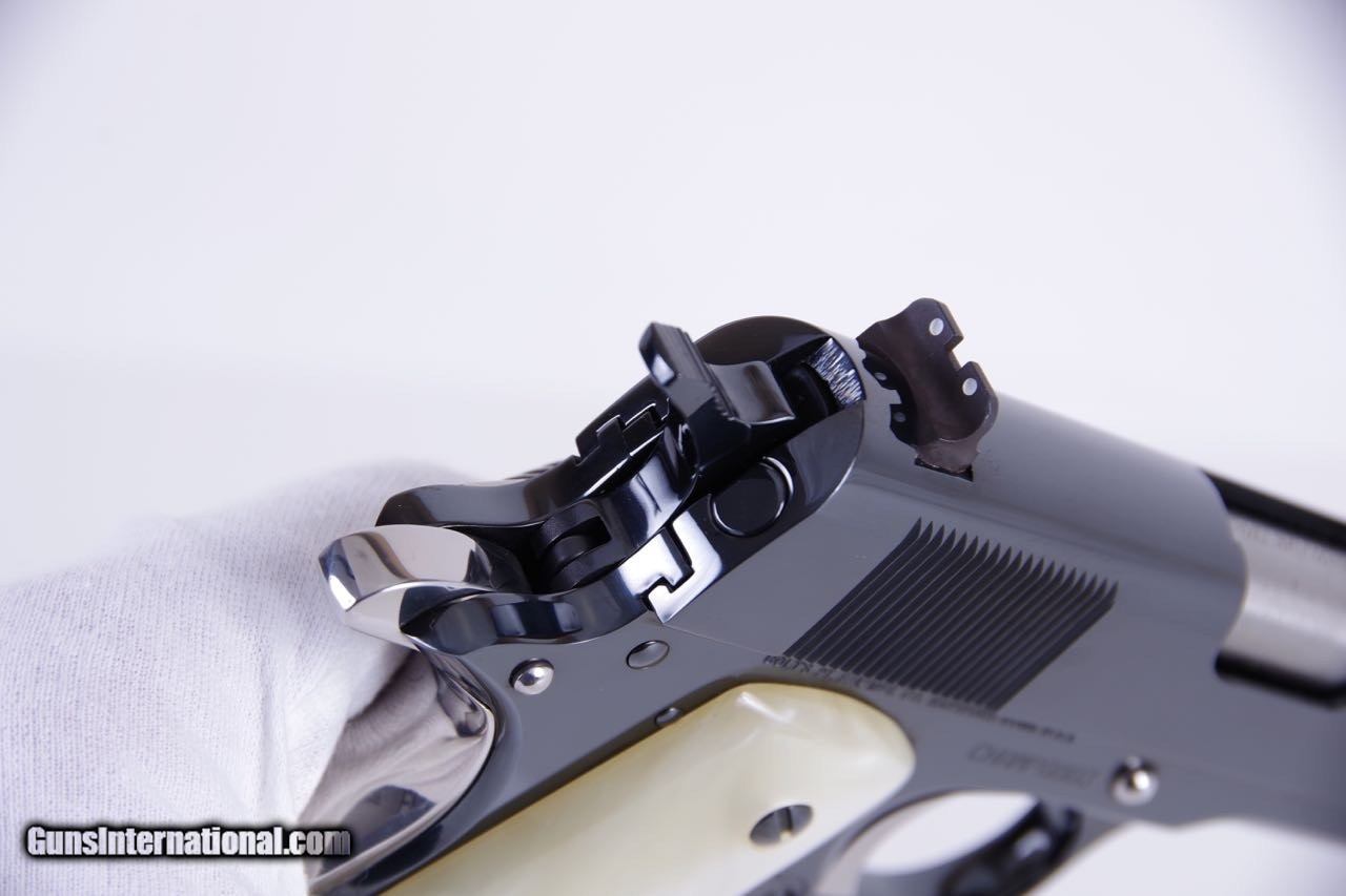 Description: Colt 38 Super El Campeon. This is a Lew Horton special edition with a very low serial number of 3 out of only 550 made in 1997. We have several other #3s that have been together since new. These feature a full Royal Blue slide and frame with a Rampant Colt at the left rear of the slide. The trigger, slide stop, thumb safety, grip safety, and mainspring housing are bright stainless. The grips are faux MOP. This pistol is new in the original box numbered to the gun with everything shown. The finish is exceptioal throughout. You may see a little oil in the photos as we only lightly wiped it down. Overall the finish rates 99%+. The factory grips are flawless. SOLD Manufacturer: colt Model: government Caliber Info: 38 Super |